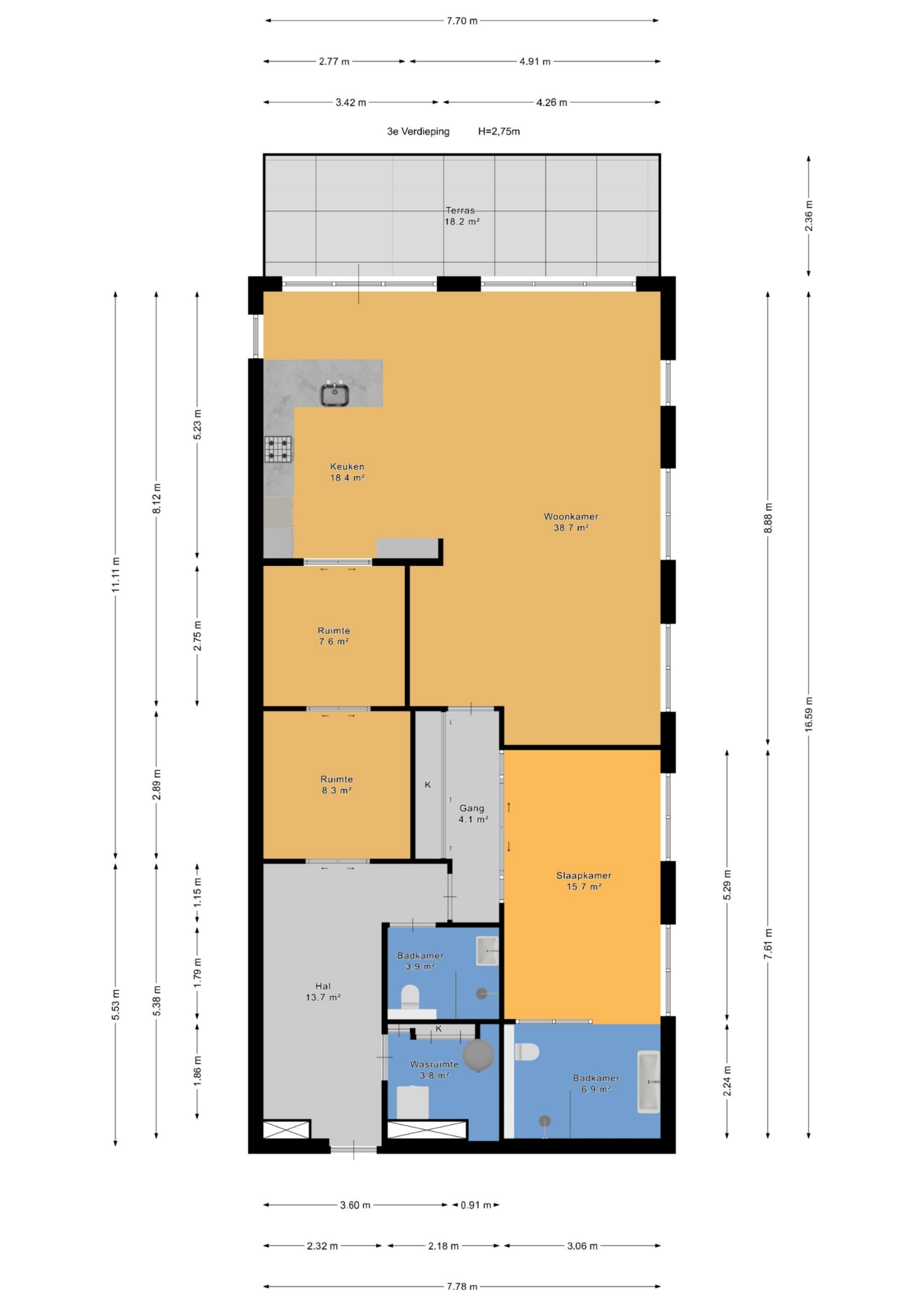 - Totaal aantal kamers 3