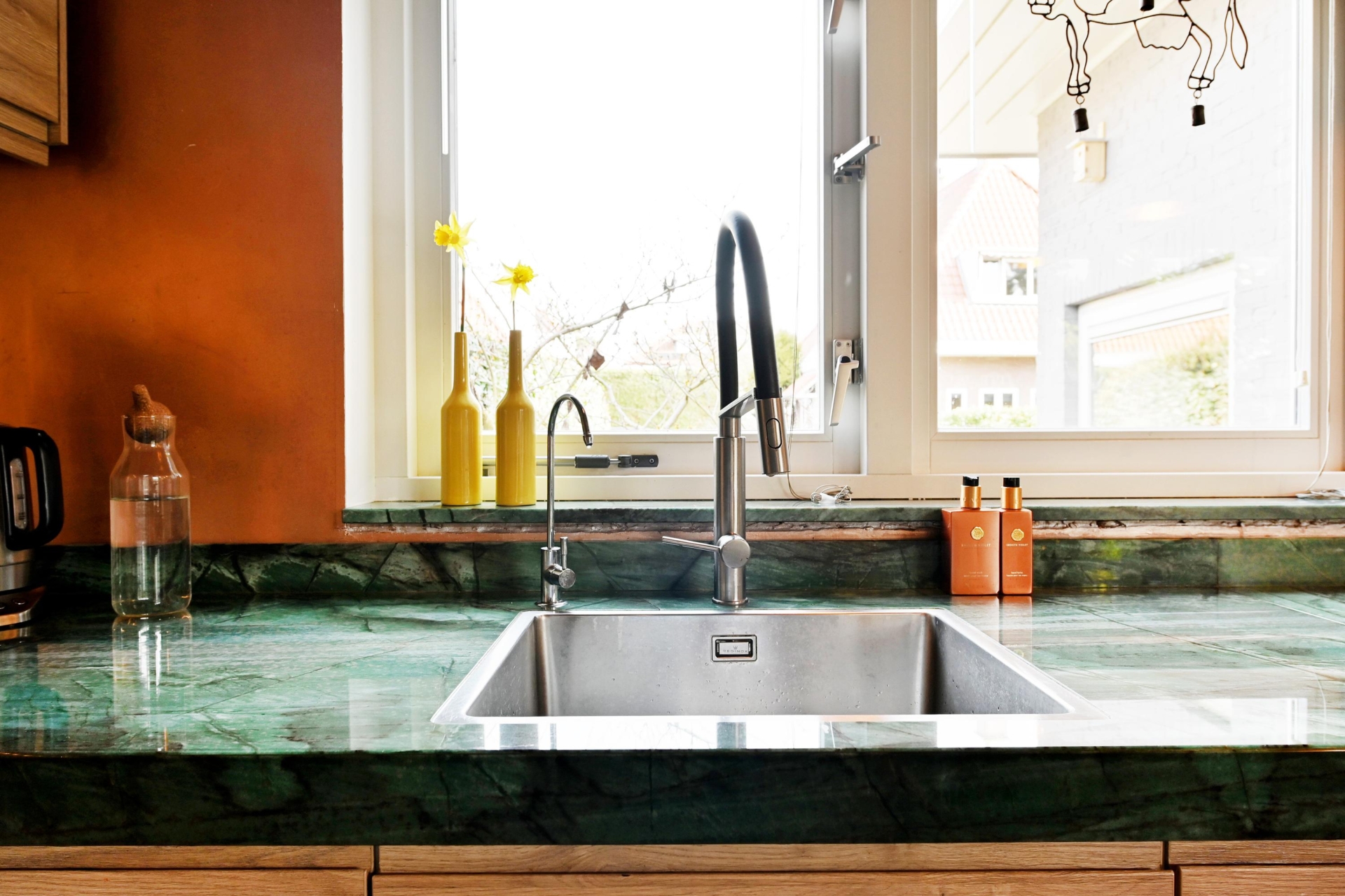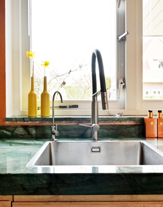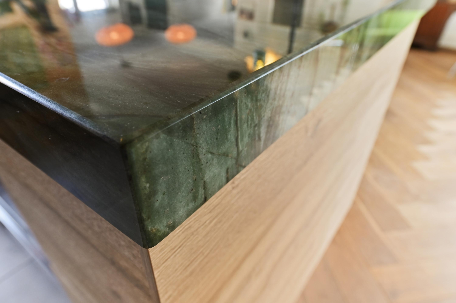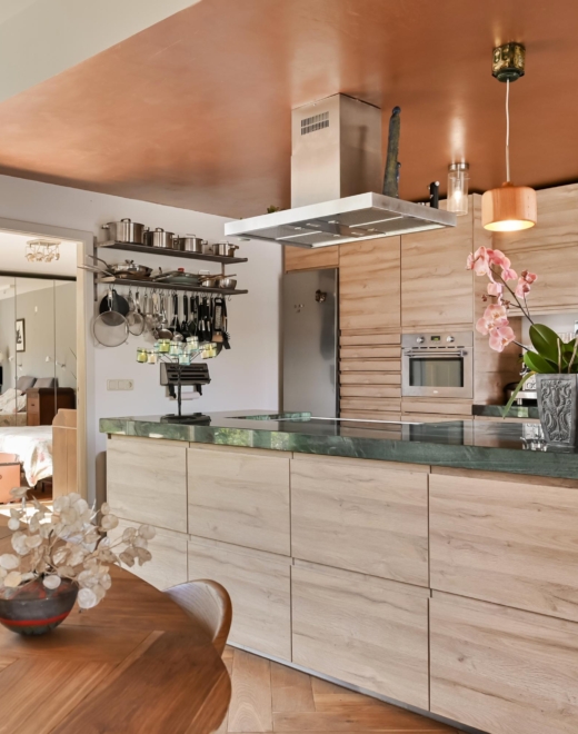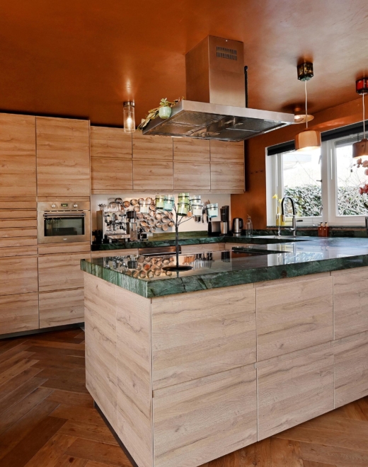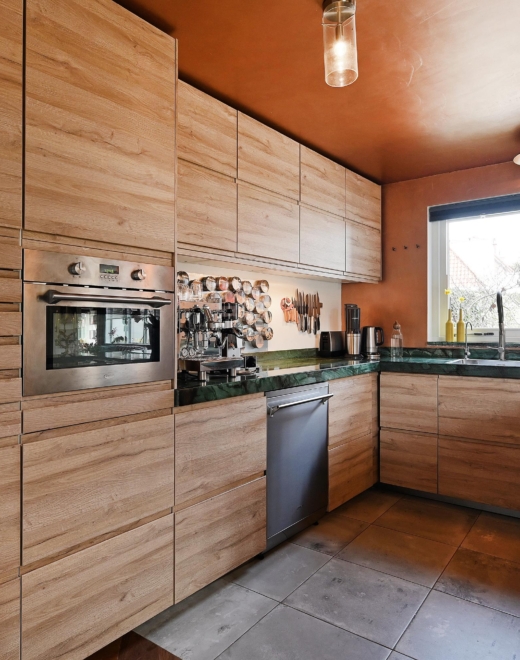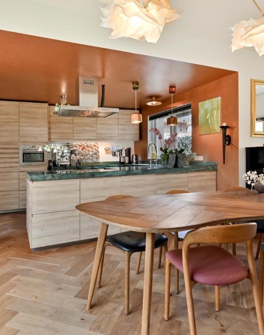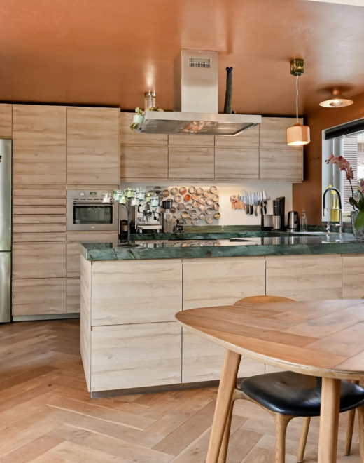 From the corridor, you enter the generous and light-filled L-shaped living room, finished with a beautiful oak herringbone floor. The spacious luxury open-plan kitchen forms a true centrepiece, highlighted by an elegant quartzite worktop (stain- and heat-resistant). The kitchen offers ample storage and accommodates a wide range cooker, fridge-freezer combination, additional combi-oven, dishwasher and a purified water system.