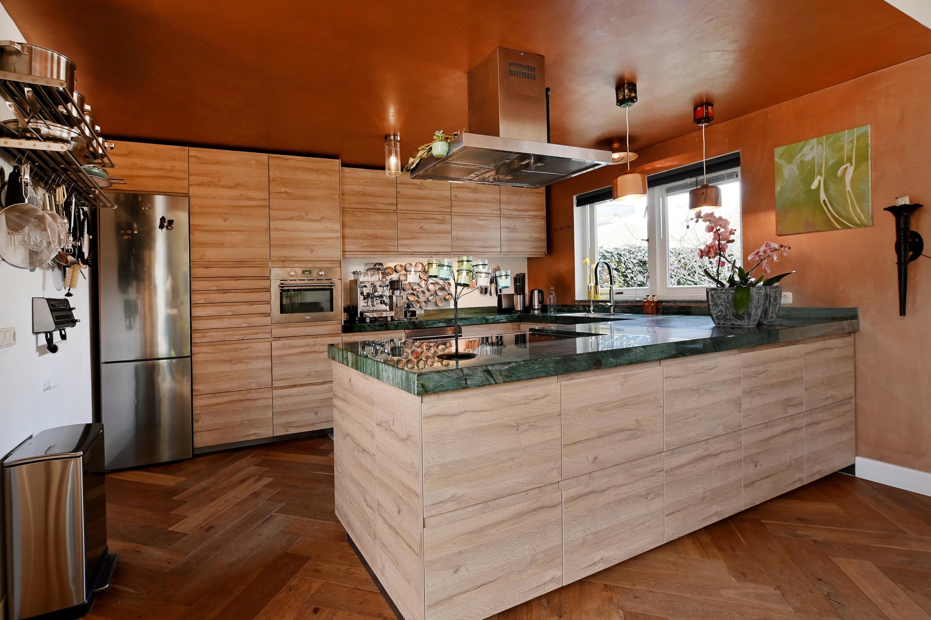 Vanuit de gang kom je in de riante lichte L-vormige woonkamer met prachtige eiken visgraat vloer en grote luxe open keuken met als eyecatcher een prachtig kwartsiet aanrechtblad (vlek- en hittebestendig). De keuken heeft onder andere veel kastruimte, een breed fornuis, een koel-/vriescombinatie, een extra combi-oven, een vaatwasser en een zuiver water installatie.