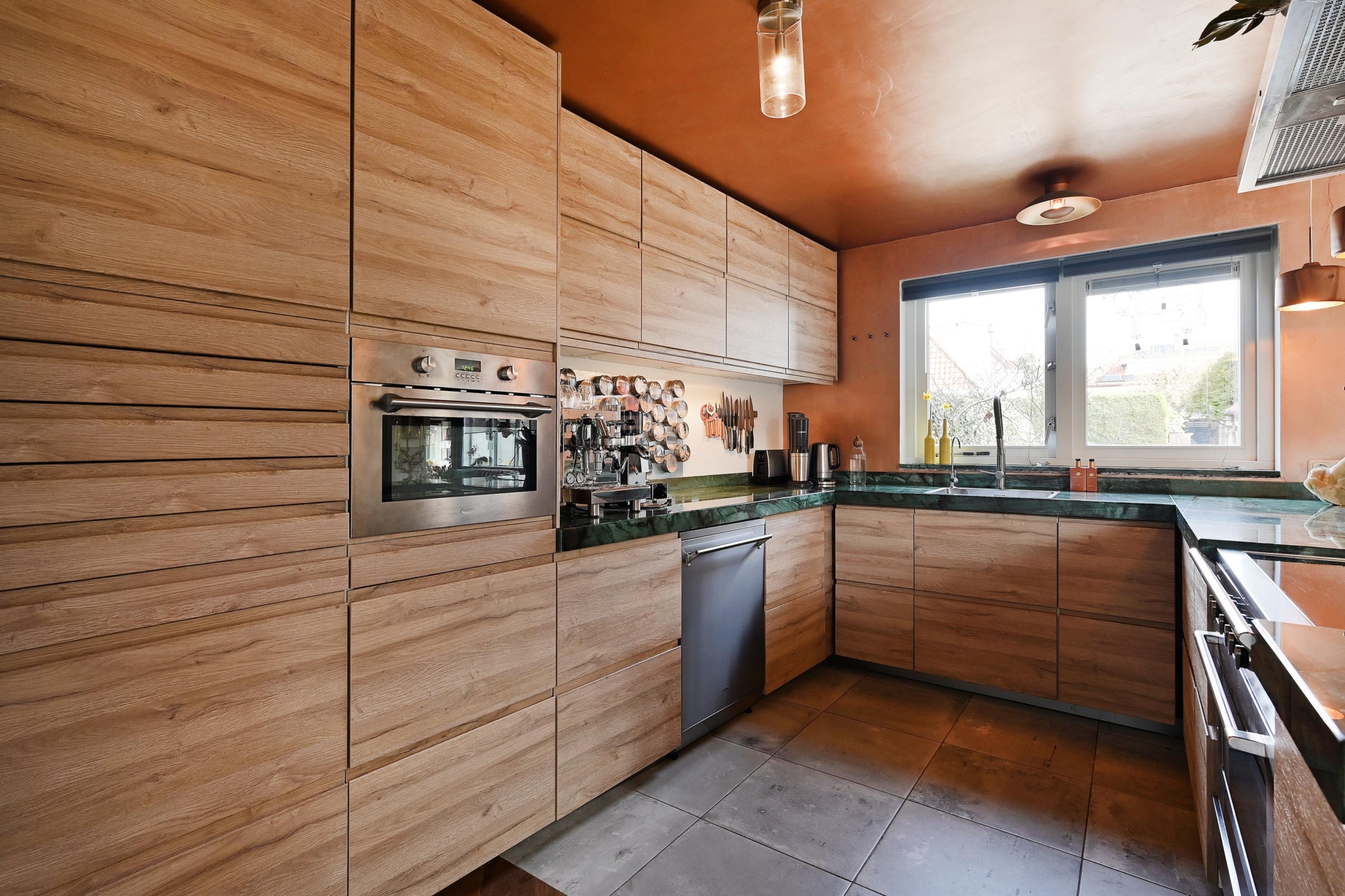To the left is the door to a spacious utility room, equipped with a sink, connections for a washing machine and dryer, provisions for additional kitchen appliances, a built-in cupboard housing the central heating installation, underfloor heating and an extensive electrical installation. From the utility room, a rear door provides access to the wide, nature-friendly south-west facing garden. The garden features a large shed with electricity and original garage doors, a covered area for bicycles and an outdoor kitchen with double sink beneath the canopy. The rear garden can also be accessed via the side garden, the living room and the converted garage, currently being used as a garden room/additional bedroom.