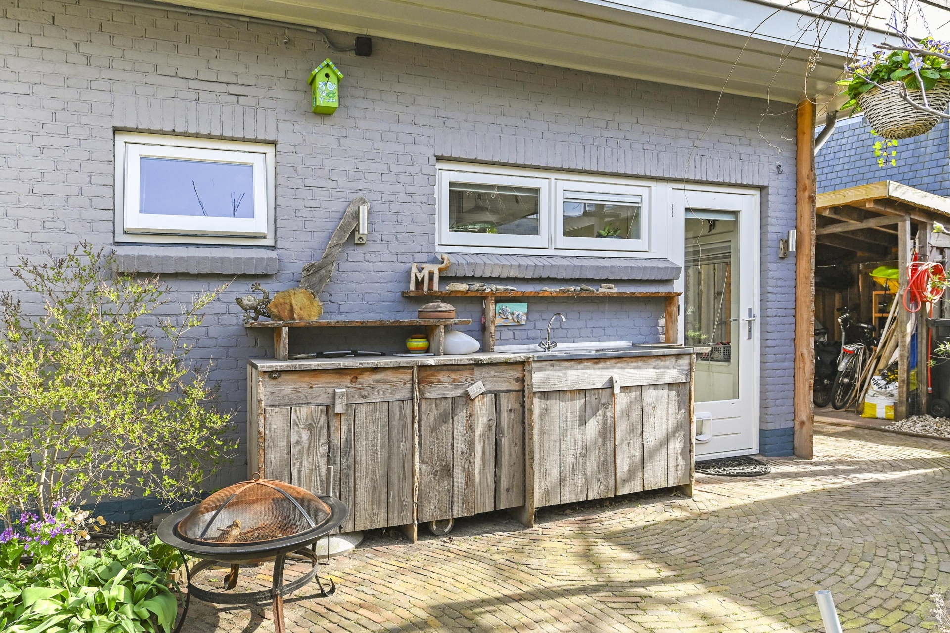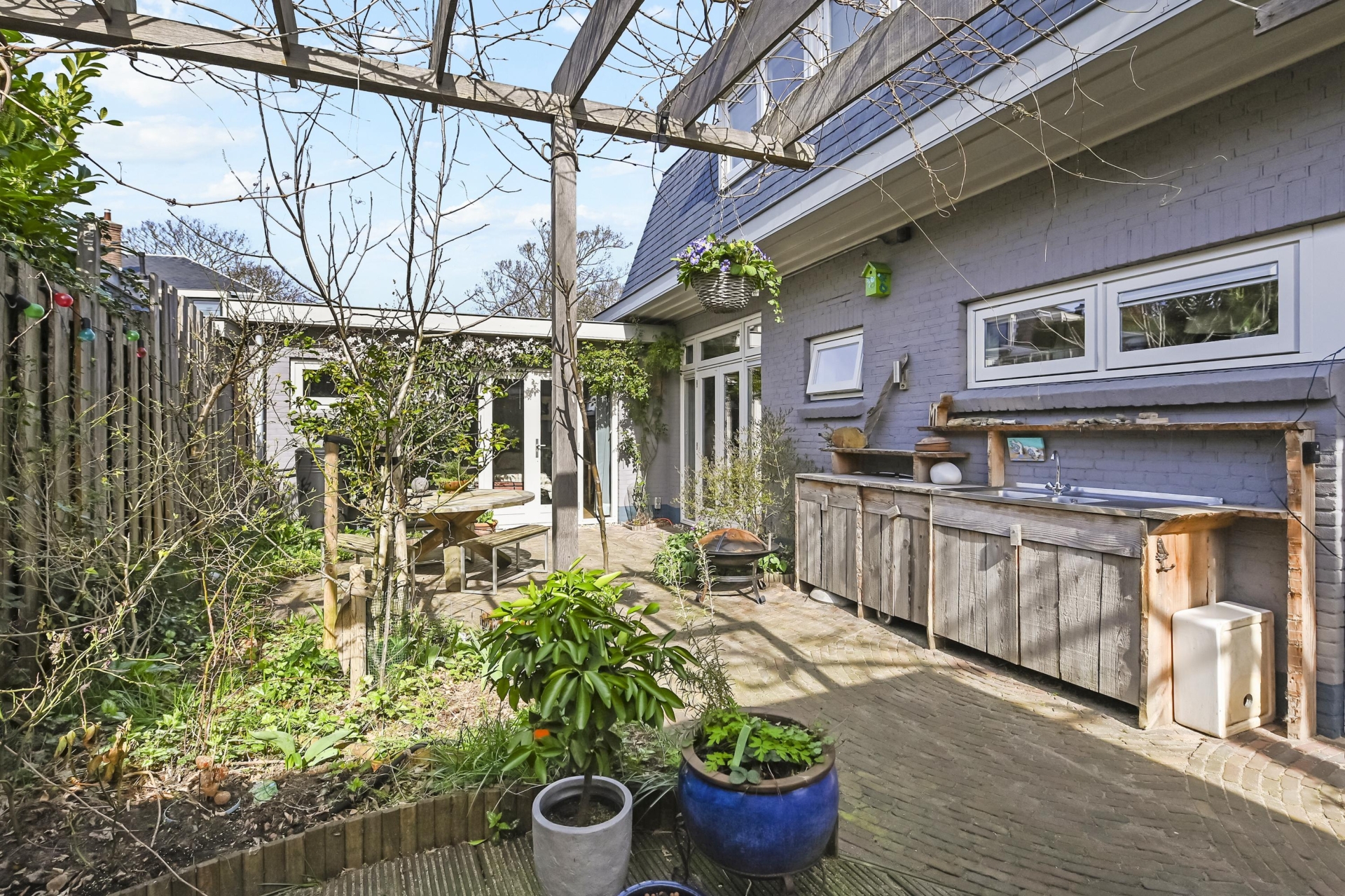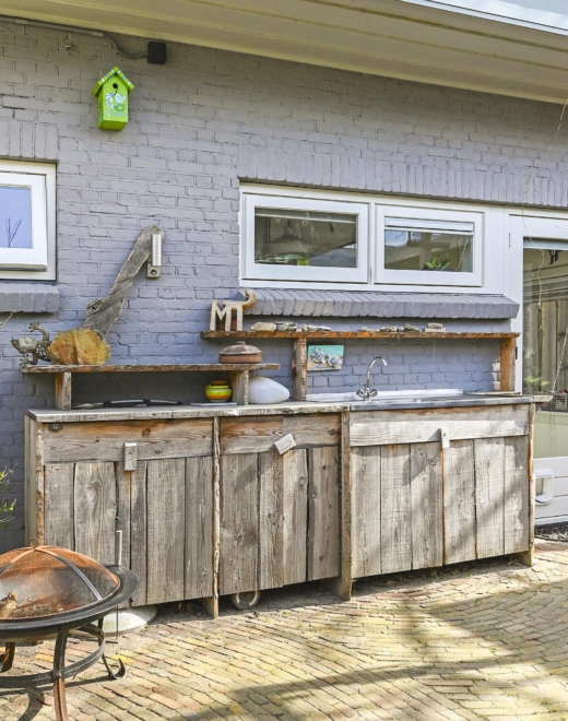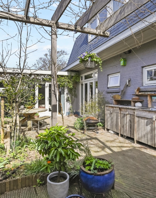 Links is de deur naar de ruime bijkeuken met spoelbak, aansluitingen voor wasmachine- en droger, aansluitingen voor extra keukenapparatuur, inbouwkast met cv-ketel, vloerverwarming en meterkast met uitgebreide elektra. Vanuit de bijkeuken heb je via de achterdeur toegang tot de brede natuurvriendelijke tuin op het zuidwesten. Hier staan een grote schuur met elektra en originele garagedeuren, een overkapping voor fietsen en een buitenkeuken met dubbele spoelbak onder het overstek. De achtertuin is te bereiken via de zijtuin, vanuit de woonkamer en vanuit de omgebouwde garage, nu in gebruik als tuinkamer/extra slaapkamer.