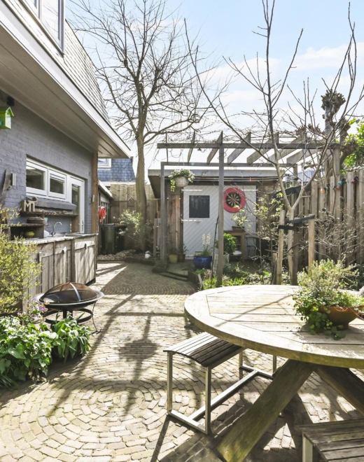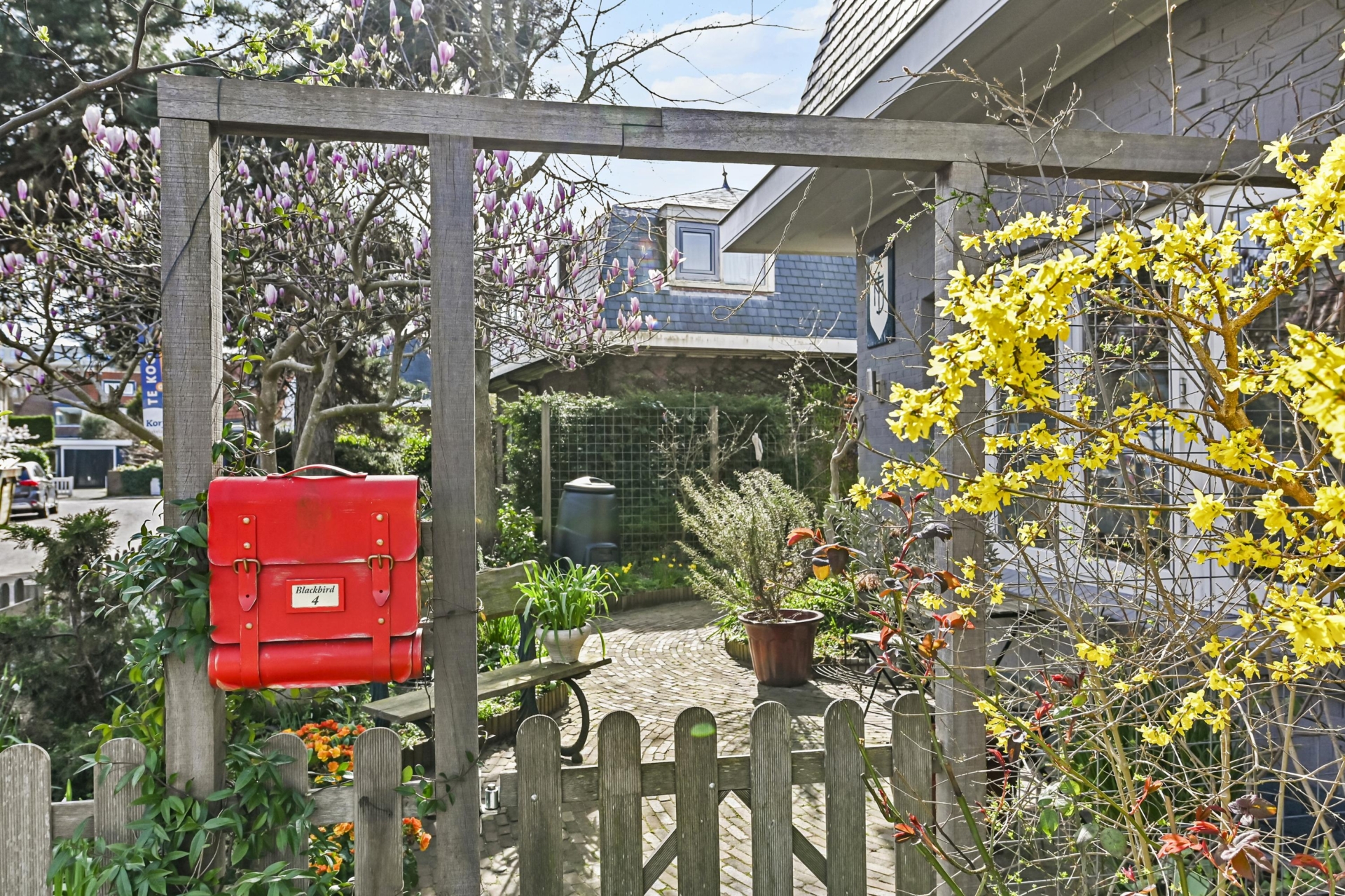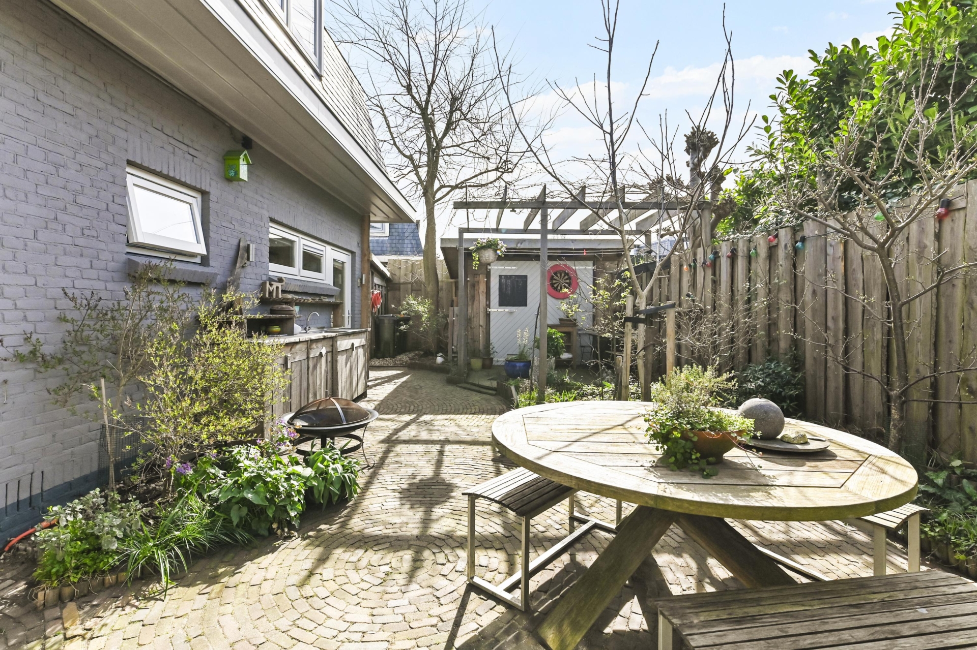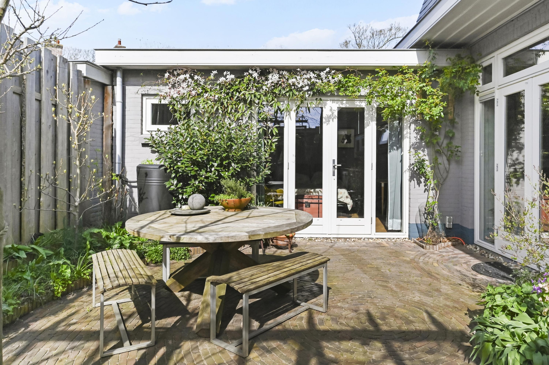 Links is de deur naar de ruime bijkeuken met spoelbak, aansluitingen voor wasmachine- en droger, aansluitingen voor extra keukenapparatuur, inbouwkast met cv-ketel, vloerverwarming en meterkast met uitgebreide elektra. Vanuit de bijkeuken heb je via de achterdeur toegang tot de brede natuurvriendelijke tuin op het zuidwesten. Hier staan een grote schuur met elektra en originele garagedeuren, een overkapping voor fietsen en een buitenkeuken met dubbele spoelbak onder het overstek. De achtertuin is te bereiken via de zijtuin, vanuit de woonkamer en vanuit de omgebouwde garage, nu in gebruik als tuinkamer/extra slaapkamer.