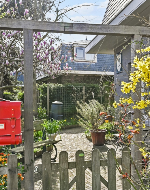 At the front of the house is the inviting sitting area with a rounded soapstone wood-burning stove. From the dining area, French doors open into the garden. The kitchen area provides access to an additional, exceptionally sunny garden (bed)room, also featuring French doors to the garden and a toilet/shower combination with a fixed walnut vanity unit.