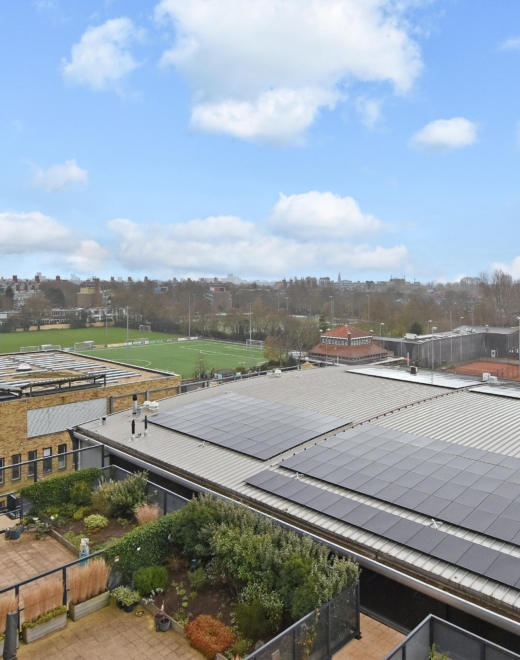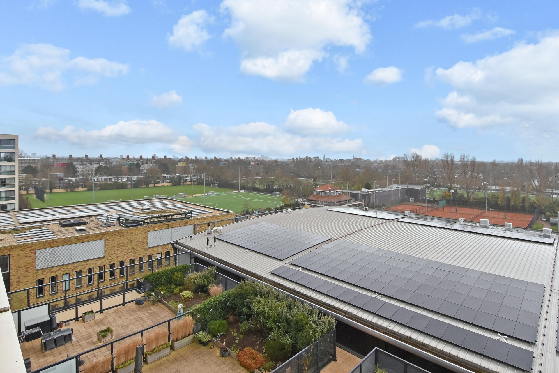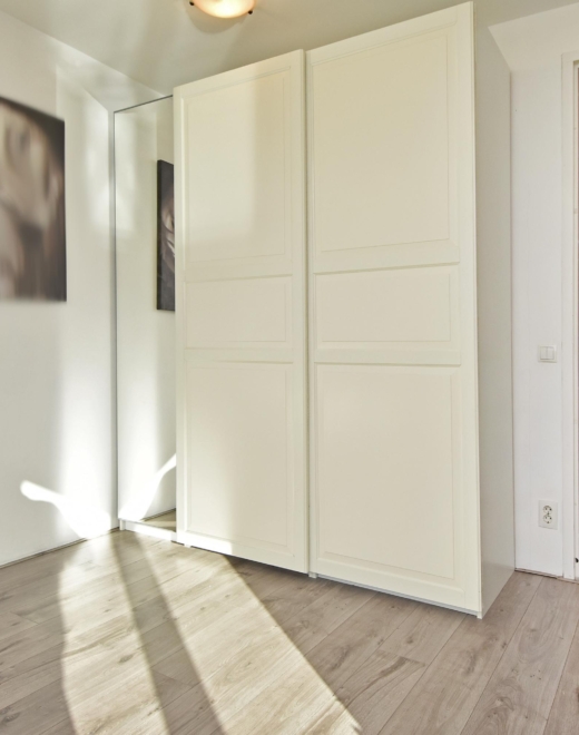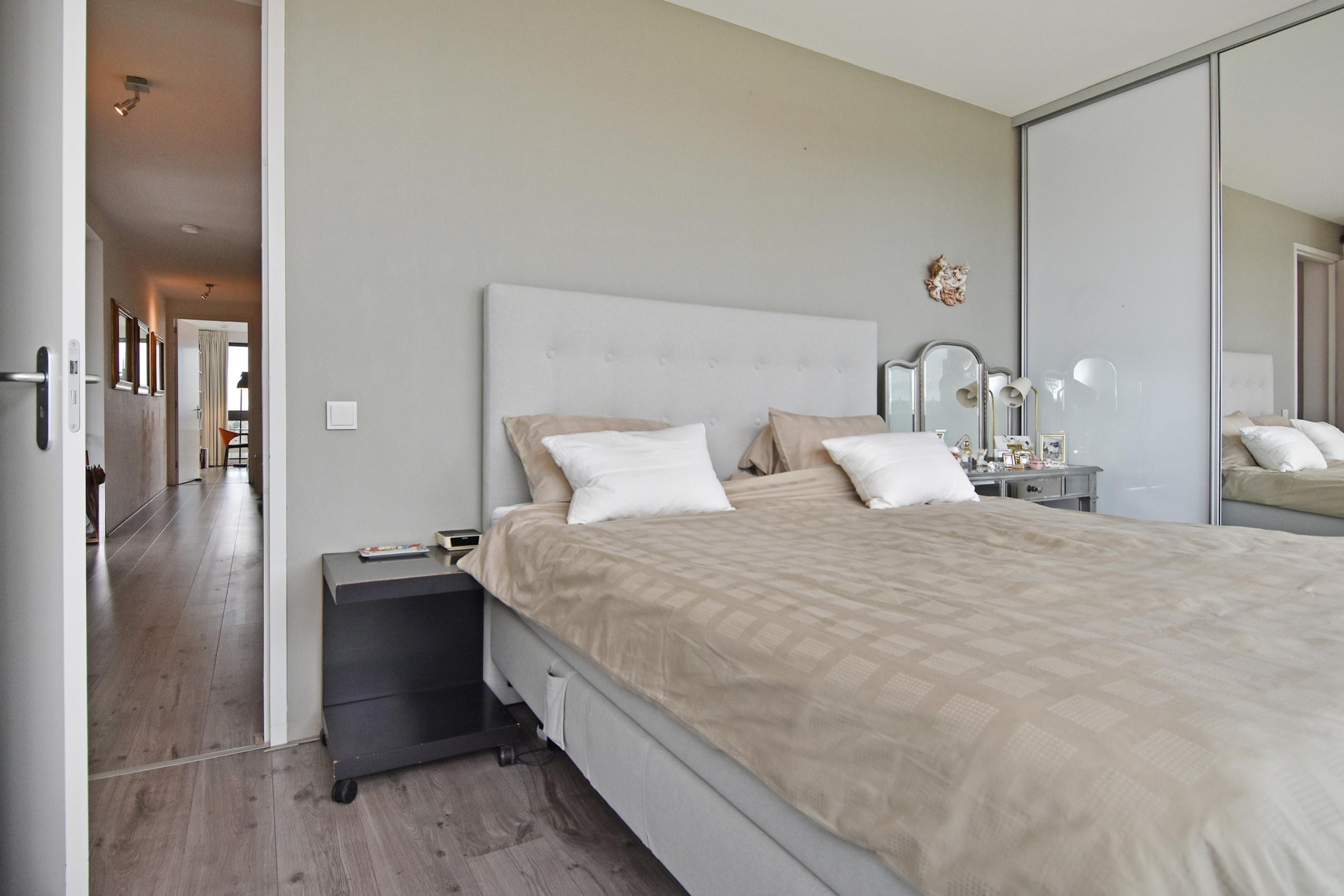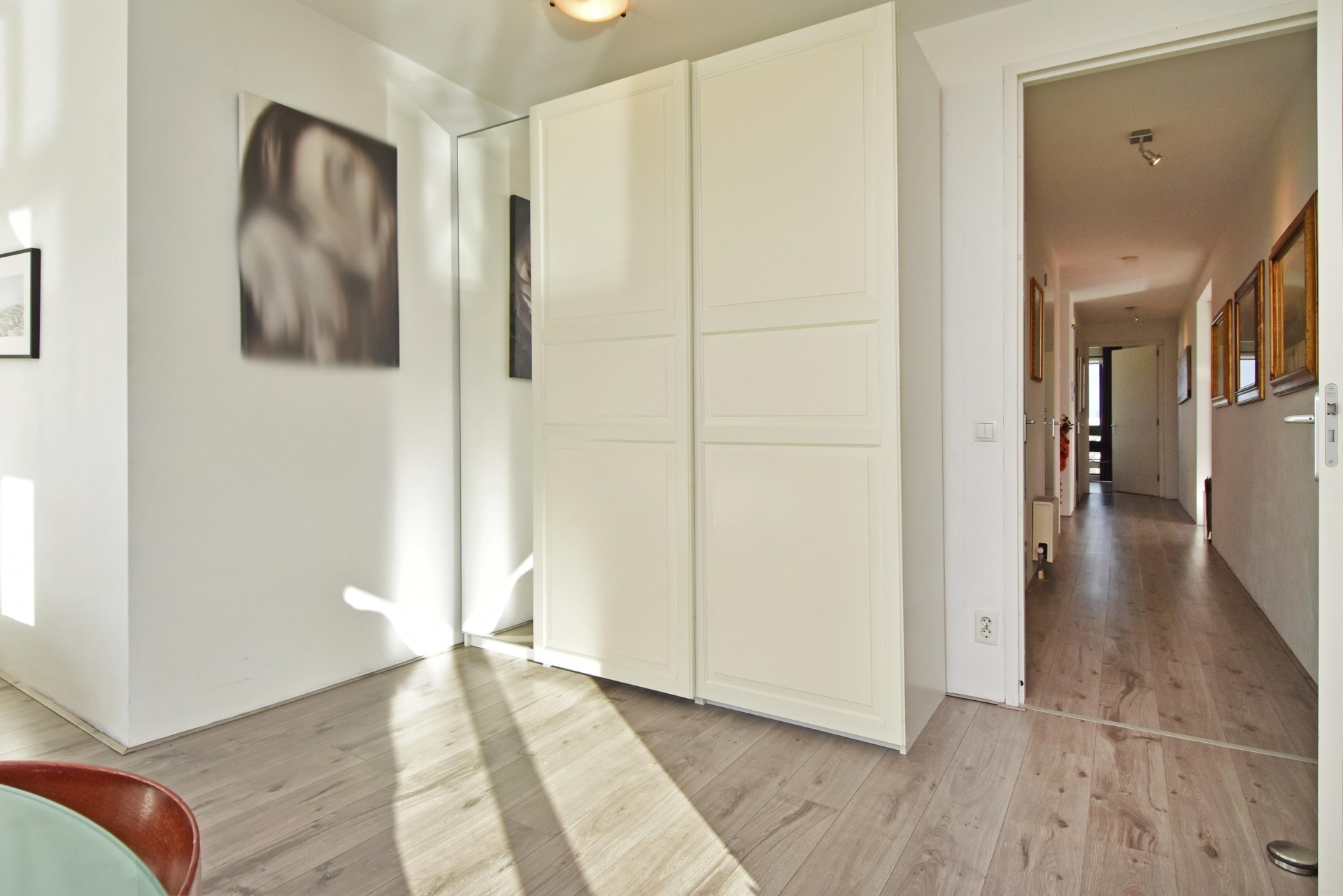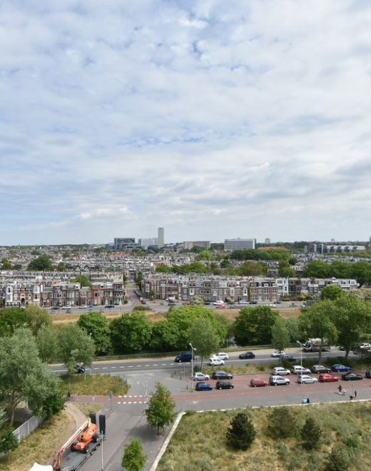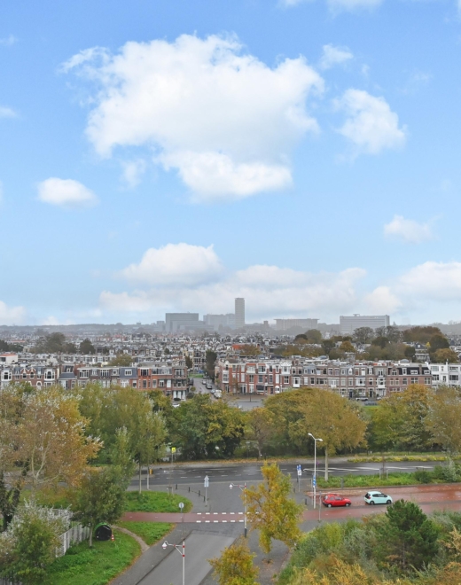 The large L-shaped master bedroom at the rear has direct access to the terrace. The second bedroom at the front features practical built-in wardrobes and offers expansive views of the Statenkwartier, the Peace Palace, and The Hague skyline.