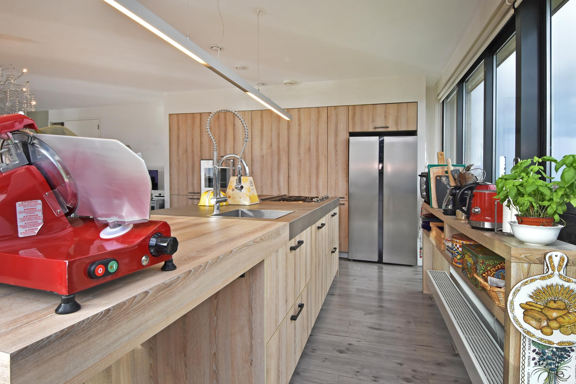 De royale living heeft aan drie zijden ramen, wat zorgt voor een prachtige lichtinval gedurende de dag. De riante luxe open keuken met kookeiland is echt een eye-catcher en is voorzien van luxe apparatuur waaronder o.a. een grote oven (Gaggenau), grote gaskookplaat incl. wokbrander (Smeg) met geïntegreerde afzuiging welke in het werkblad is verzonken, een riante koelkast-/vriezercombinatie en vaatwasser (Miele). De doorlopende luxe laminaatvloer in de gehele woning en de neutrale afwerking geven de ruimte een moderne en warme uitstraling.