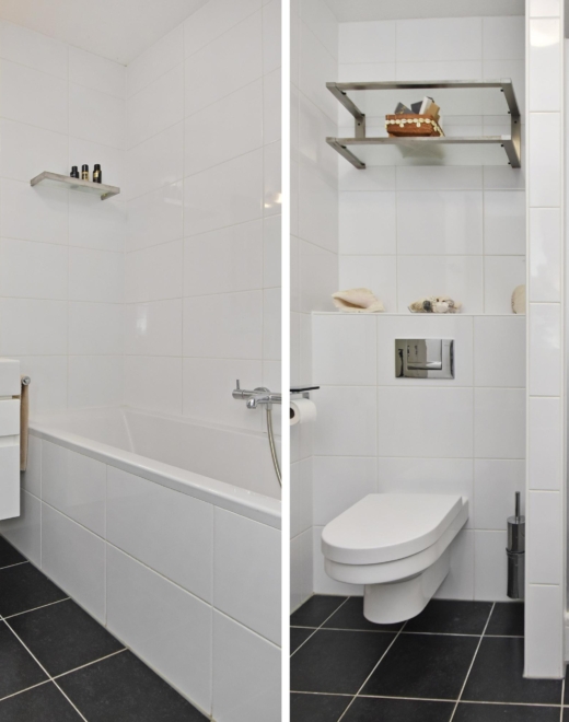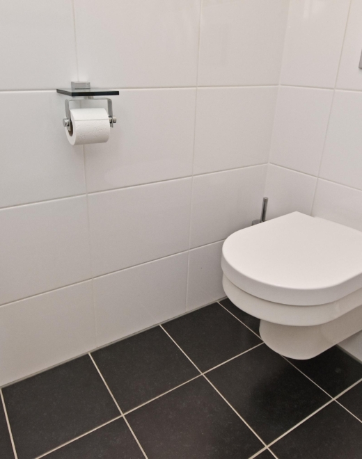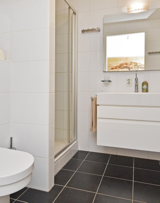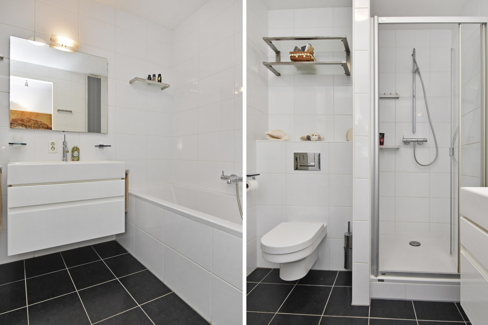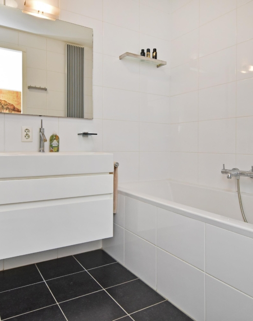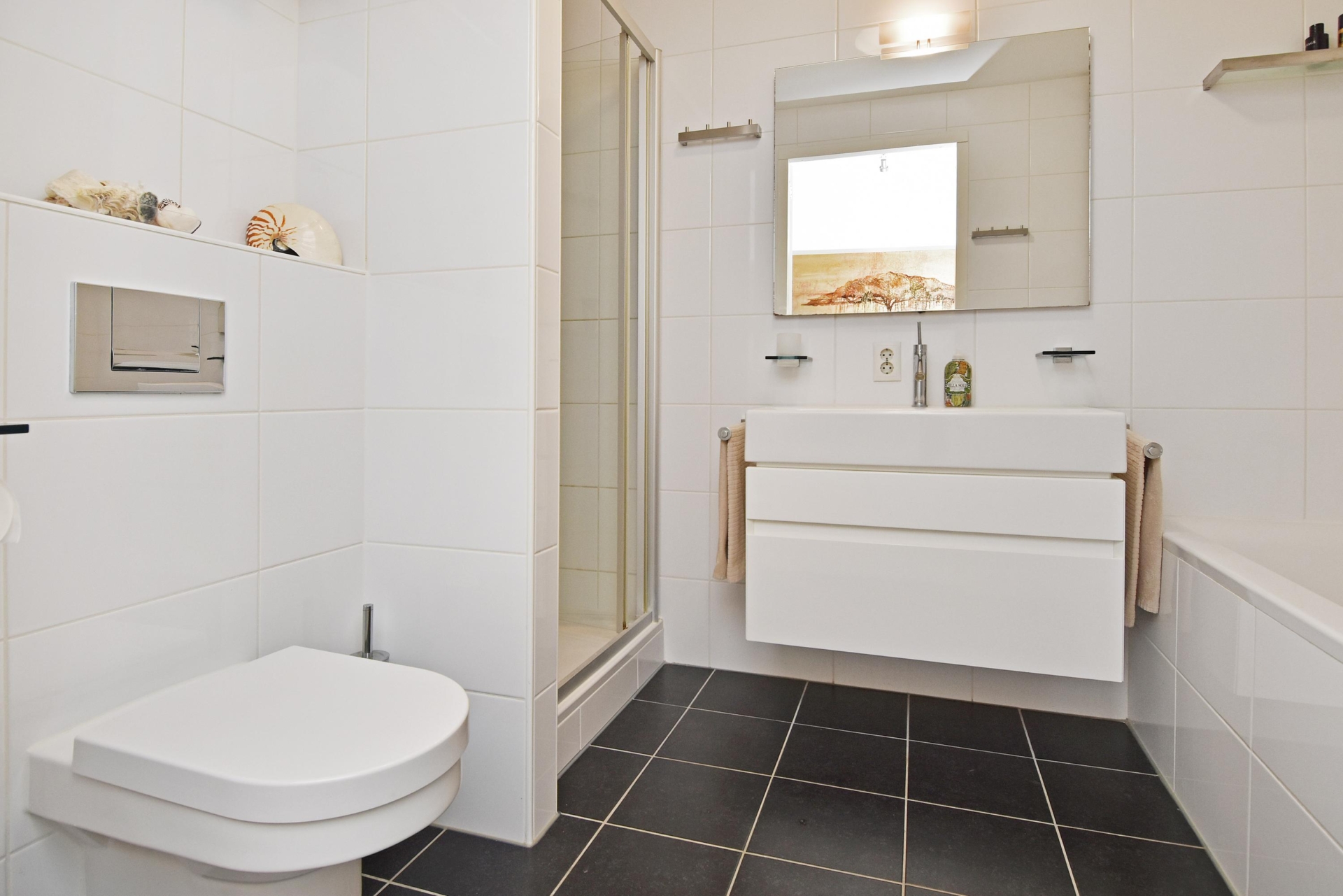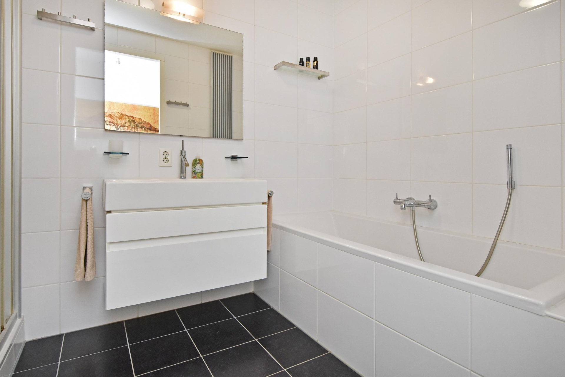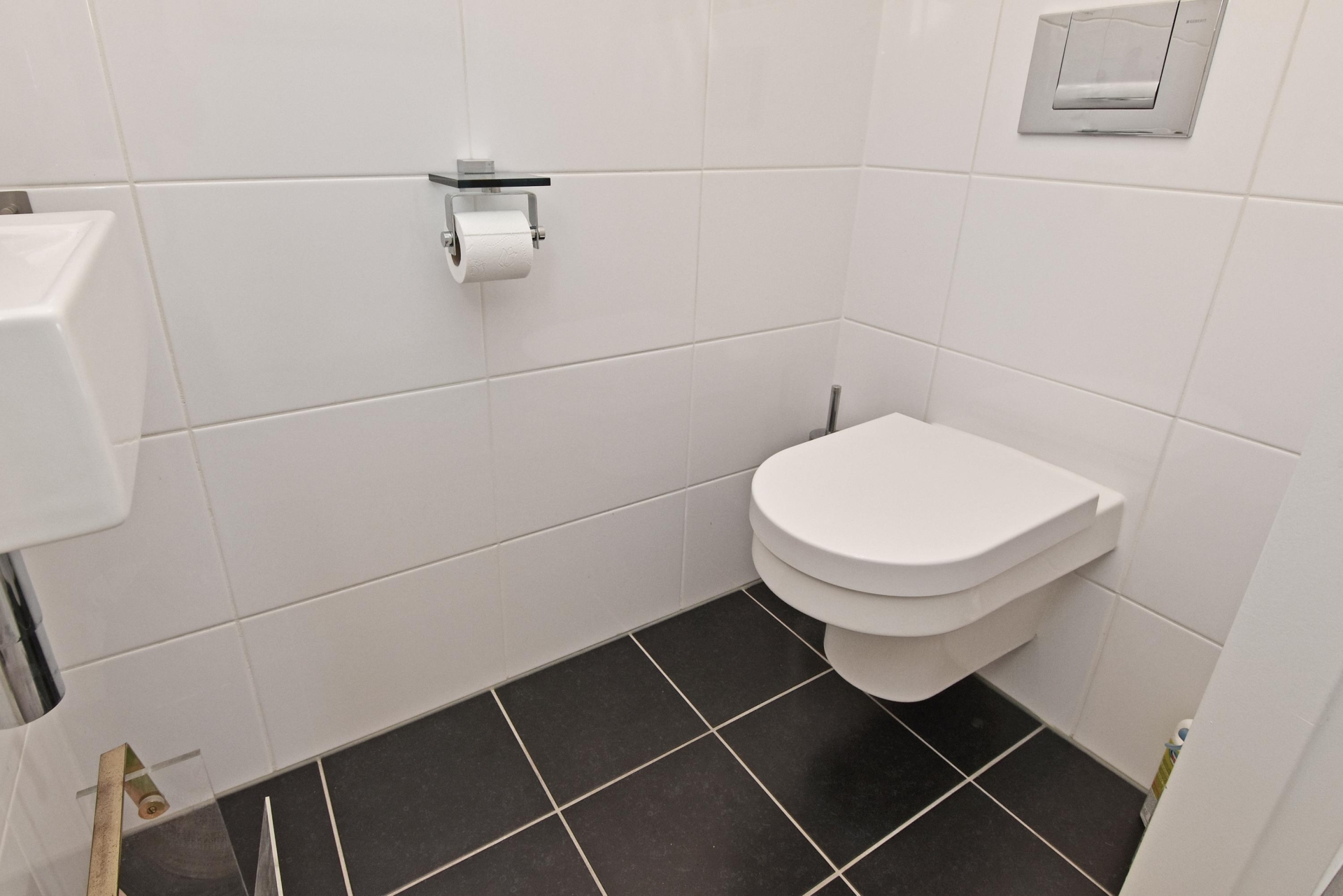 De moderne badkamer is voorzien van een groot ligbad, aparte douchecabine, brede wastafel en vrijhangend toilet. Daarnaast is er een separaat toilet met fontein in de hal.