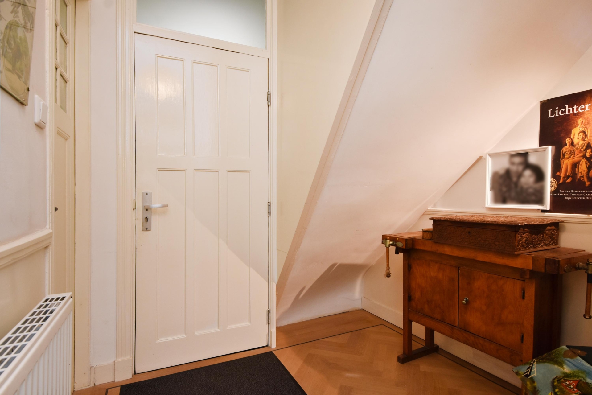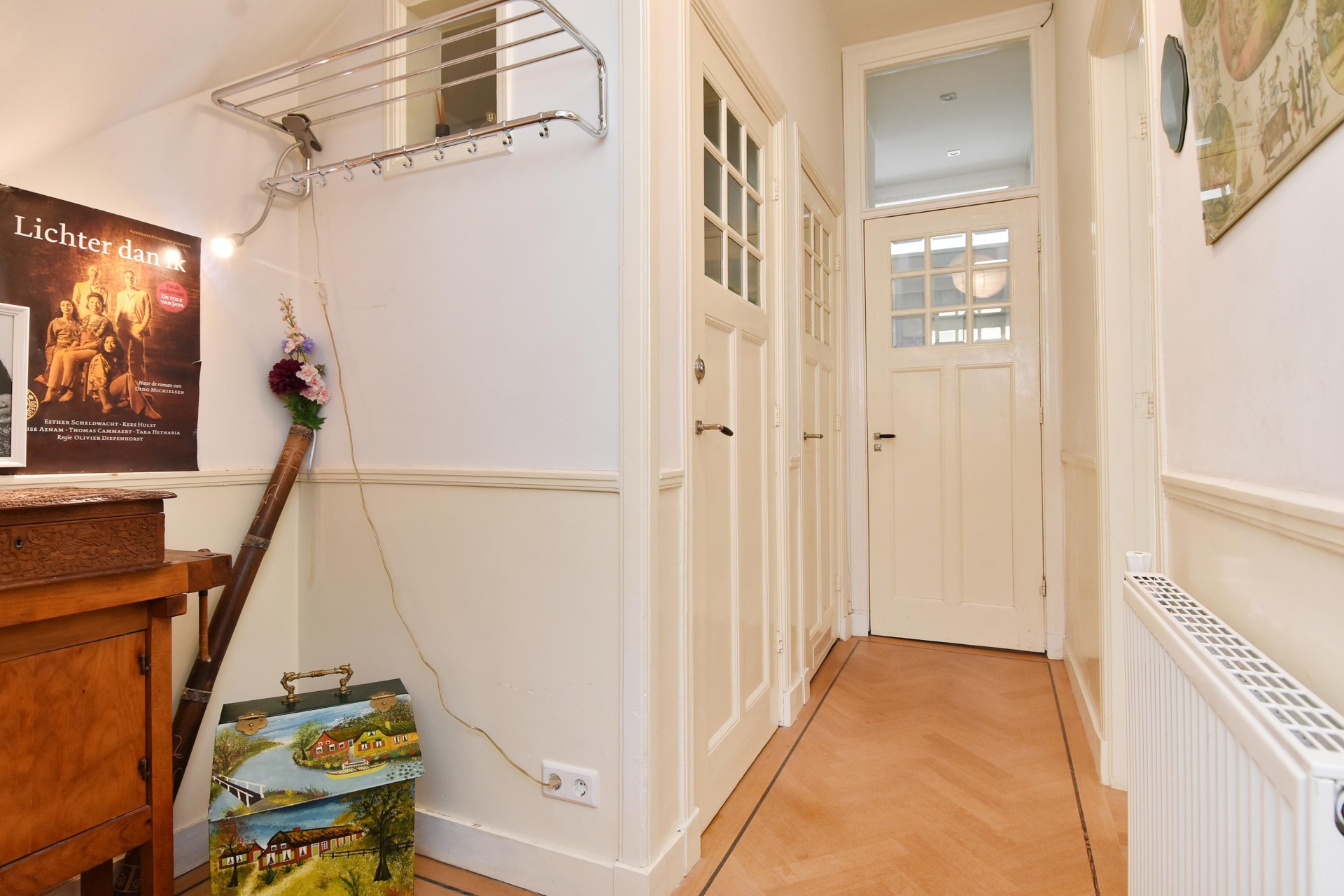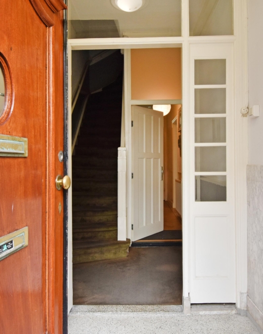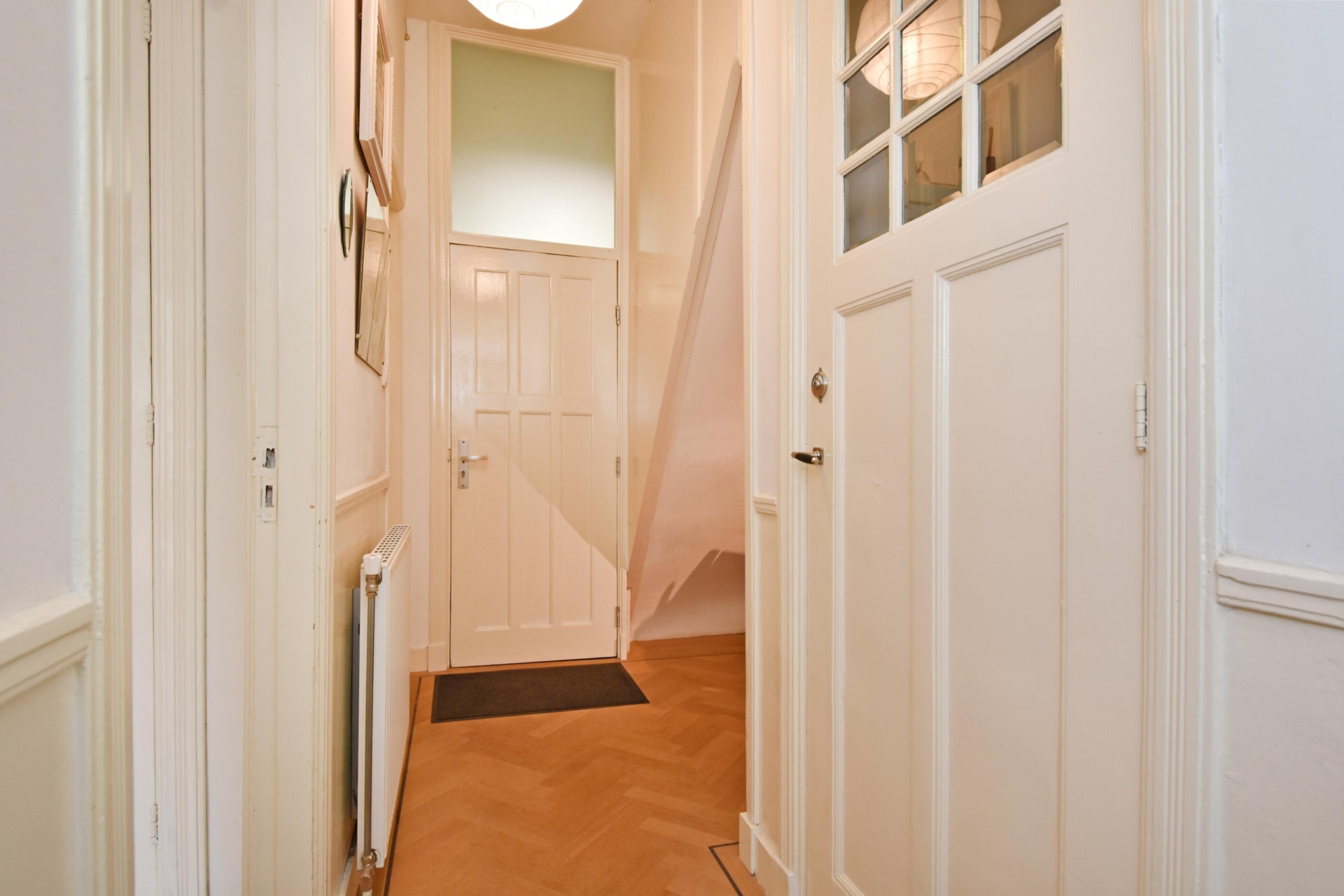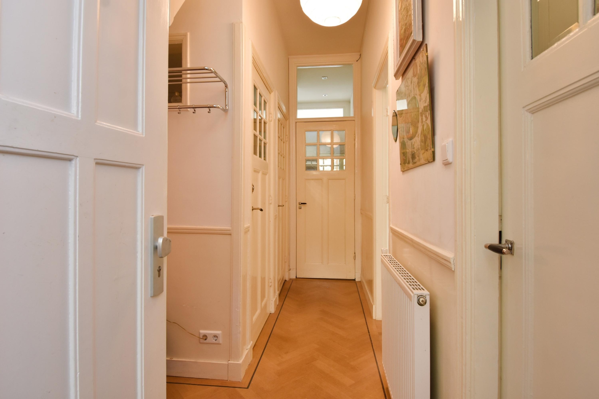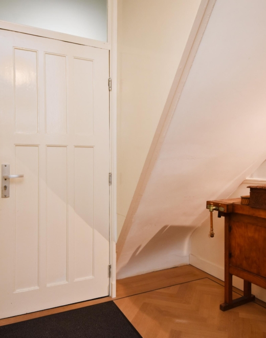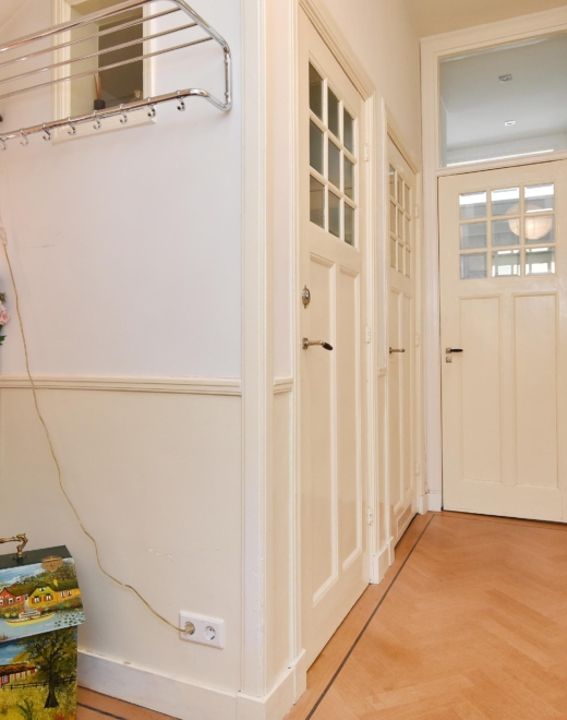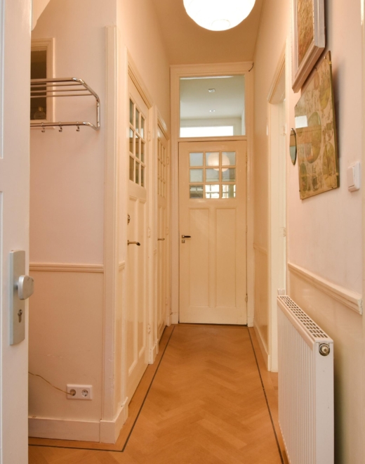 Via de charmante voortuin betreed je de woning via een gezamenlijke entree. Eenmaal binnen word je verwelkomd in de gang van deze bijzonder sfeervolle parterrewoning, waar direct de fraaie doorlopende eikenhouten visgraatparketvloer in het oog springt. Deze vloer loopt elegant door naar beide kamers en zorgt voor een warme, luxe uitstraling.