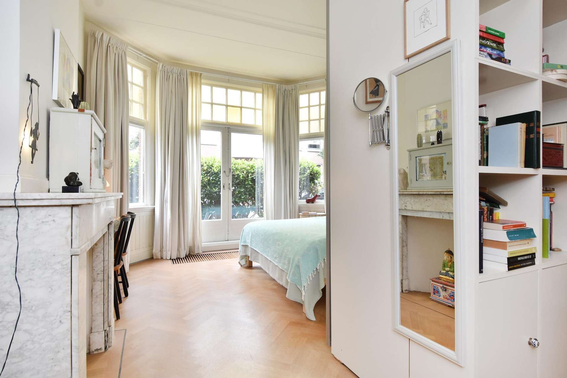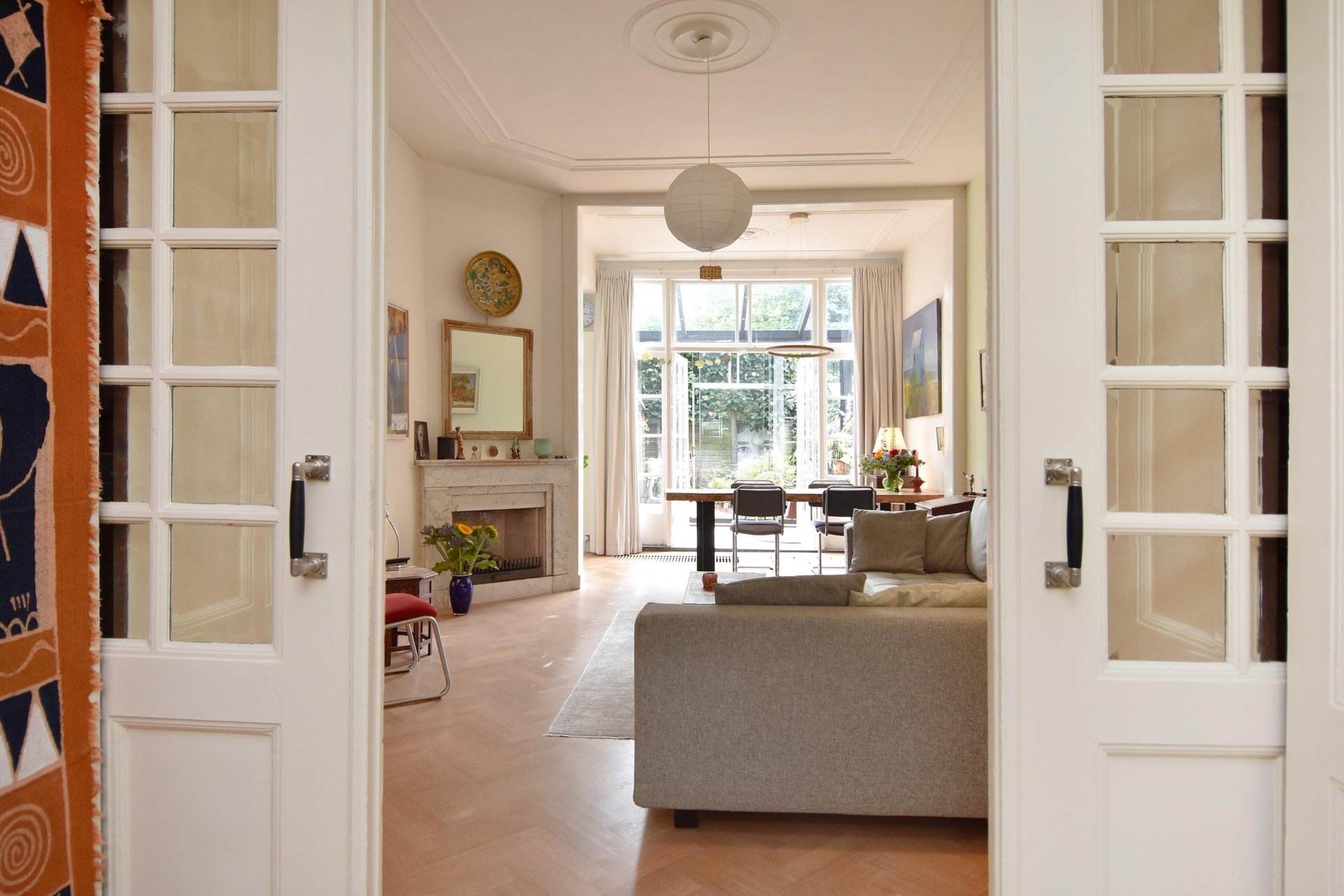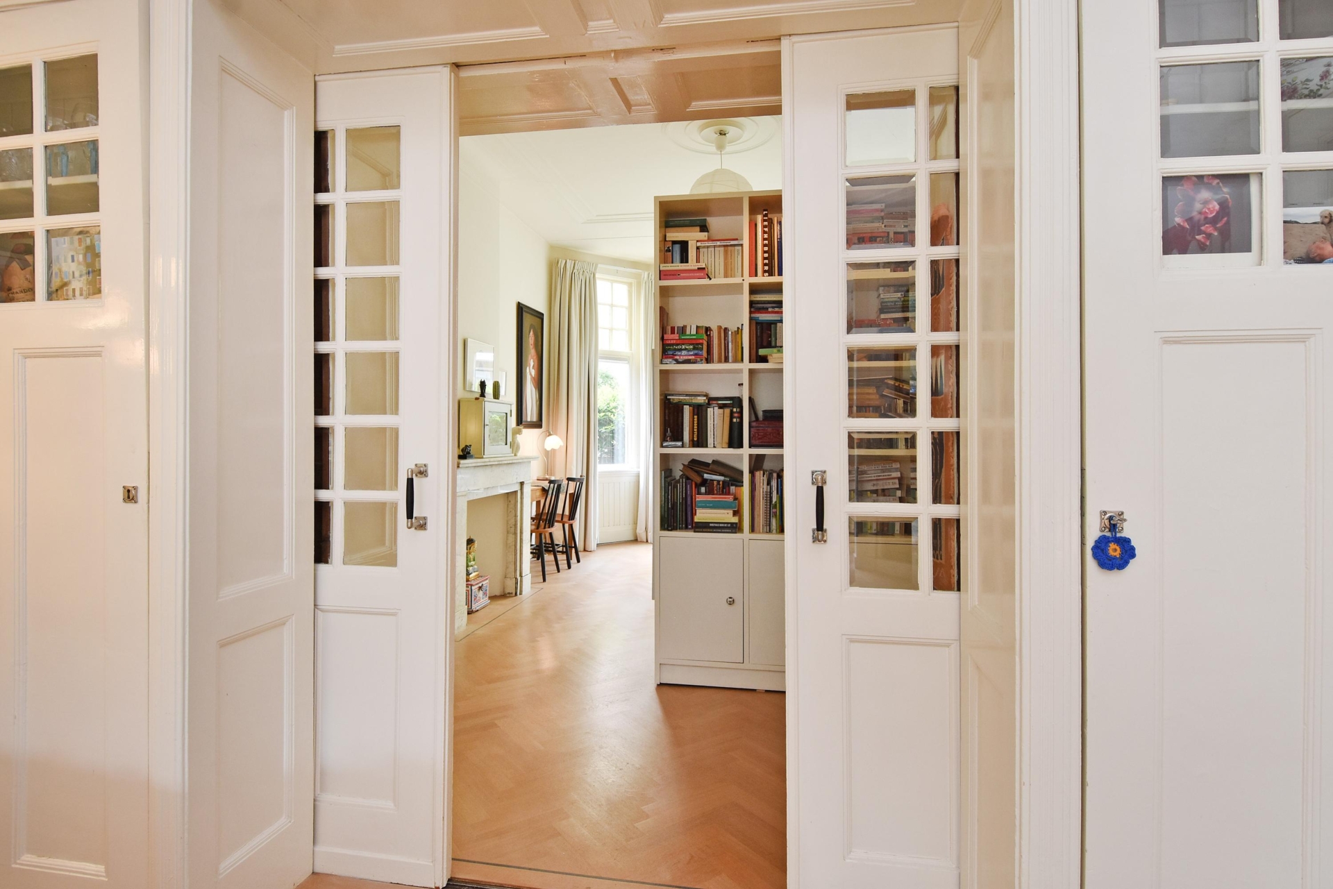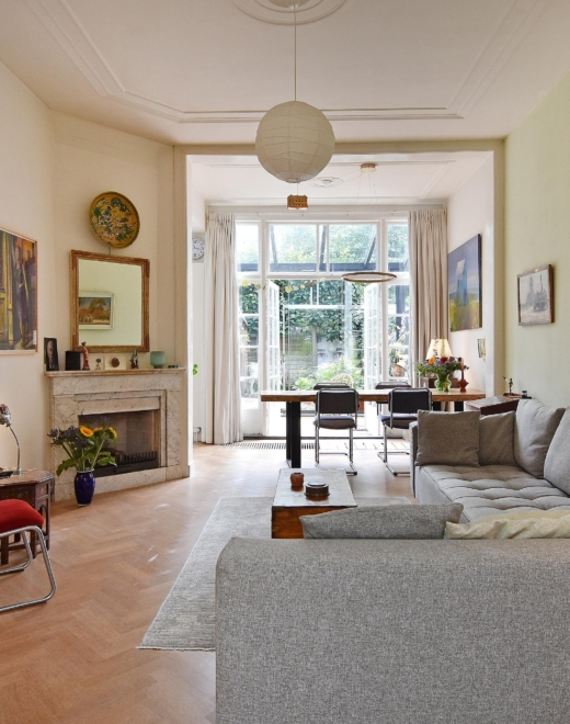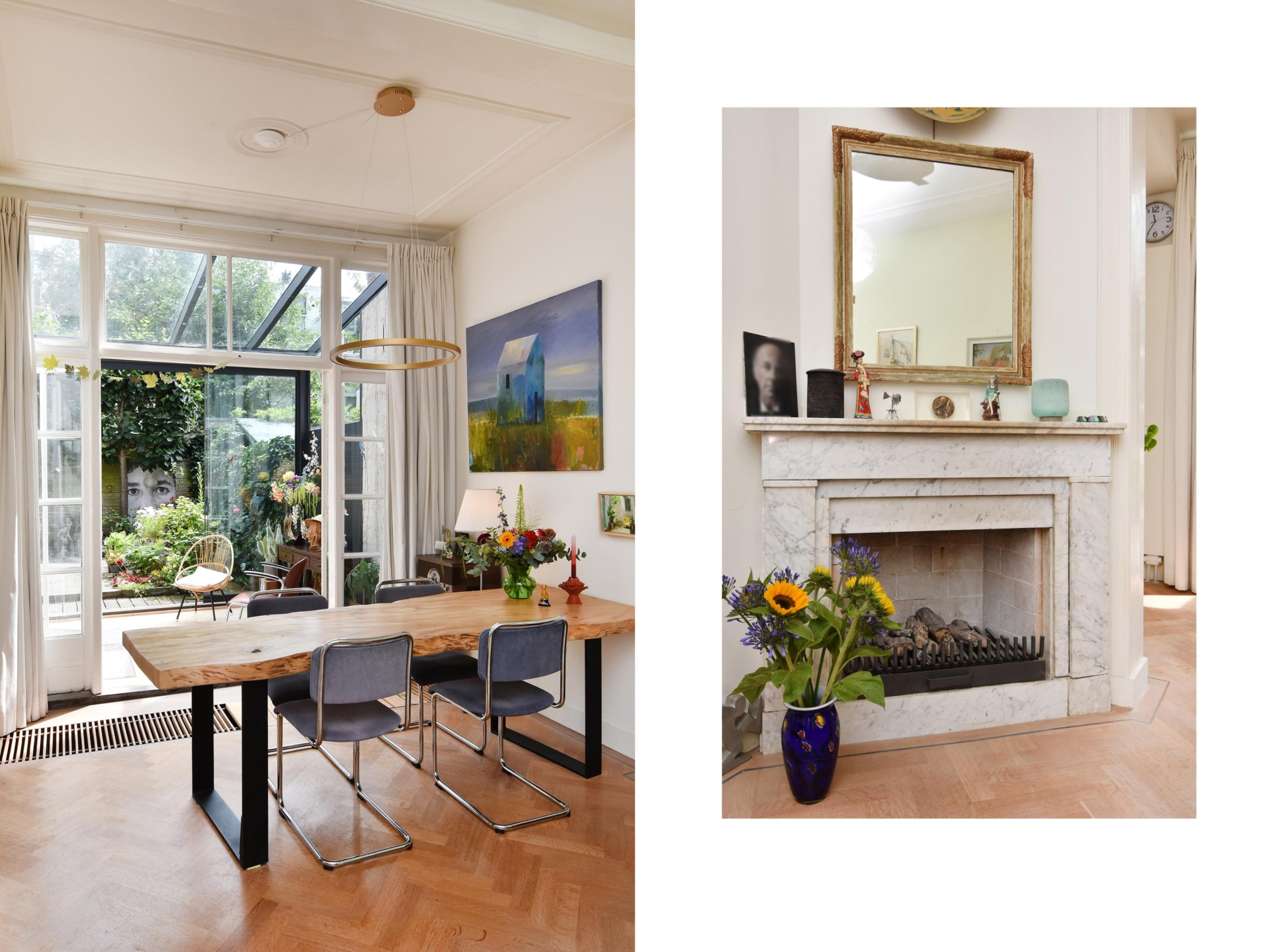 Aan de voorzijde bevindt zich een royale voorkamer met een erker en openslaande deuren naar de knusse voortuin. Beide woonkamers zijn afgewerkt met fraaie ornamentenplafonds en elk voorzien van een natuurstenen schouw – authentieke details die perfect samengaan met hedendaags comfort.