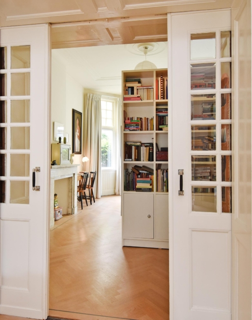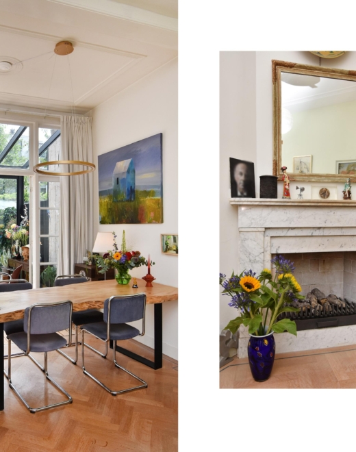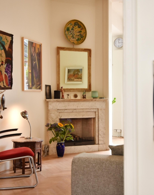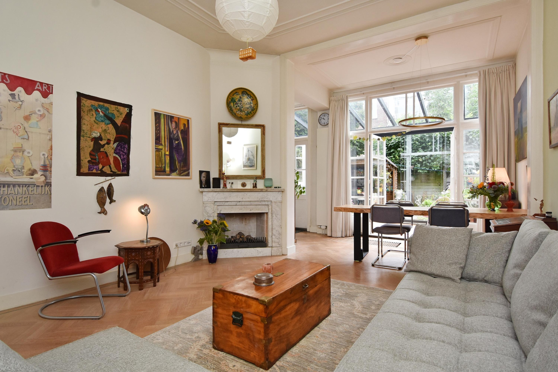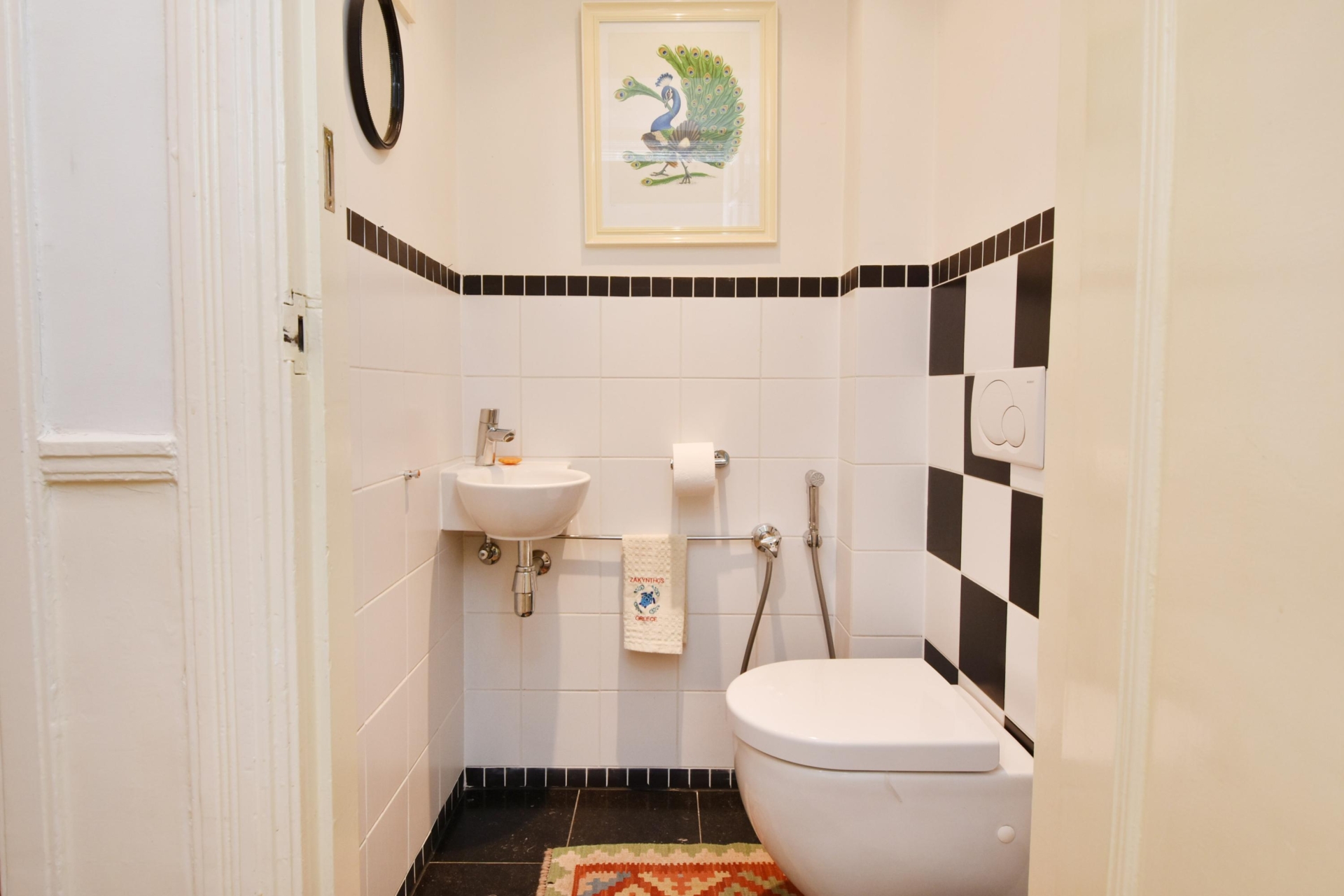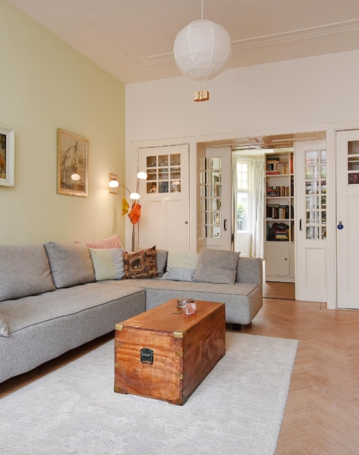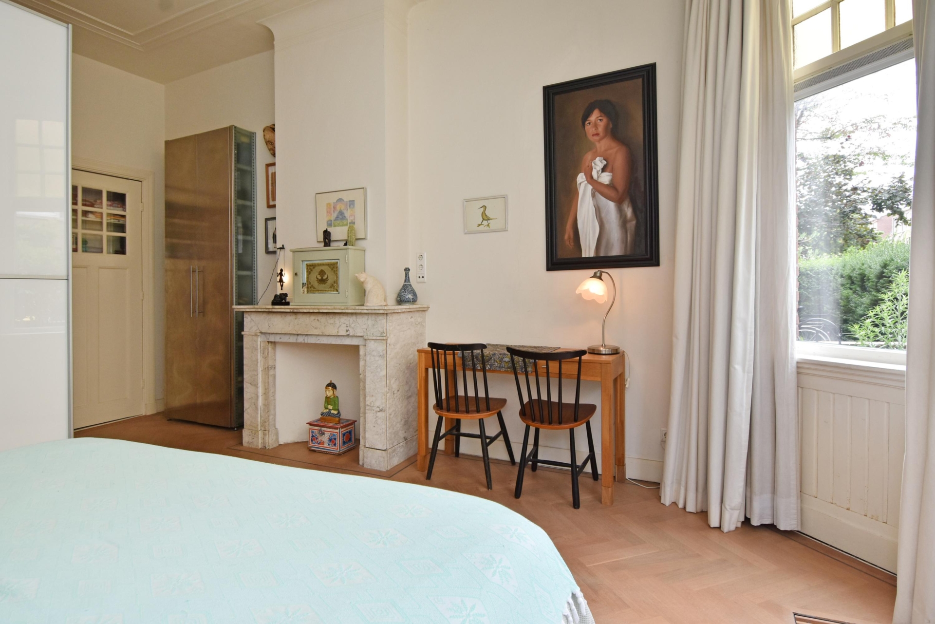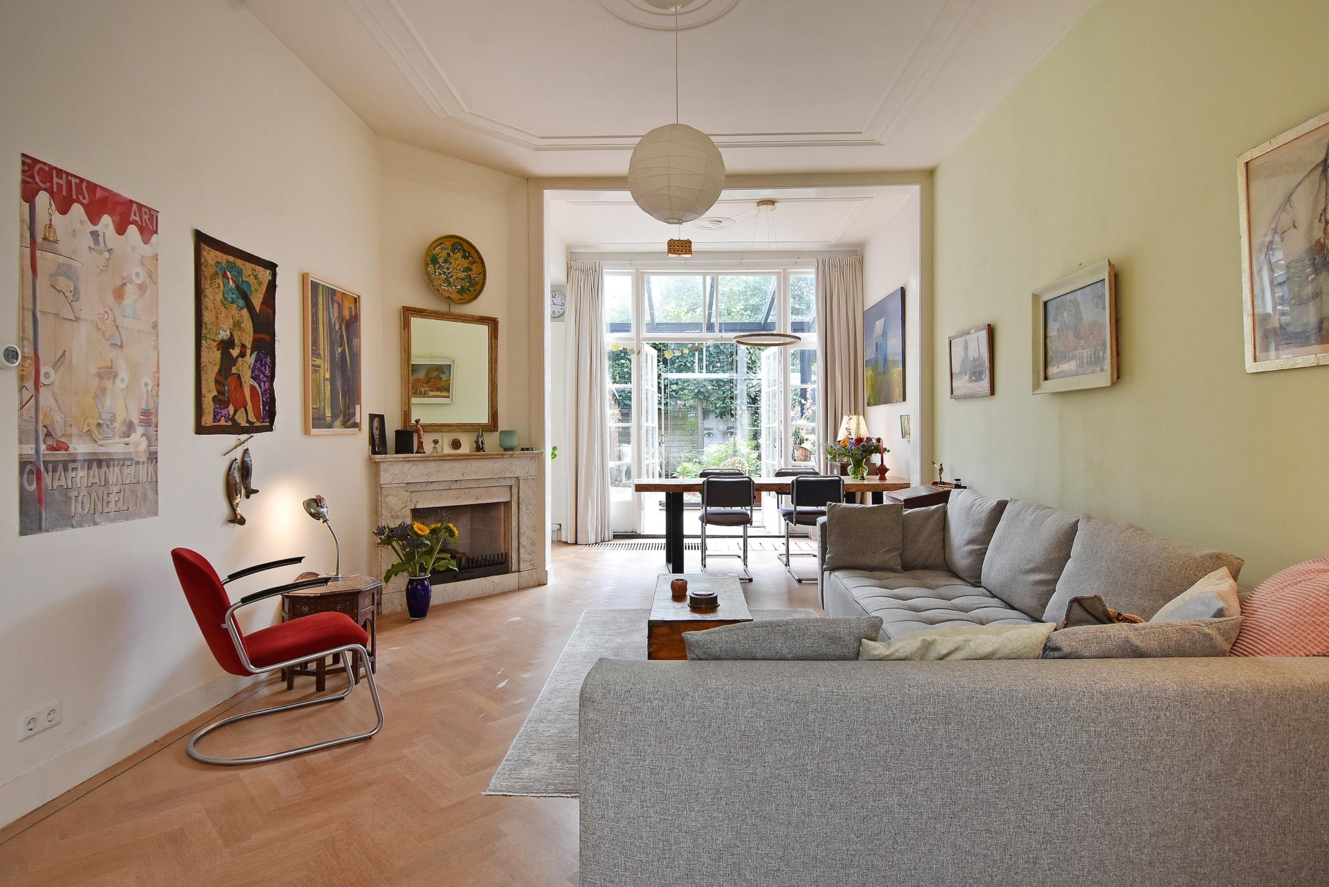 Aan de voorzijde bevindt zich een royale voorkamer met een erker en openslaande deuren naar de knusse voortuin. Beide woonkamers zijn afgewerkt met fraaie ornamentenplafonds en elk voorzien van een natuurstenen schouw – authentieke details die perfect samengaan met hedendaags comfort.