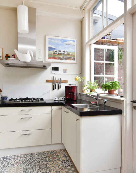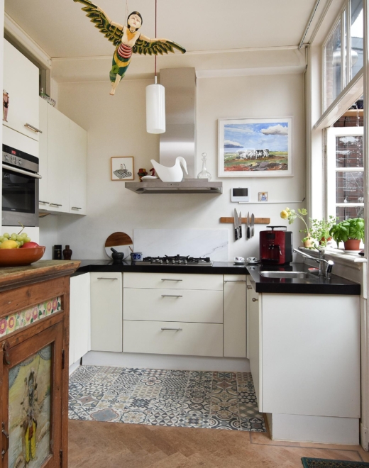 To the rear lies the bright kitchen, designed in a practical U-shaped layout with a refined granite worktop. It is fully equipped with a Quooker boiling-water tap, refrigerator, combination microwave oven, dishwasher, and a five-burner gas hob with extractor hood.