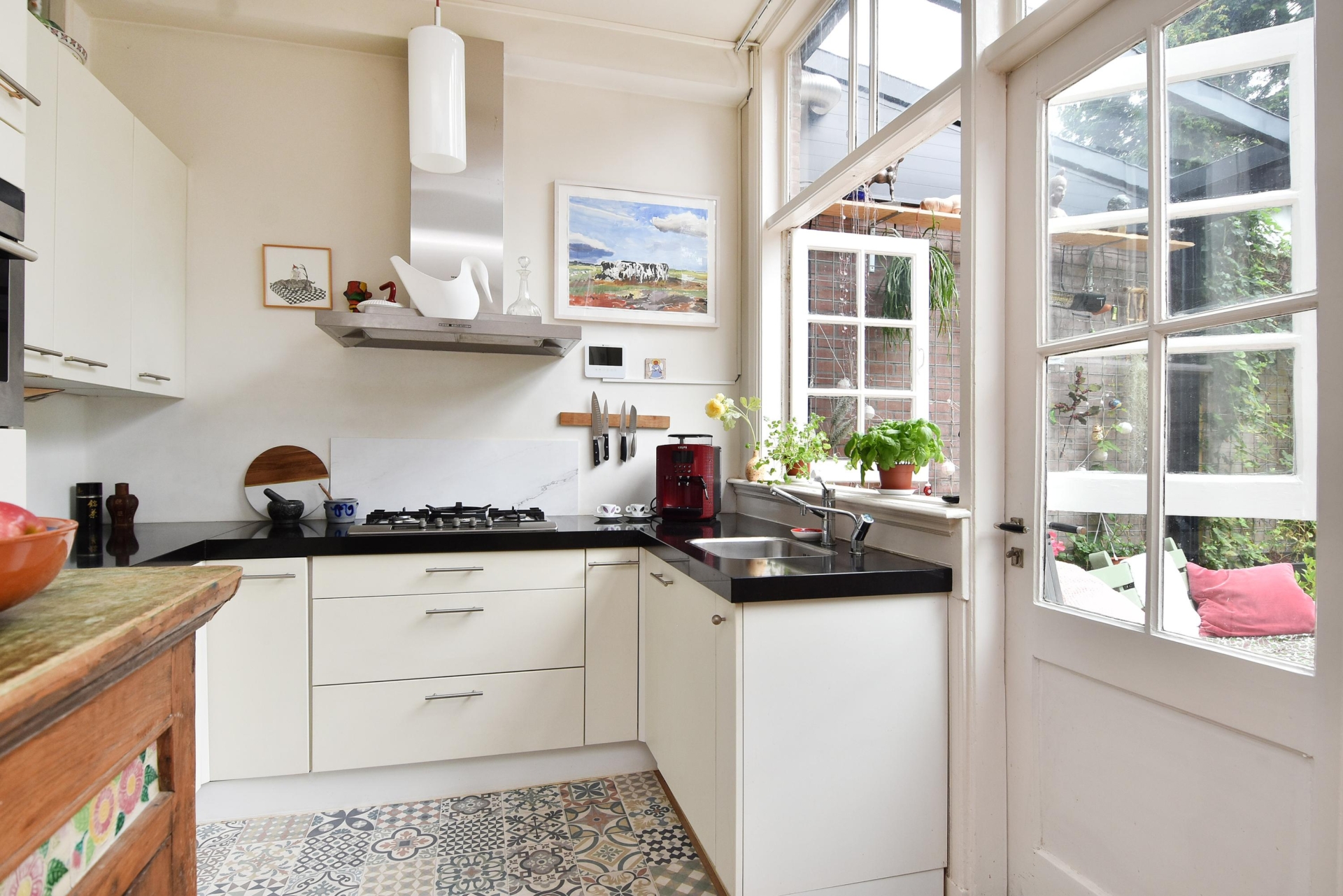 Aan de achterzijde is de lichte keuken, uitgevoerd in een praktische U-opstelling met een stijlvol granieten aanrechtblad. De keuken is compleet uitgerust met een Quooker, koelkast, combi-magnetronoven, vaatwasser en een 5-pits gaskookplaat met afzuigkap.
