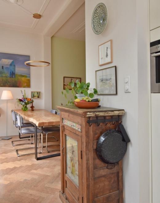 The classic en-suite living arrangement forms the heart of the apartment. The stylish living room features a cosy gas fireplace with a beautiful natural stone mantelpiece. The en-suite separation includes no fewer than four built-in cupboards, offering both character and ample storage space.