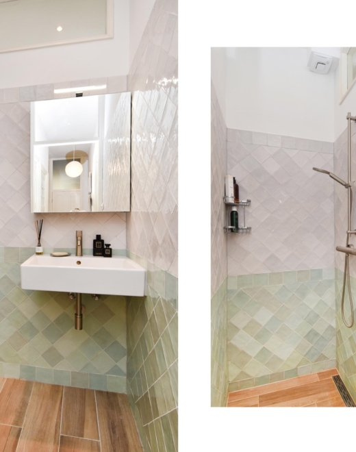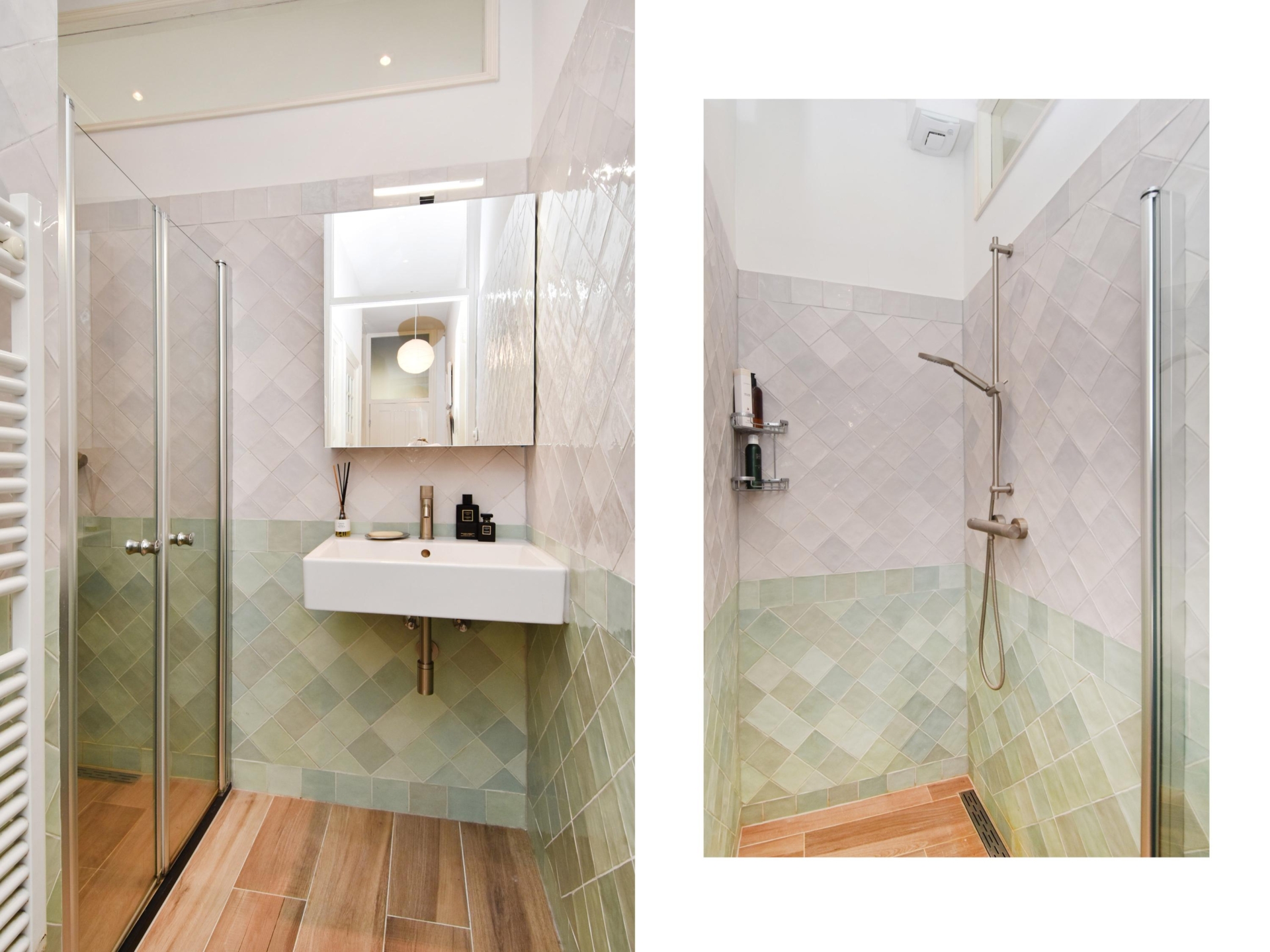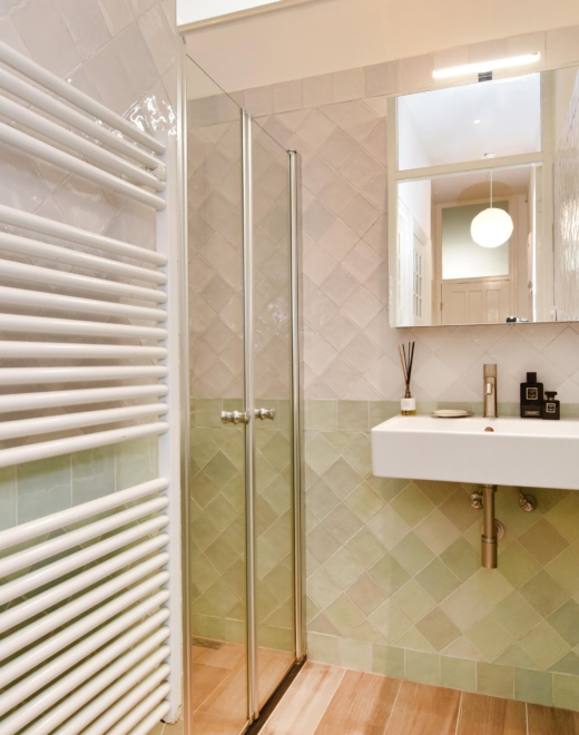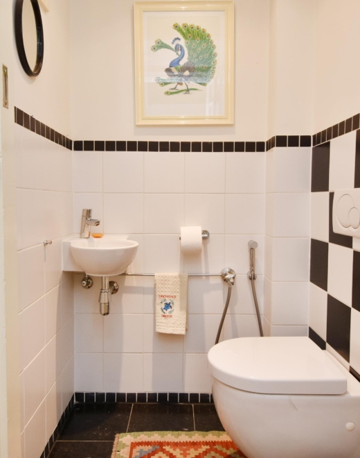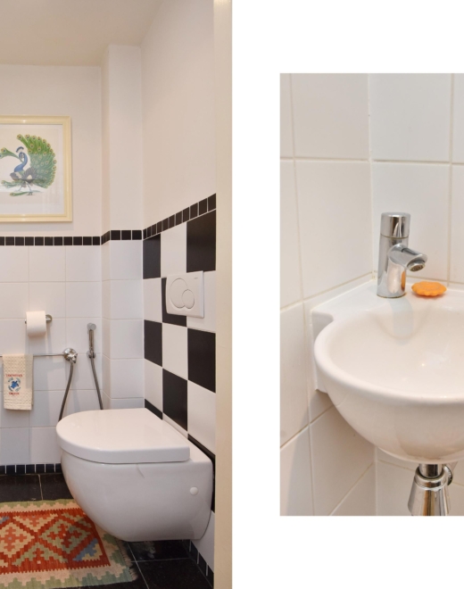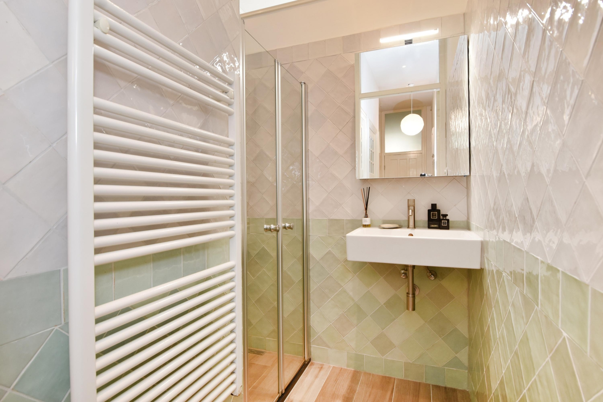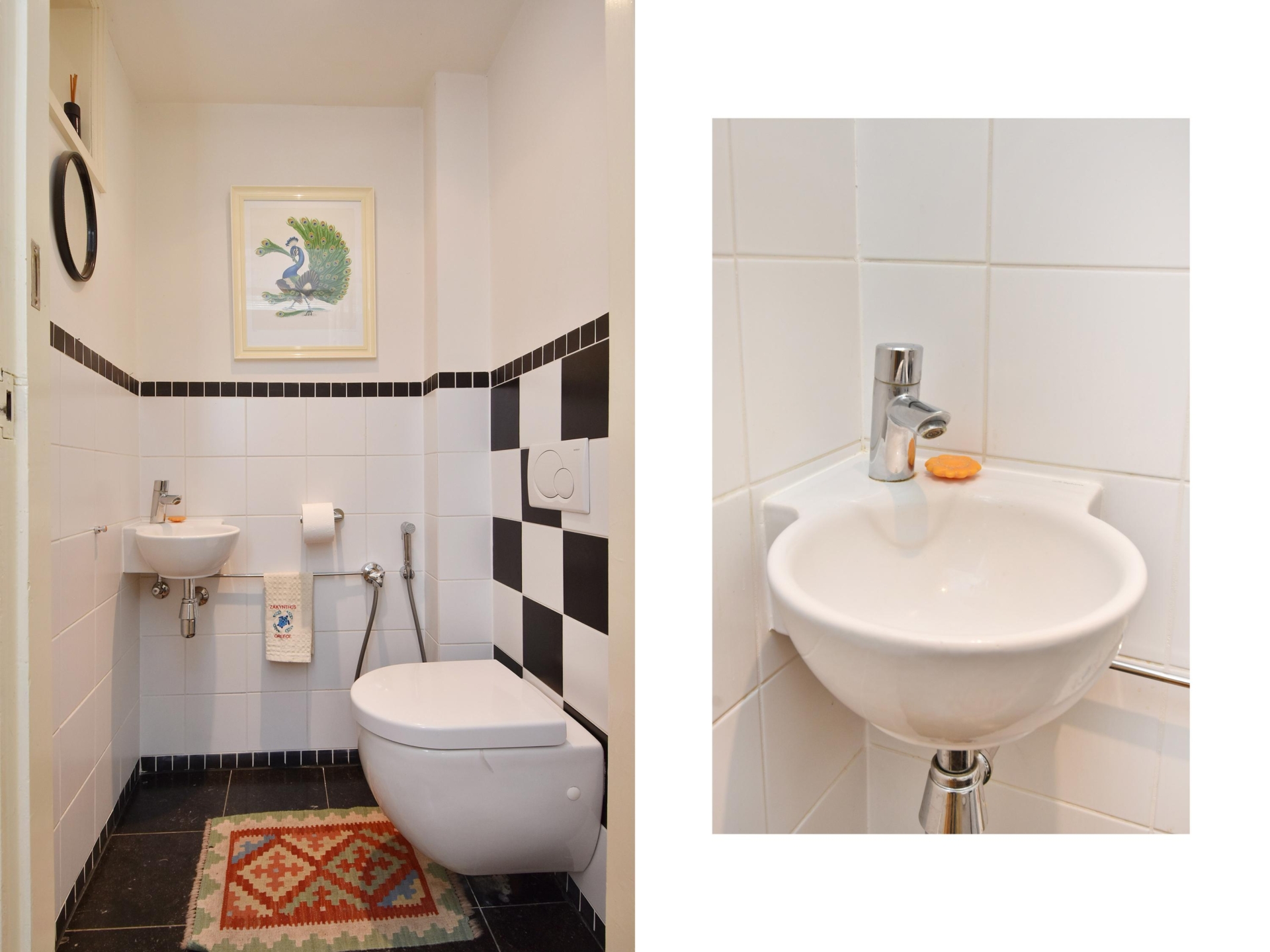De moderne badkamer (2024) is strak en eigentijds uitgevoerd en voorzien van een douche, wastafel, handdoekenradiator en mechanische ventilatie. Daarnaast is er vanuit de gang toegang tot een modern betegeld toilet met hoekfonteintje.