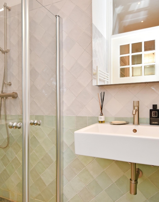 The contemporary bathroom (2024) is sleek and modern, fitted with a shower, washbasin, towel radiator and mechanical ventilation. Additionally, the hallway provides access to a modern, fully tiled separate toilet with corner washbasin.
