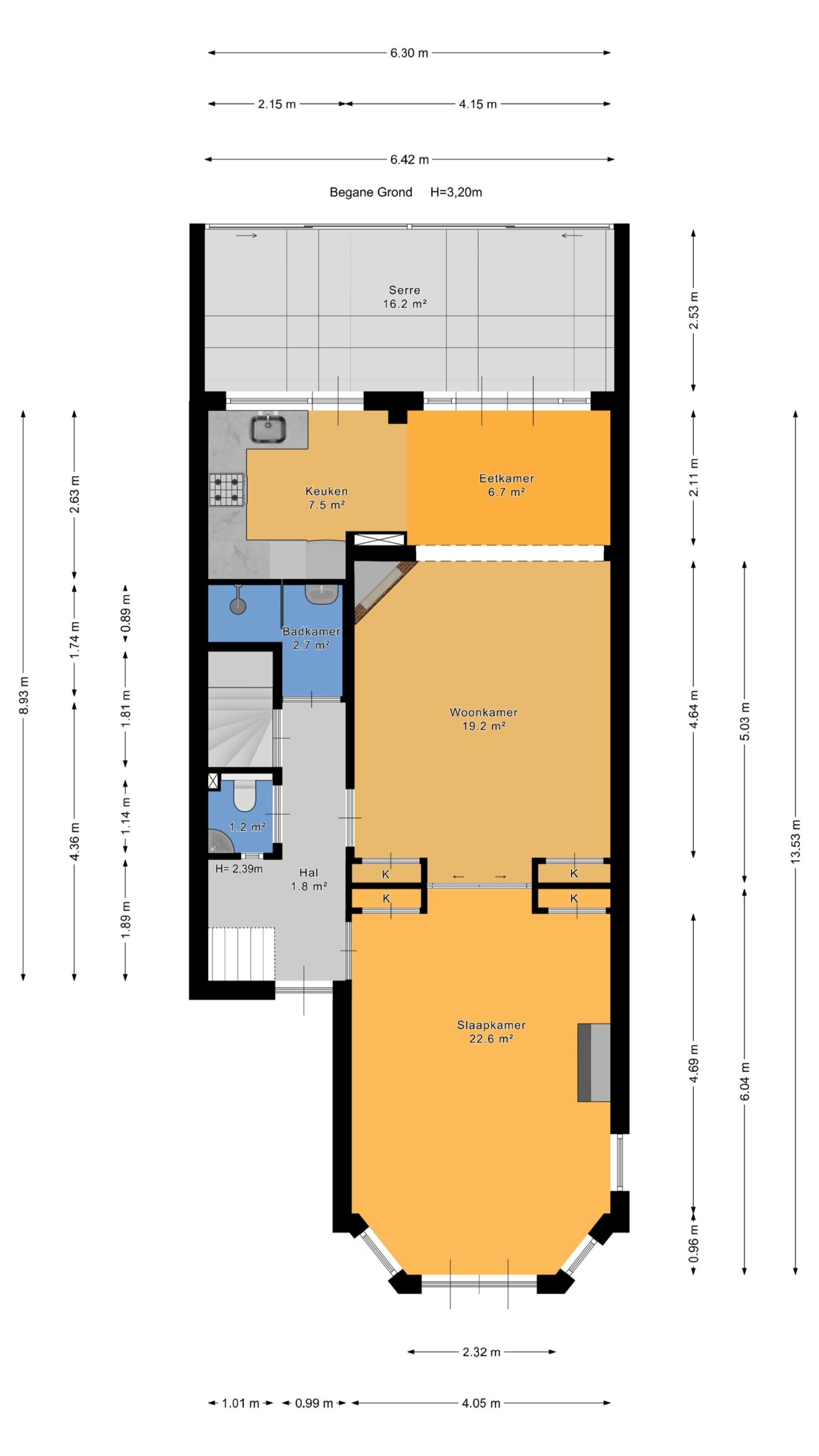 – woonoppervlakte 73 m² en 16 m2 serre volgens de branche brede meetinstructie