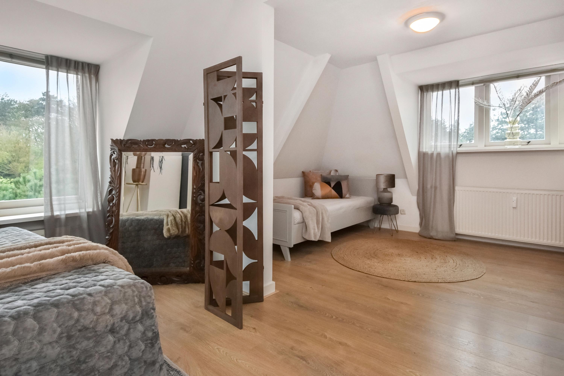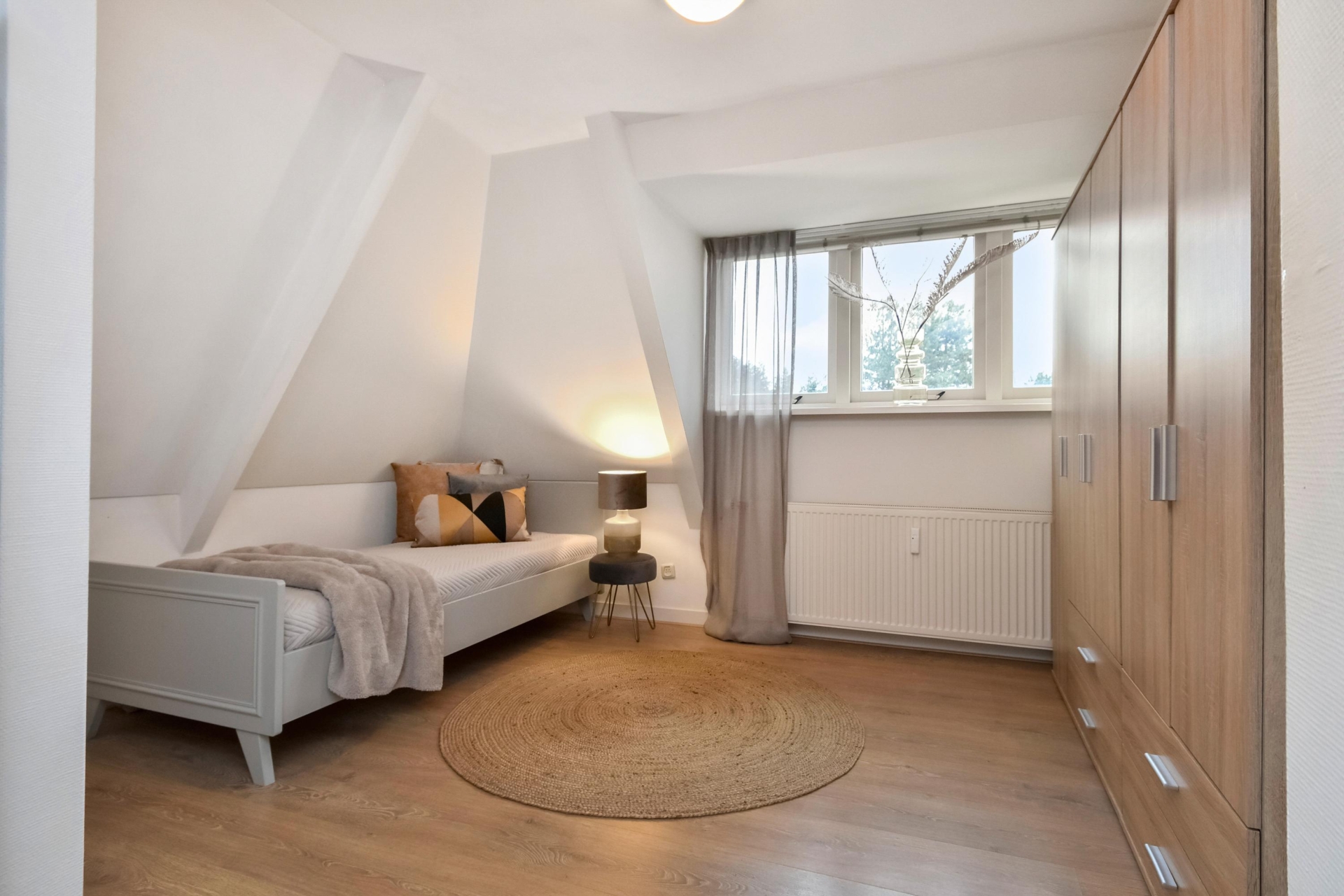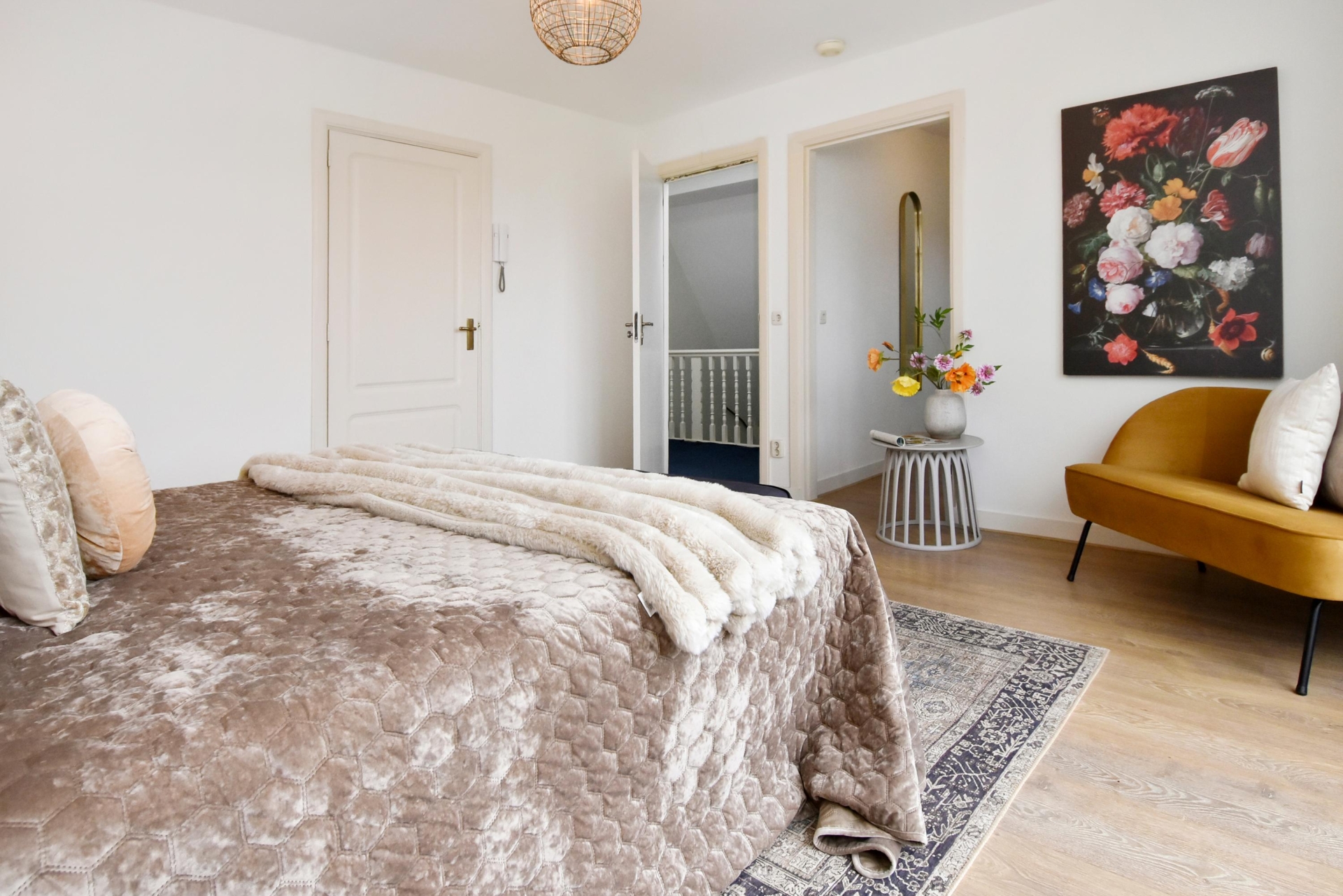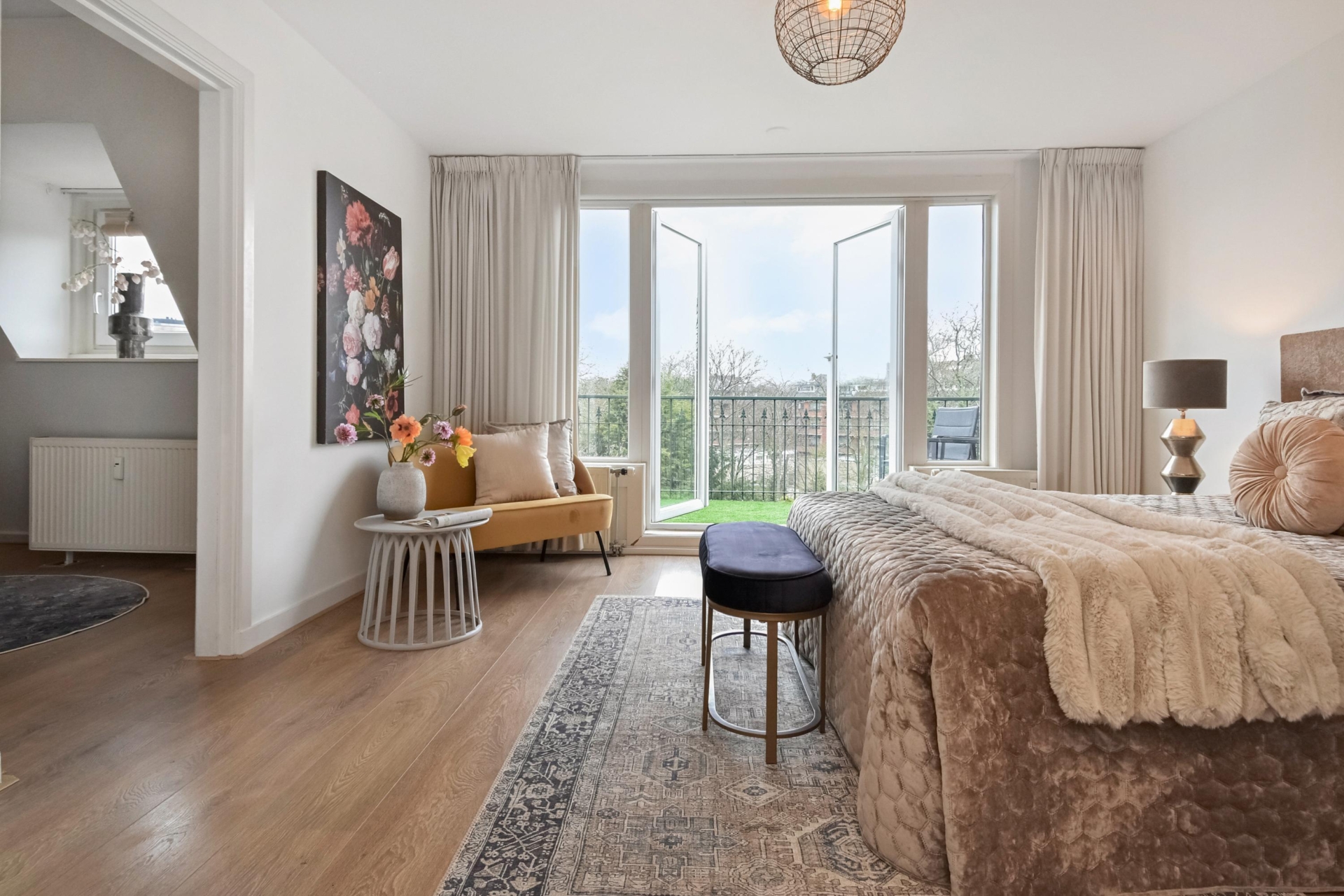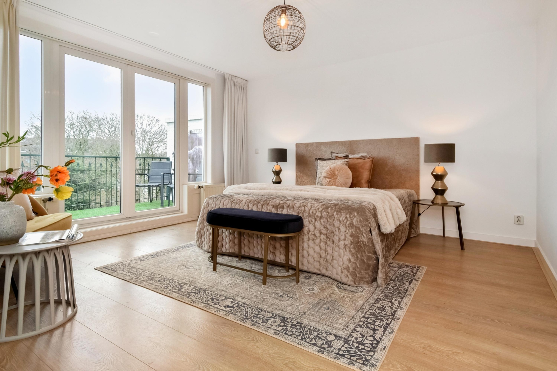 Aan de achterzijde ligt nog een ruime slaapkamer met openslaande deuren naar het ruime achterbalkon waar het heerlijk vertoeven is in de ochtend- en middag zon. Ook hier kijk je vrij weg over het groen. Deze verdieping beschikt daarnaast over een badkamer met douche, wastafelmeubel en toilet, en een extra zijkamer.