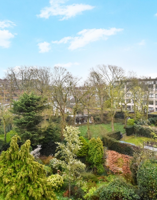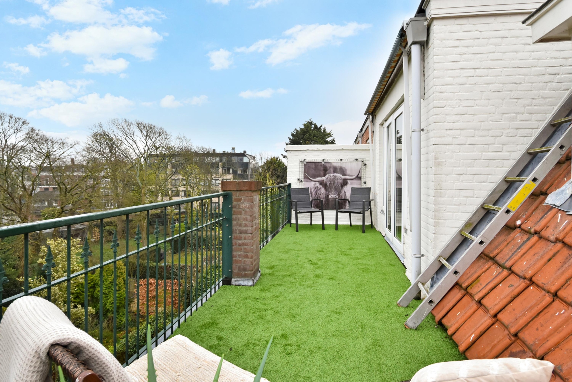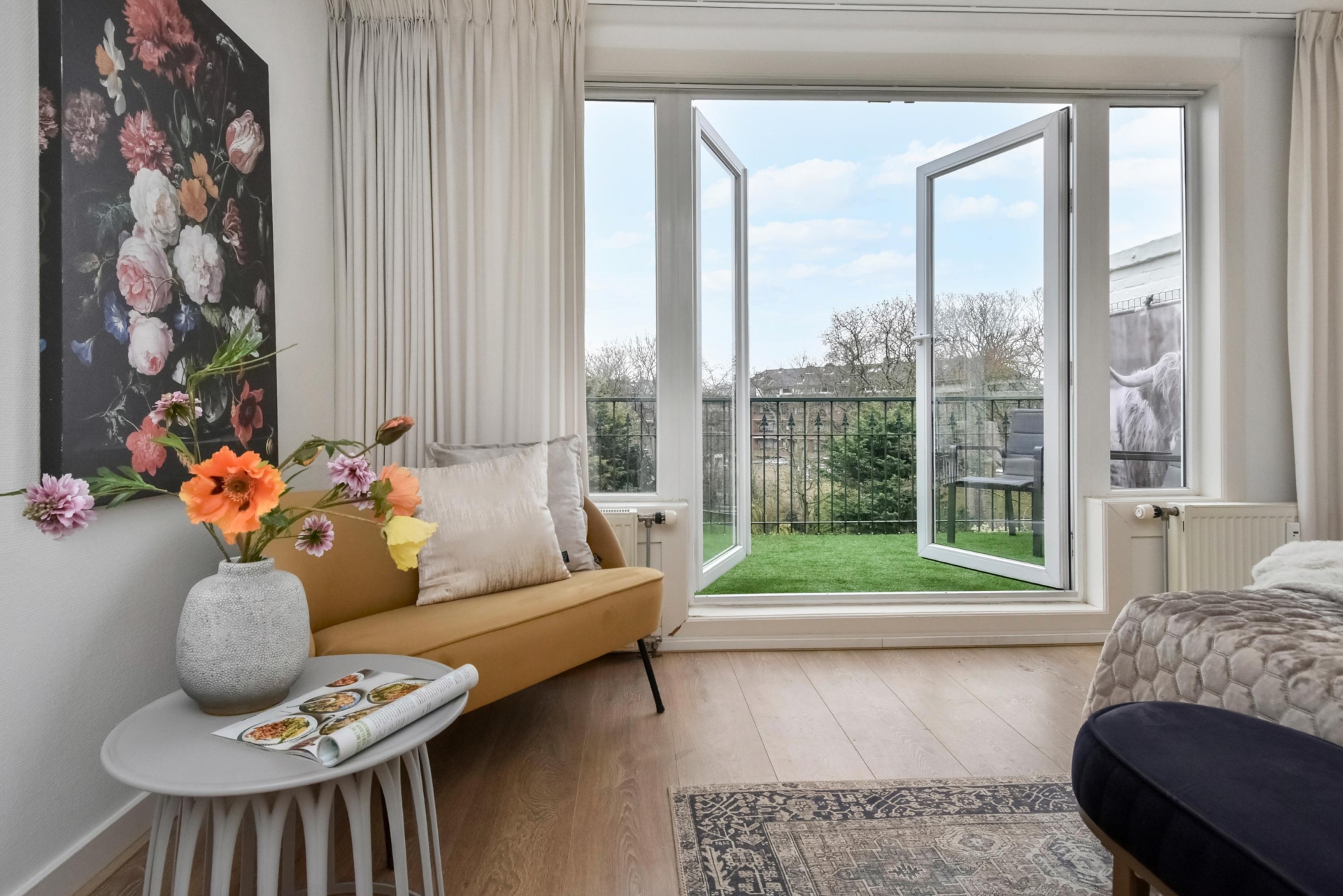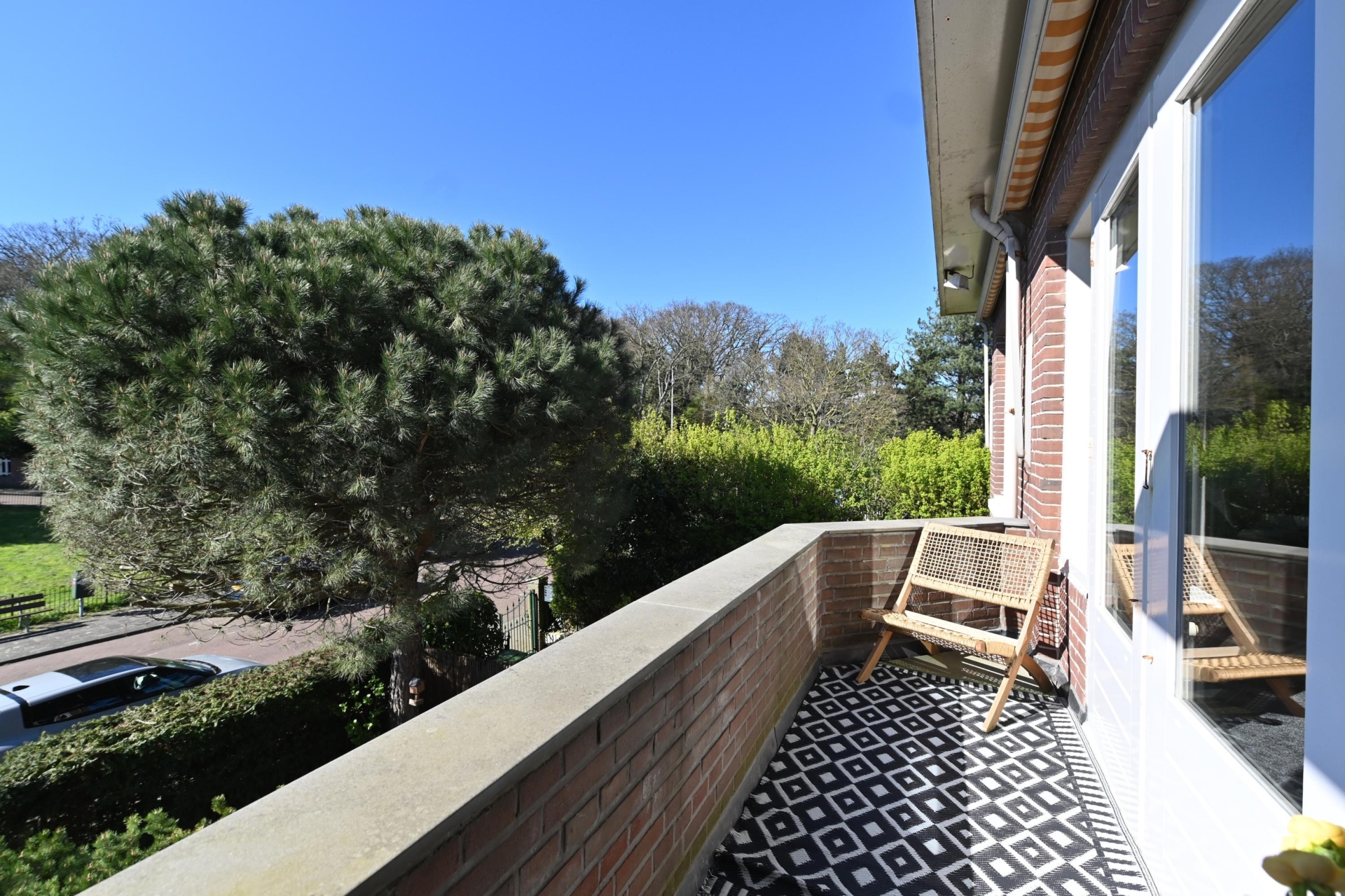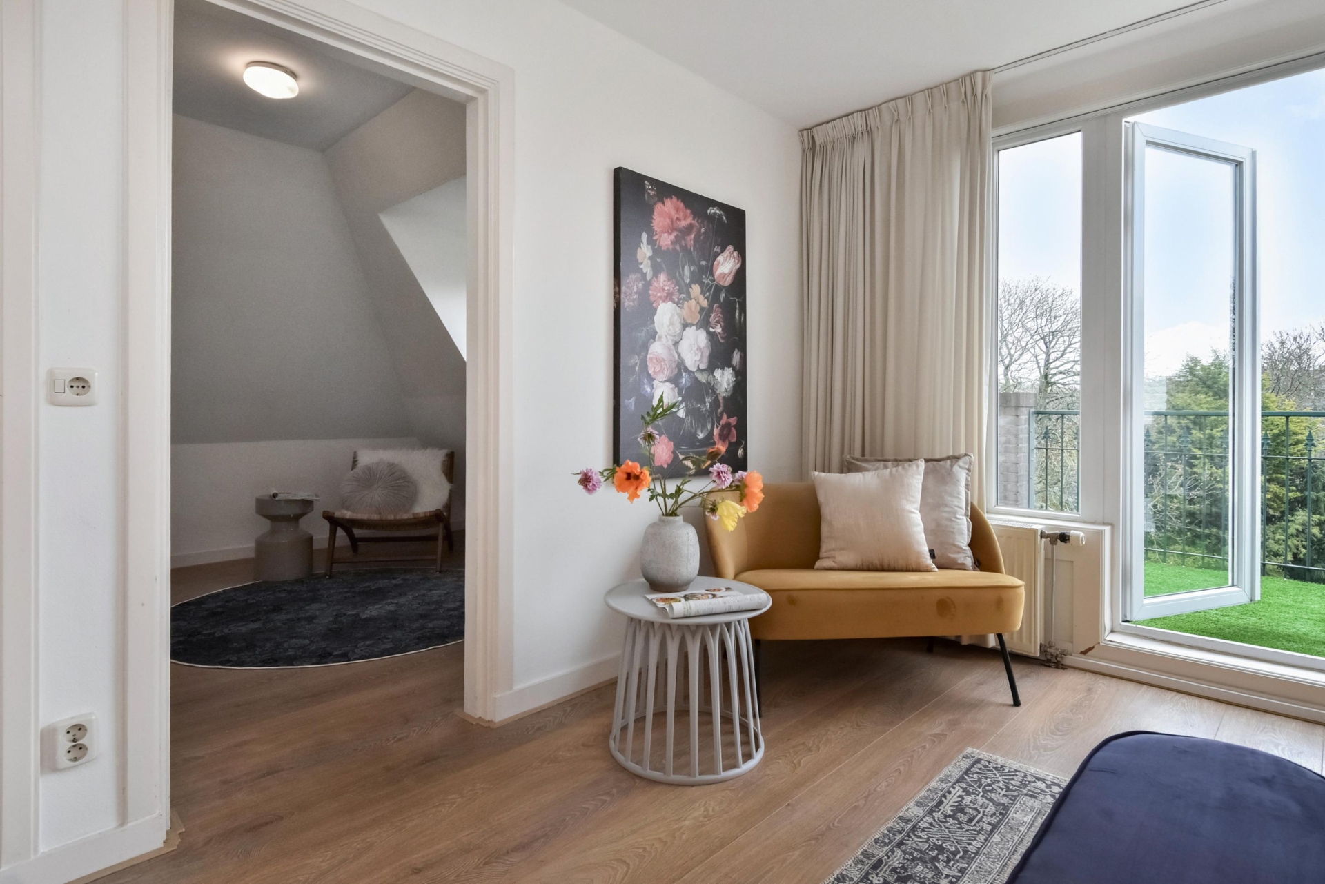 Aan de achterzijde ligt nog een ruime slaapkamer met openslaande deuren naar het ruime achterbalkon waar het heerlijk vertoeven is in de ochtend- en middag zon. Ook hier kijk je vrij weg over het groen. Deze verdieping beschikt daarnaast over een badkamer met douche, wastafelmeubel en toilet, en een extra zijkamer.