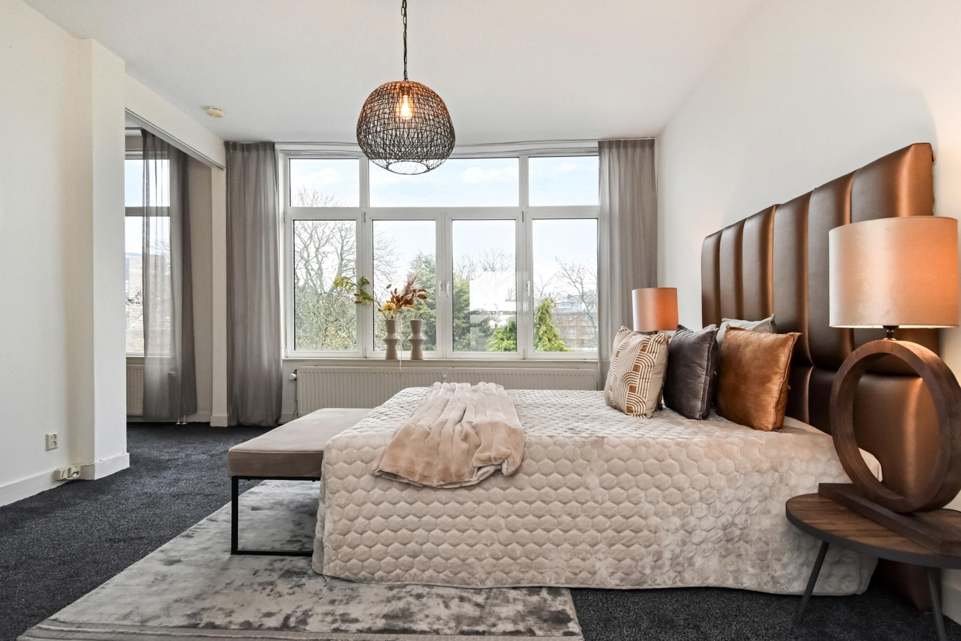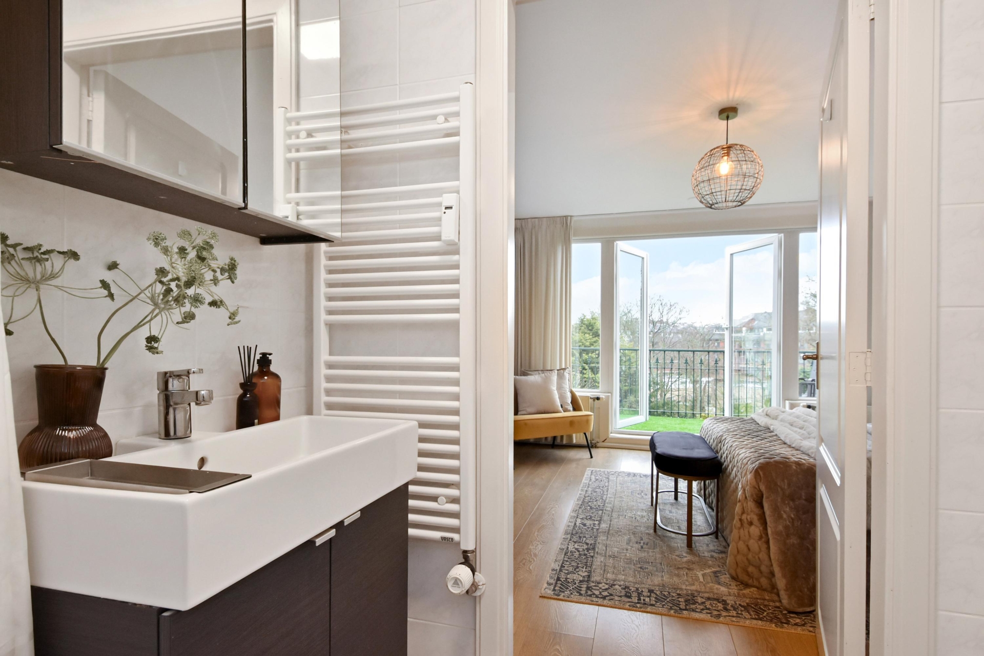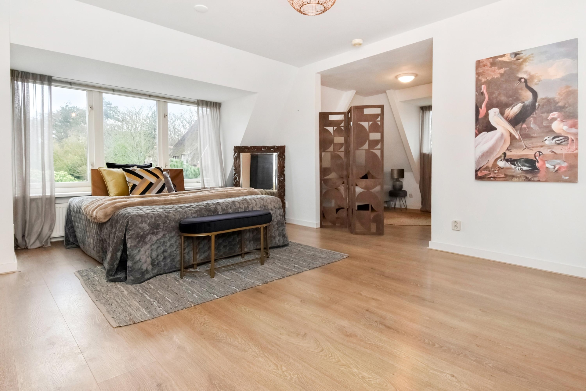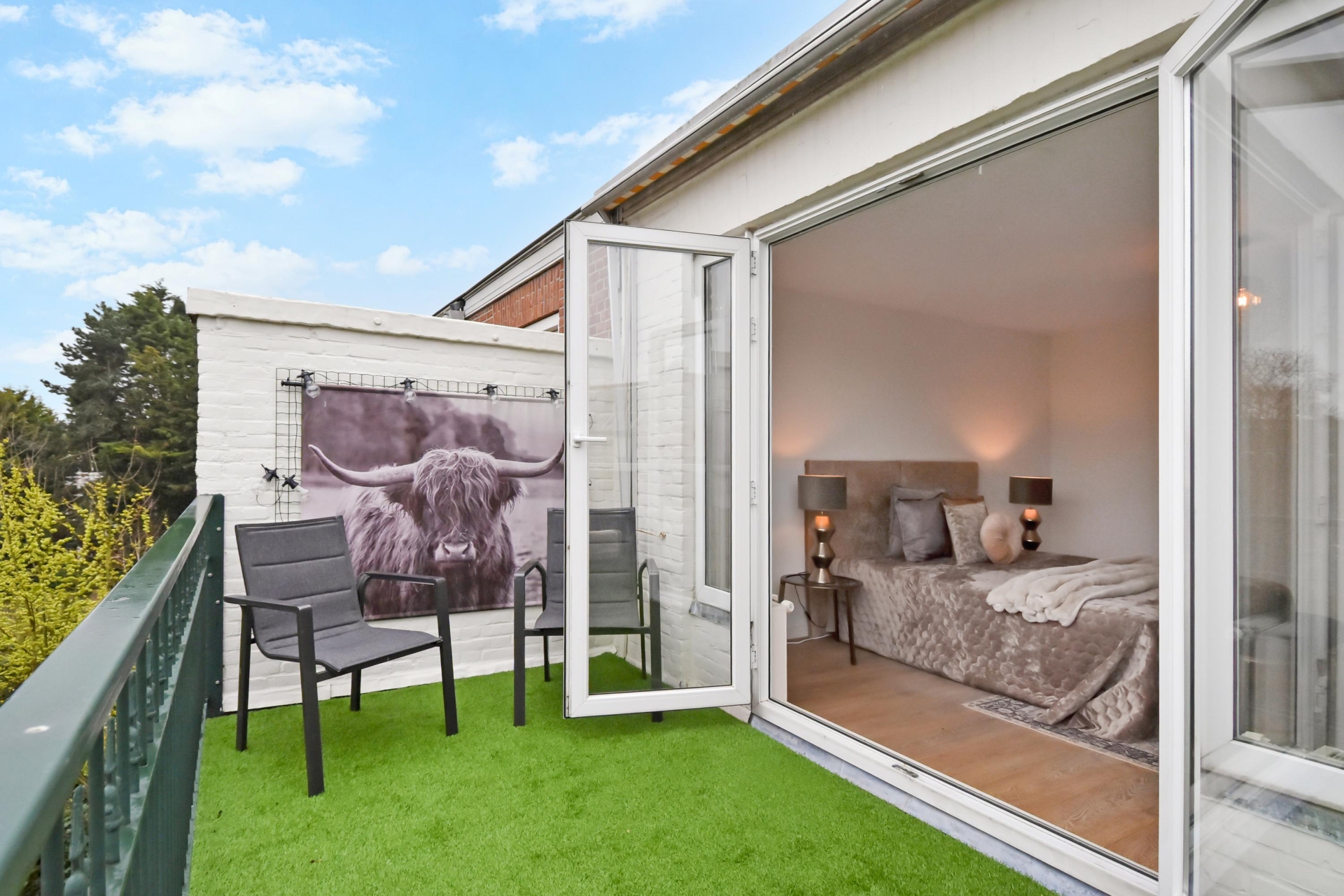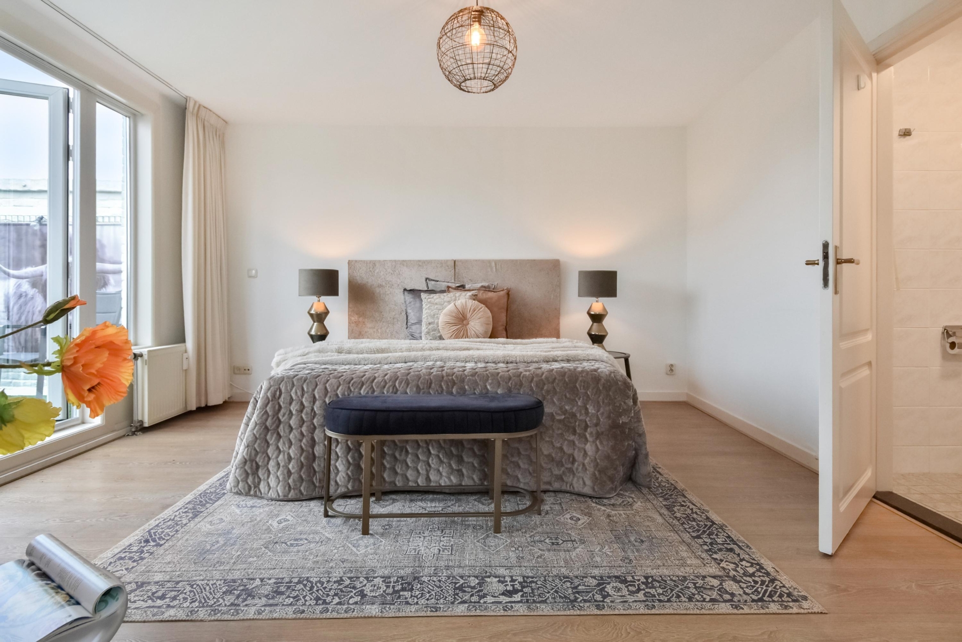 Aan de achterzijde ligt nog een ruime slaapkamer met openslaande deuren naar het ruime achterbalkon waar het heerlijk vertoeven is in de ochtend- en middag zon. Ook hier kijk je vrij weg over het groen. Deze verdieping beschikt daarnaast over een badkamer met douche, wastafelmeubel en toilet, en een extra zijkamer.