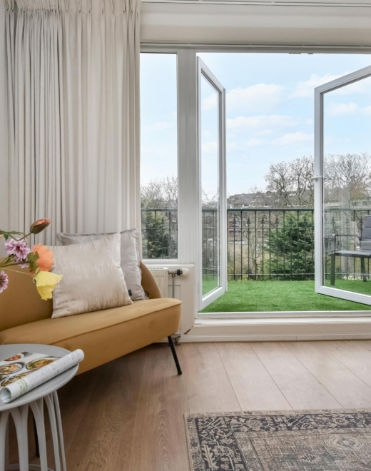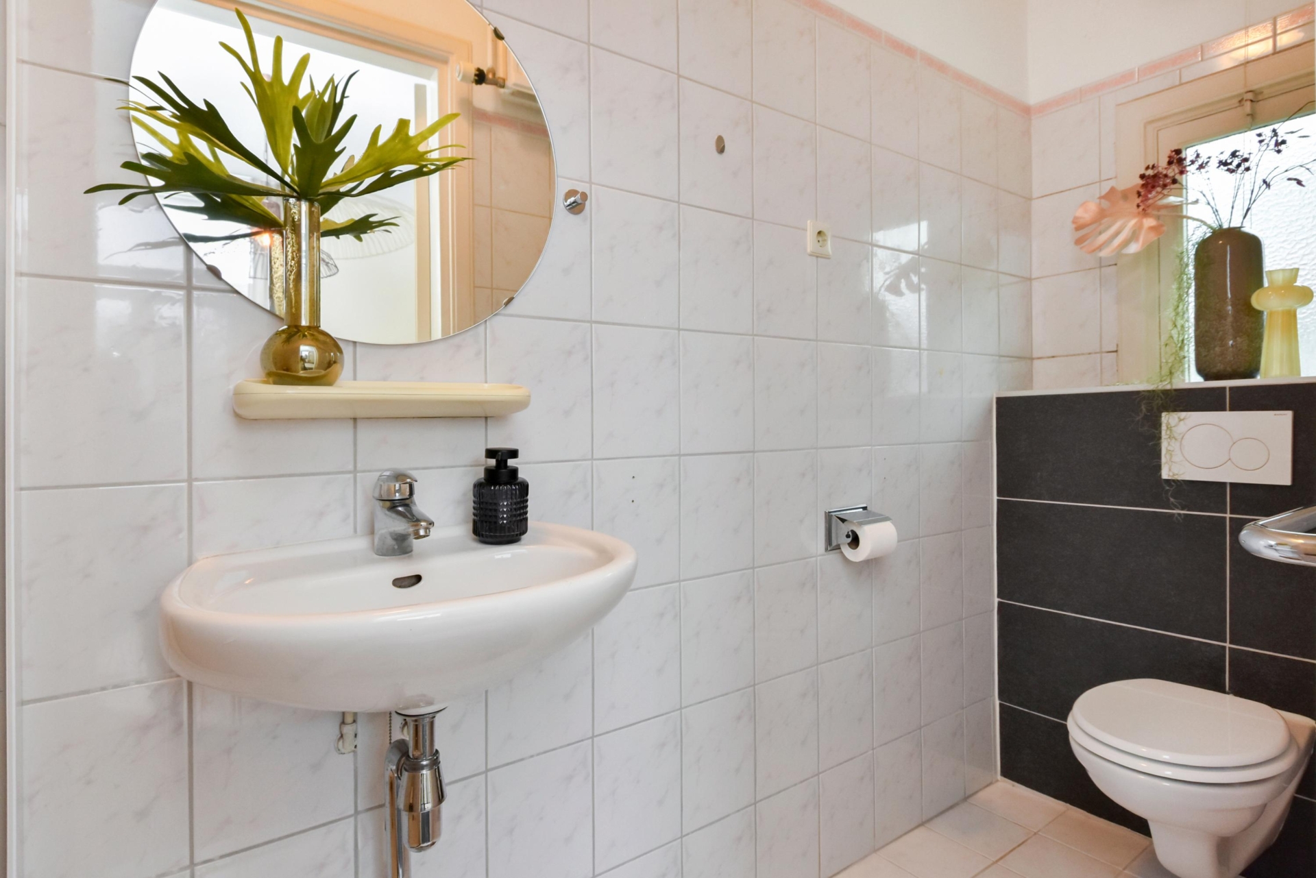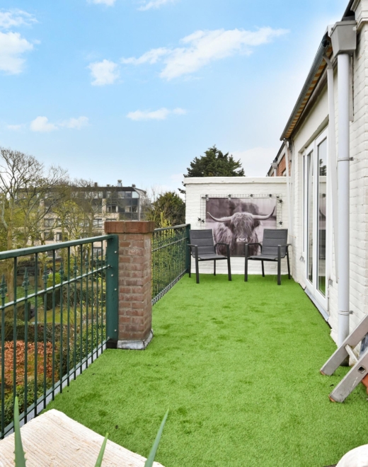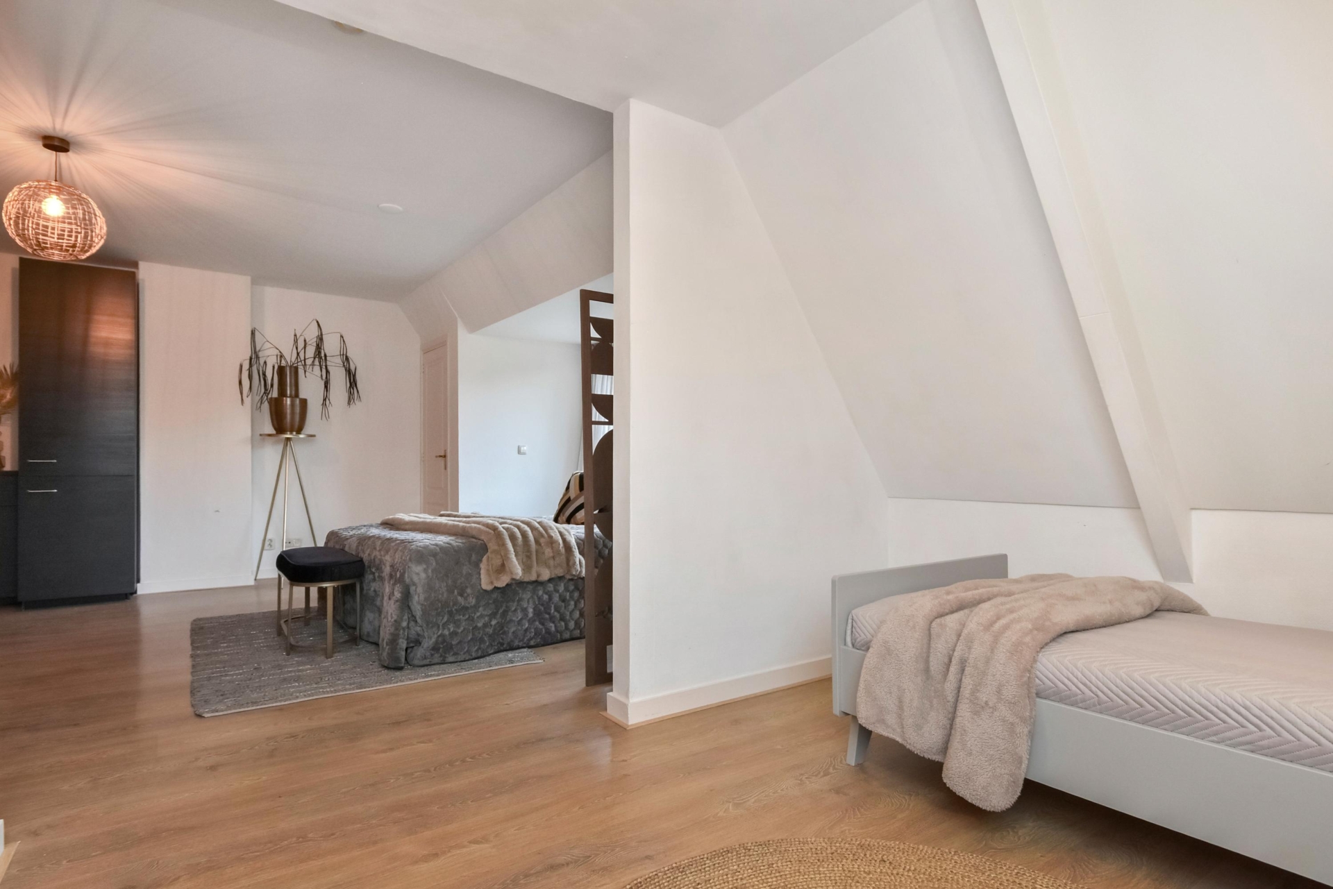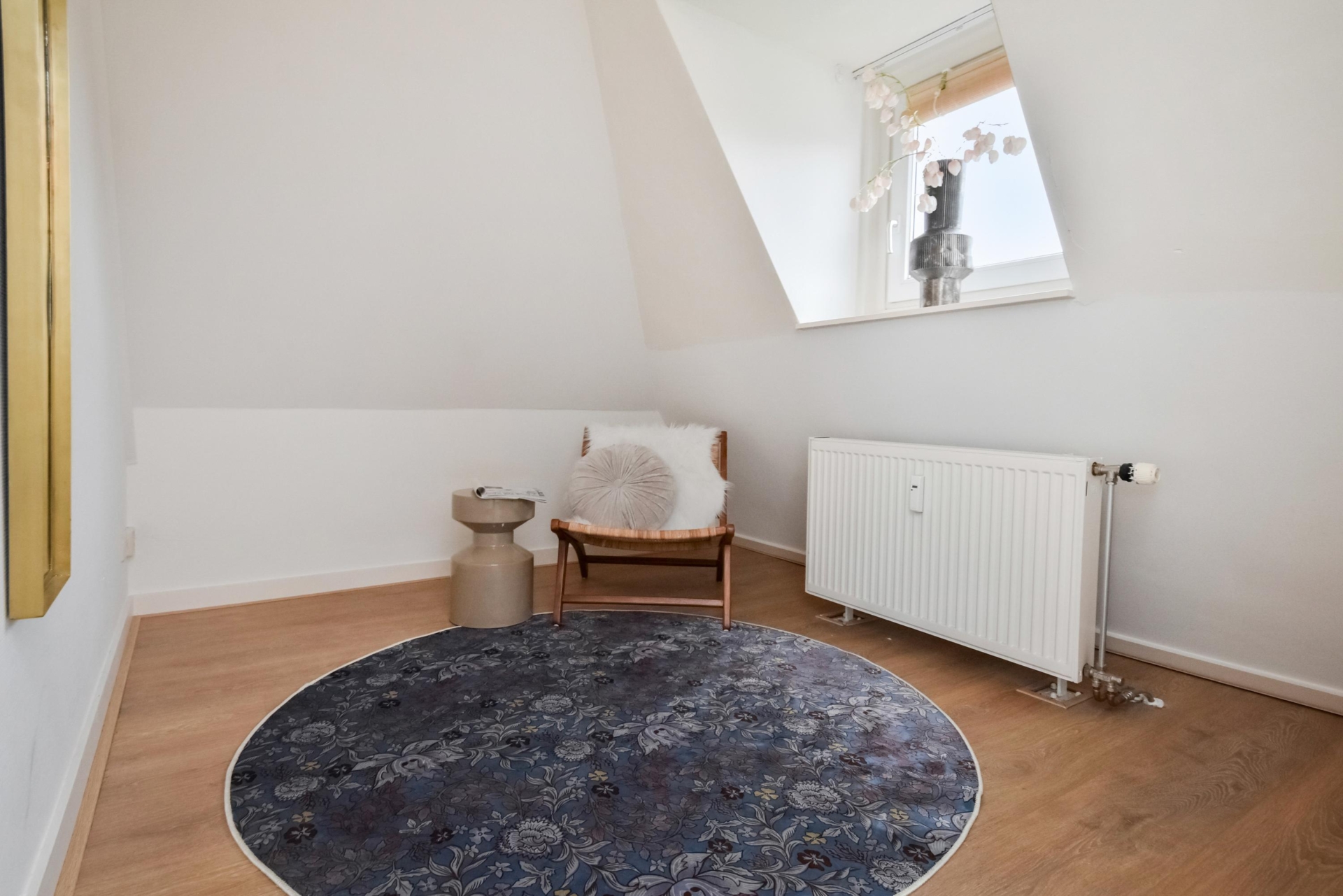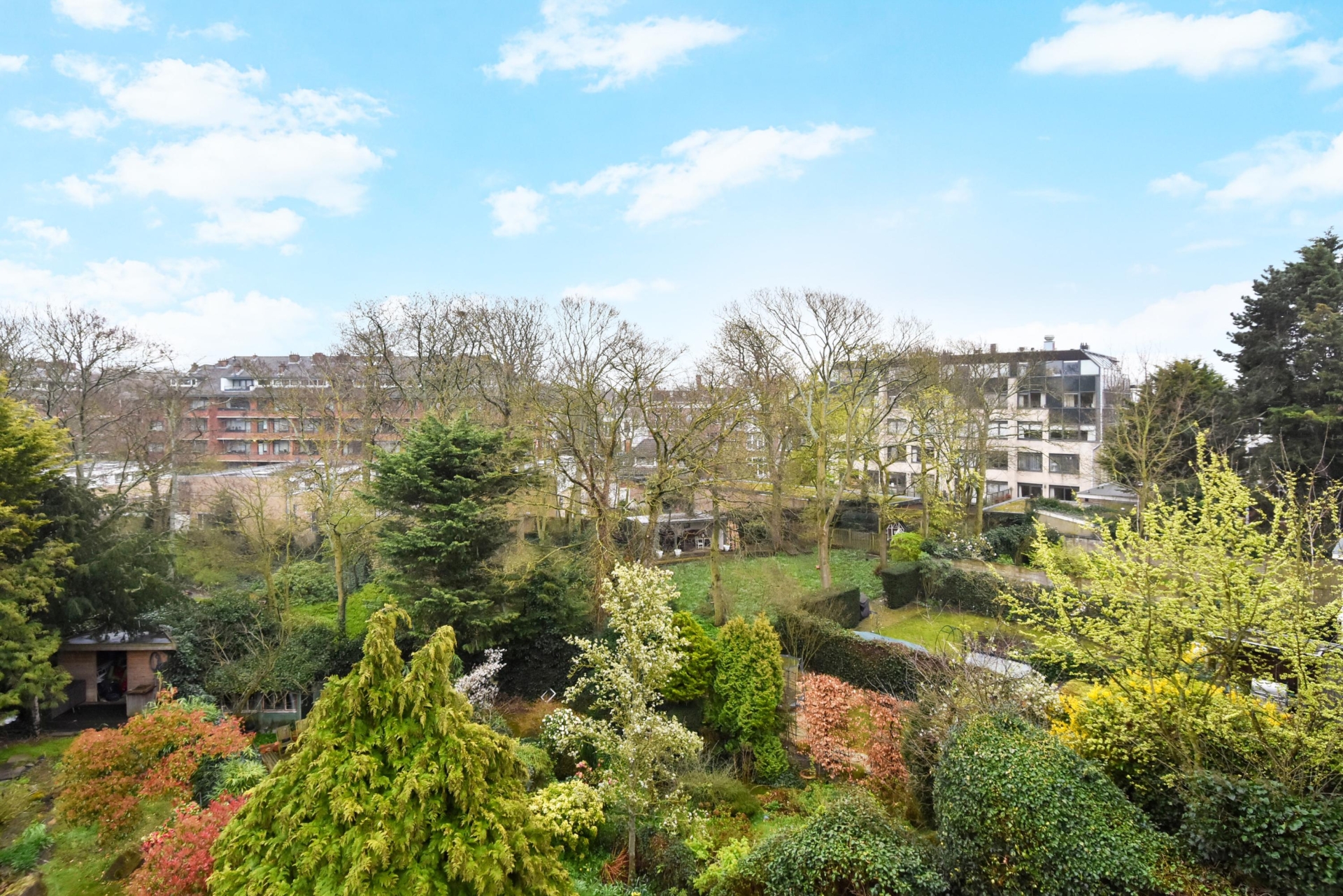 Aan de achterzijde ligt nog een ruime slaapkamer met openslaande deuren naar het ruime achterbalkon waar het heerlijk vertoeven is in de ochtend- en middag zon. Ook hier kijk je vrij weg over het groen. Deze verdieping beschikt daarnaast over een badkamer met douche, wastafelmeubel en toilet, en een extra zijkamer.