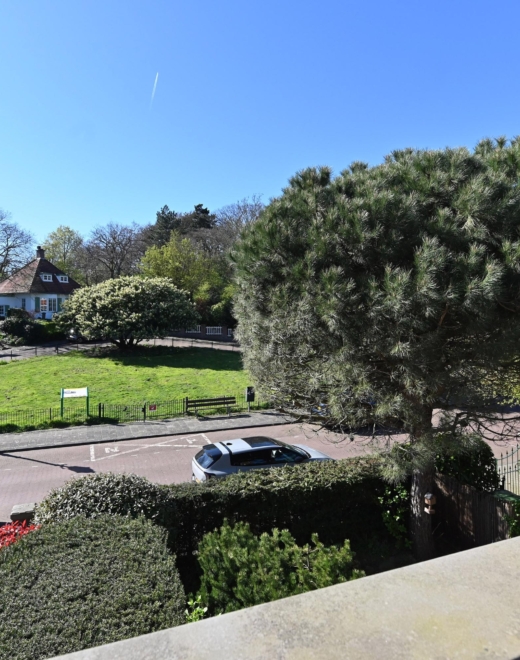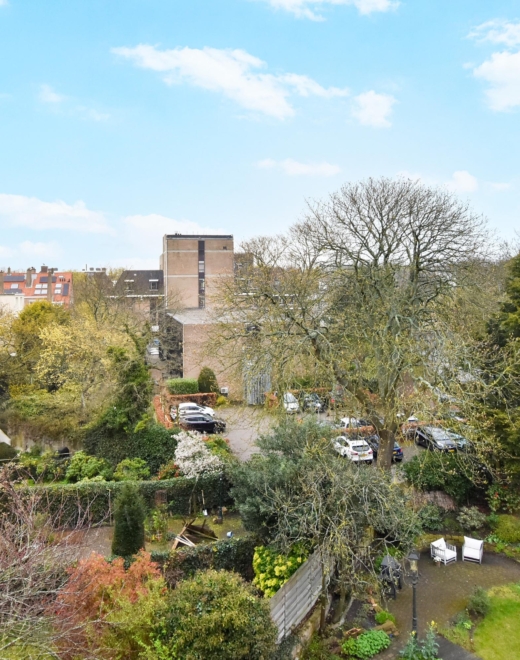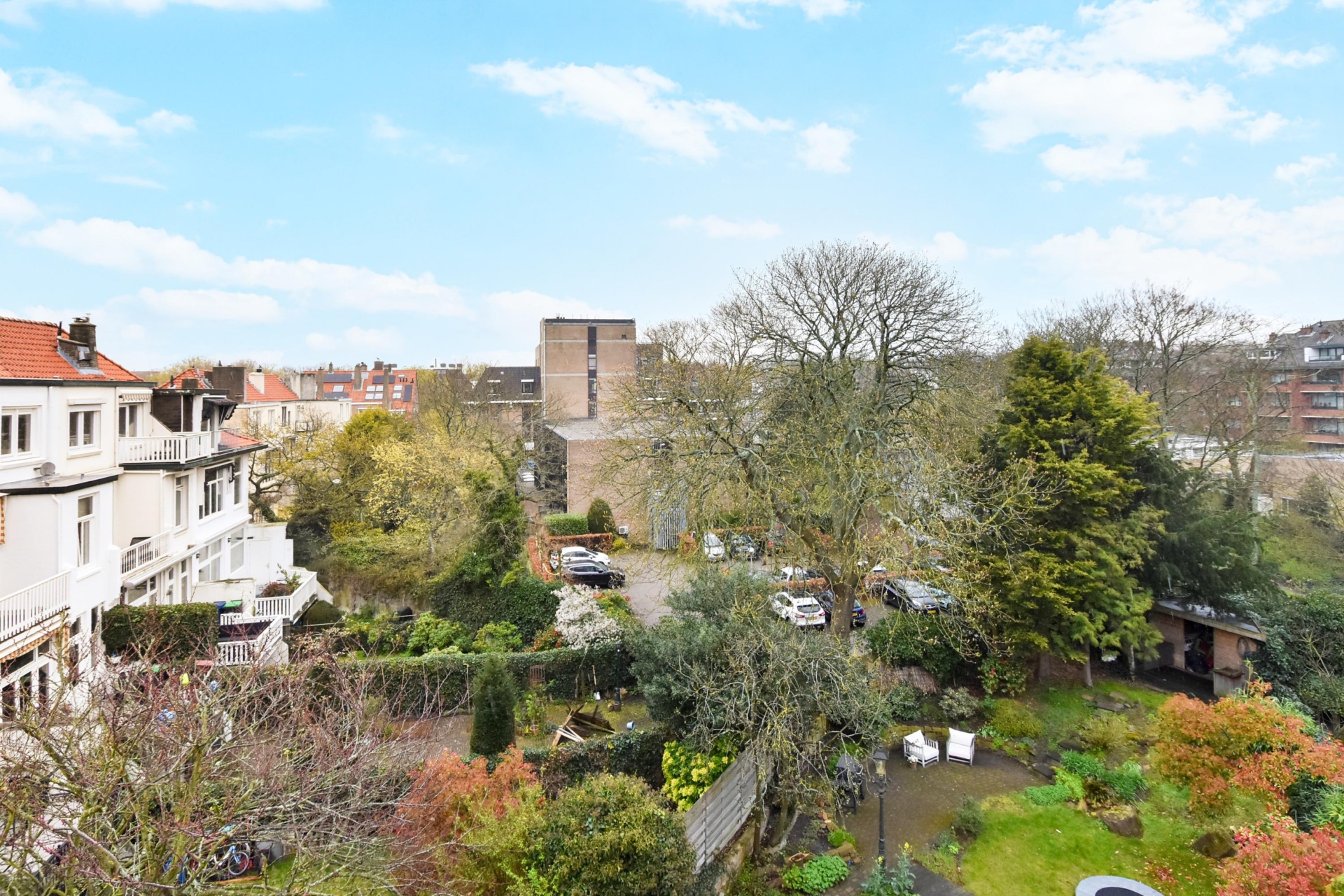 At the front, there is a generous bedroom with its own kitchenette and an en-suite bathroom fitted with a washbasin, shower, design radiator, and toilet. The bay window allows for an abundance of natural light and offers pleasant views over the square. Adjacent is a side room, also benefiting from unobstructed views of the greenery.