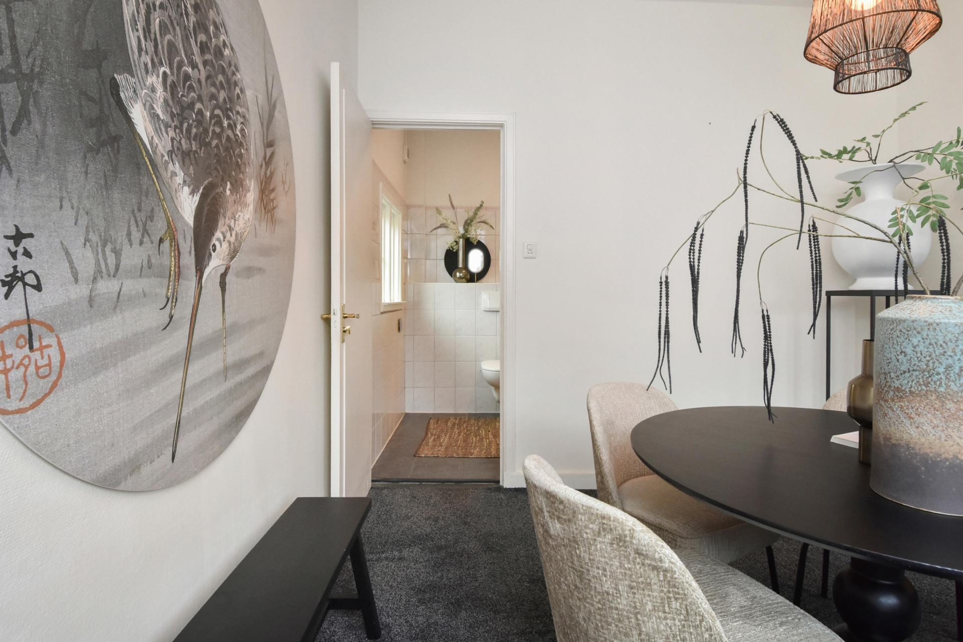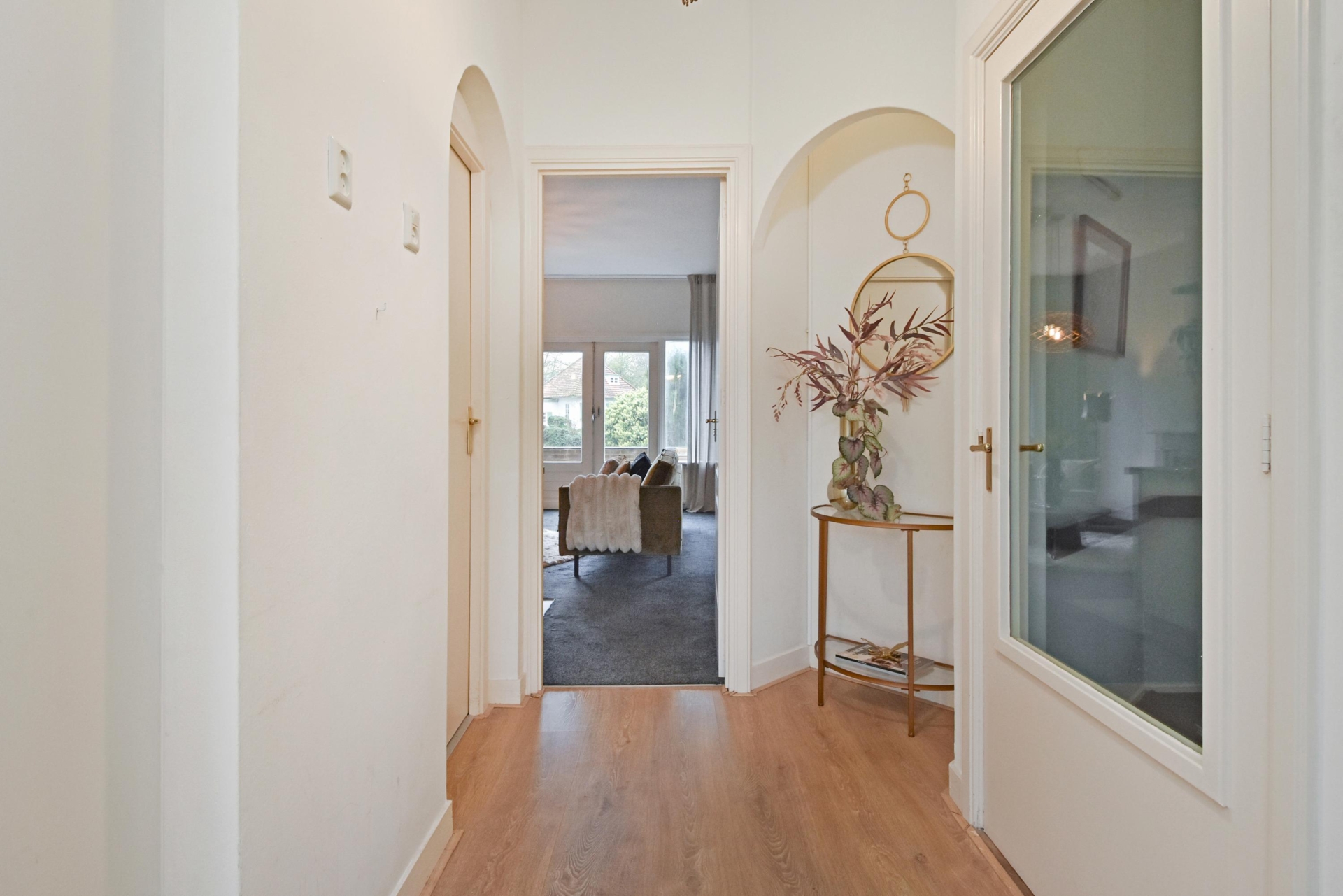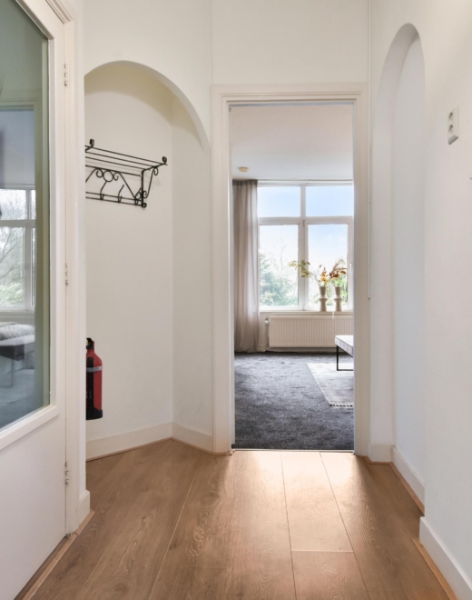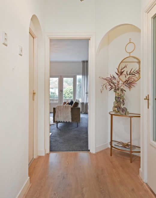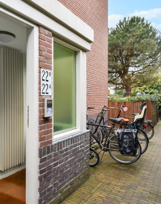 Je betreedt de woning via een afgesloten hek naar het gezamenlijke pad, met praktische ruimte voor fietsen. De entree van de woning verwelkomt je in een verzorgde hal. Via je eigen opgang bereik je de trap met fraai houtwerk en een charmant bordes, die leidt naar de eerste etage.