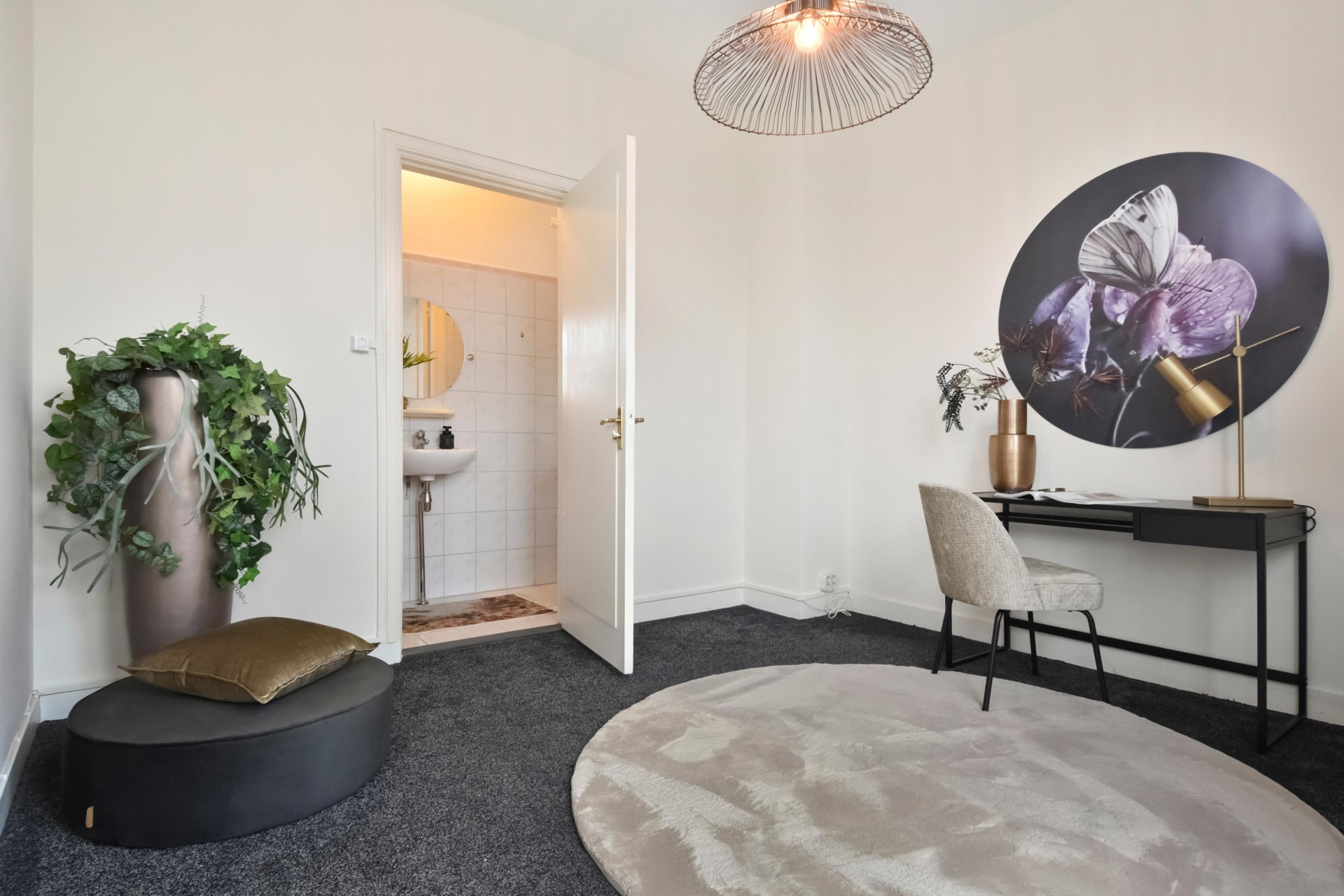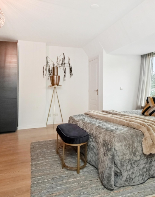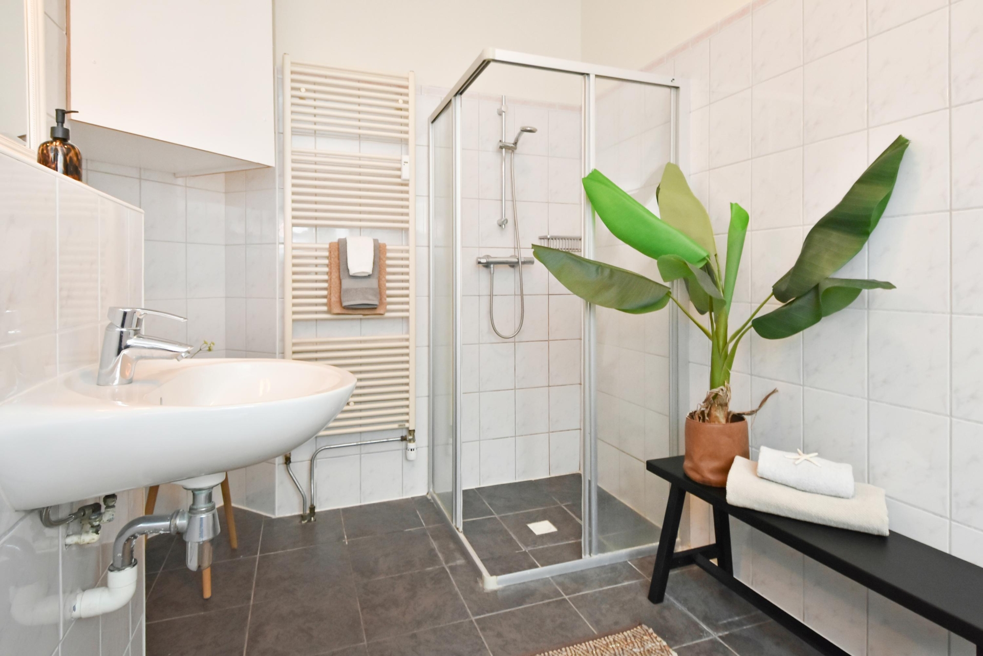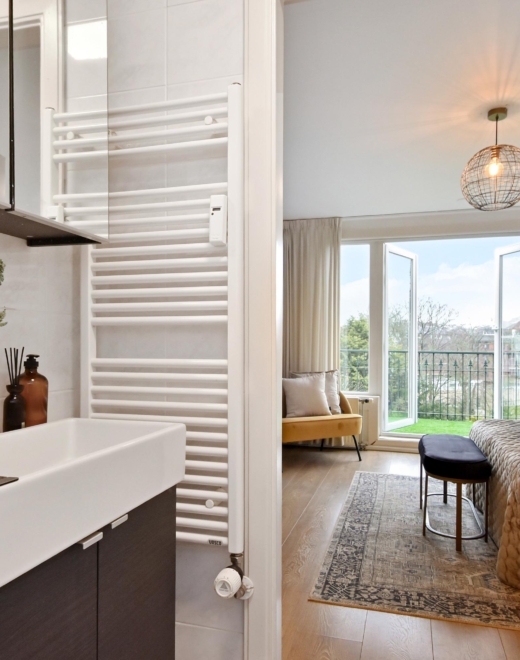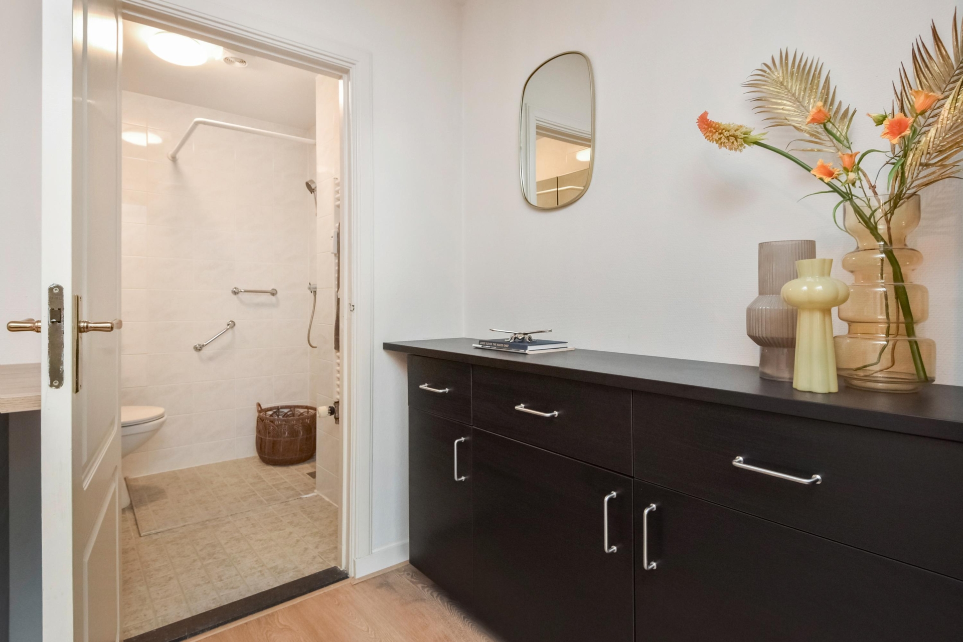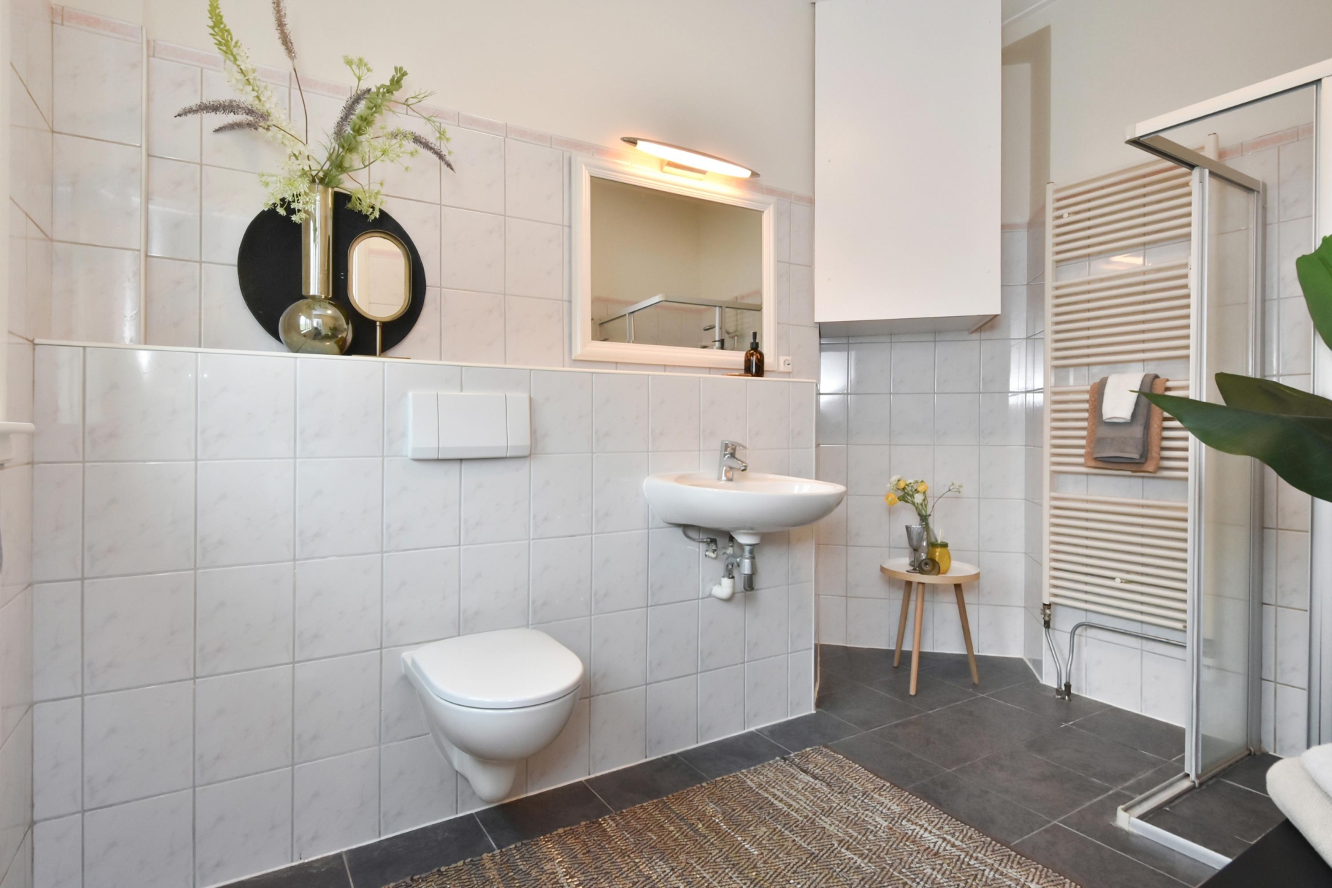 At the rear, you will find a generous bedroom with its own pantry, currently fitted with a kitchenette including an oven, electric hob, recirculation hood, and sink, but equally suitable as a walk-in closet. From this room, you enjoy wide, green views over the surrounding gardens. In addition, there is a rear-side room with access to a second bathroom, equipped with a spacious walk-in shower, washbasin, wall-mounted toilet, and radiator.