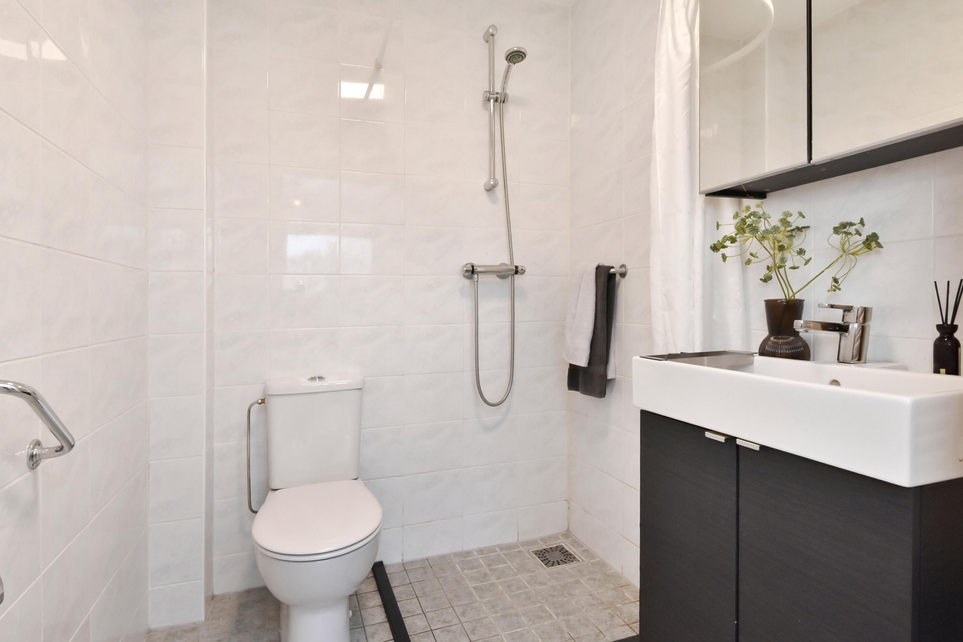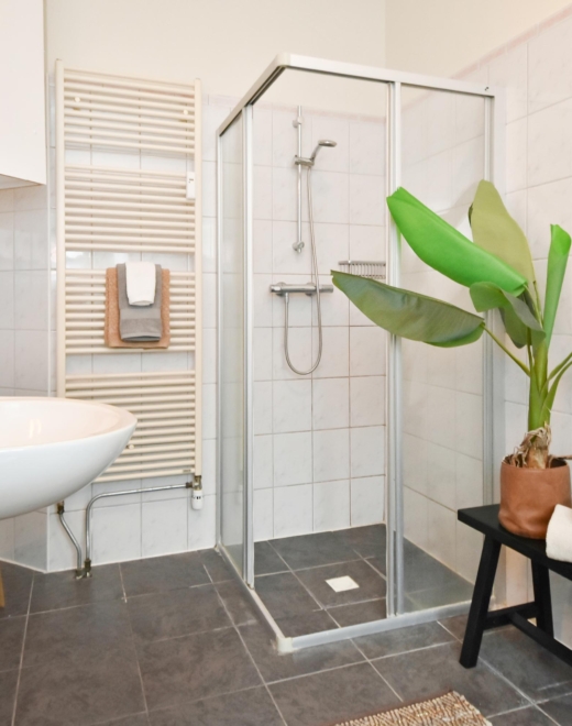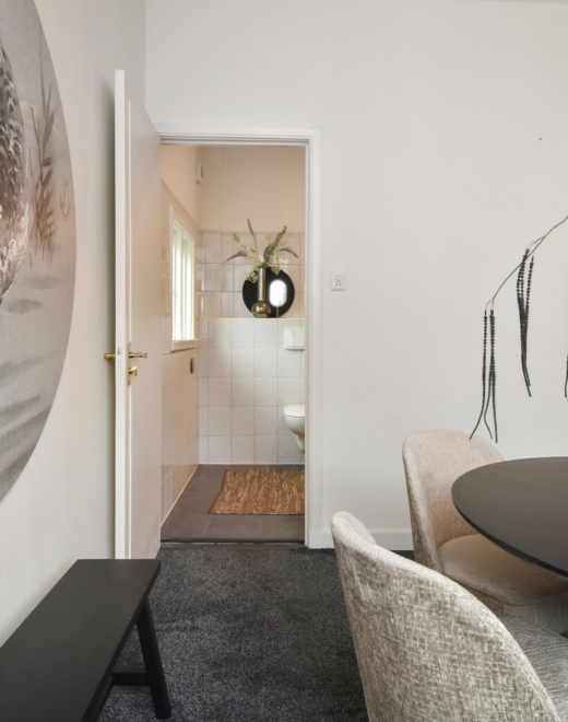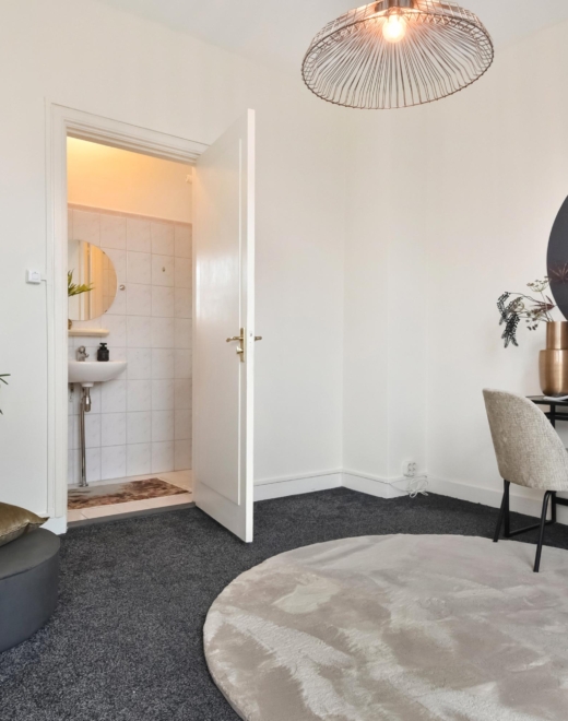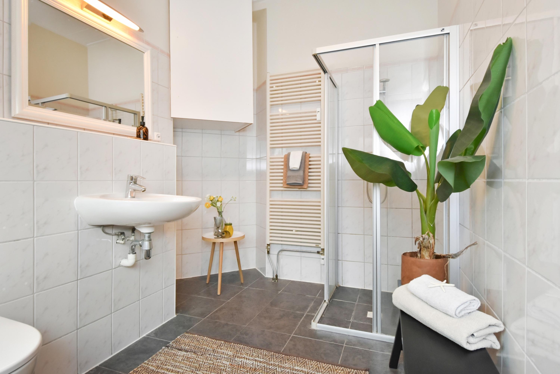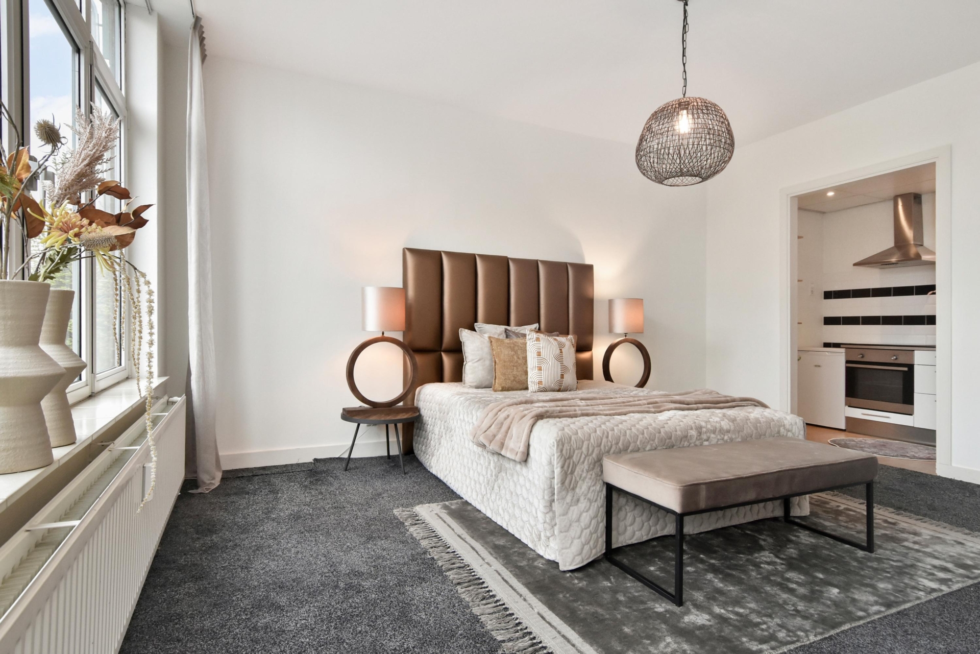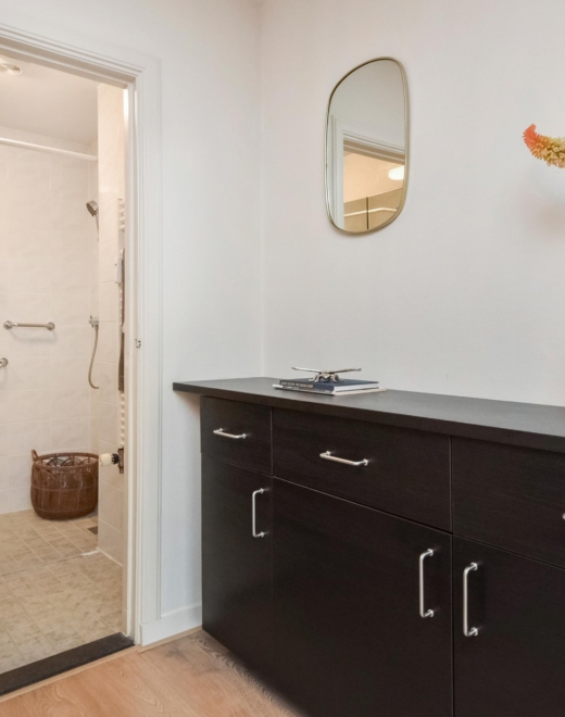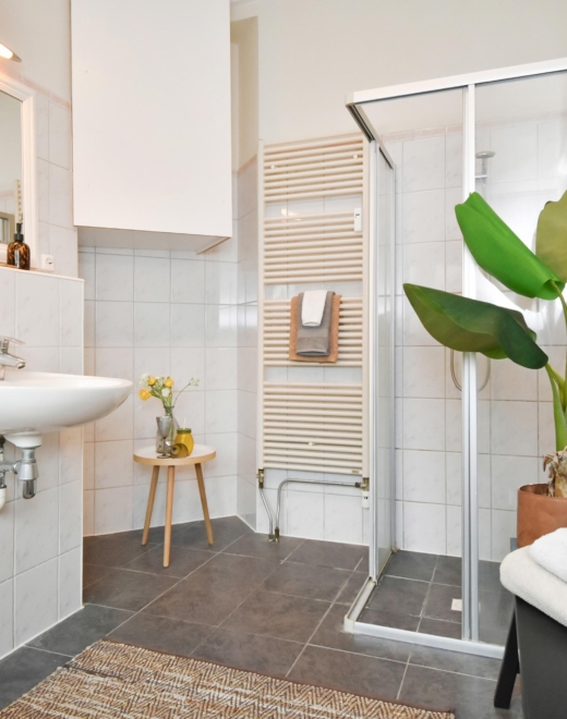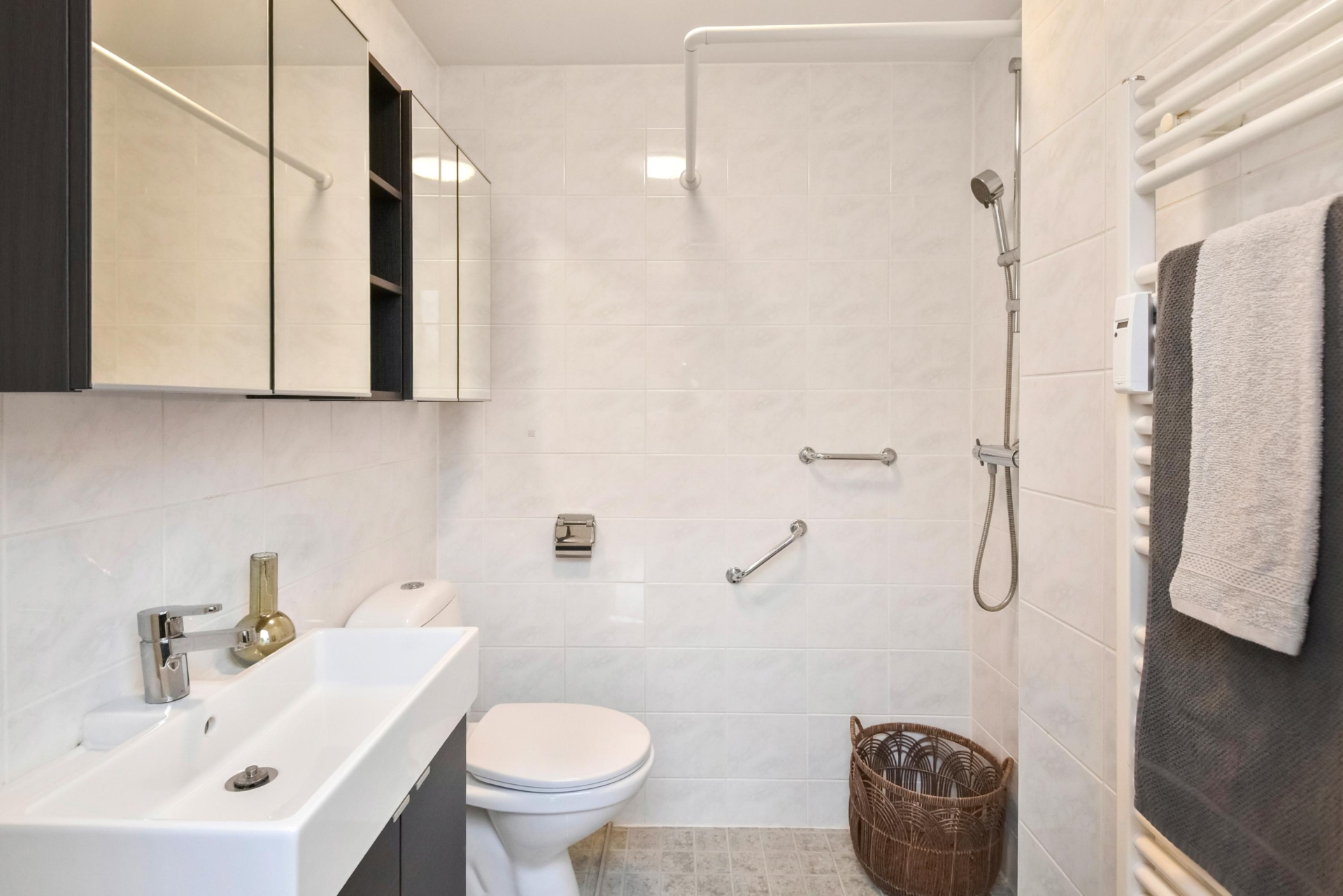 At the rear, you will find a generous bedroom with its own pantry, currently fitted with a kitchenette including an oven, electric hob, recirculation hood, and sink, but equally suitable as a walk-in closet. From this room, you enjoy wide, green views over the surrounding gardens. In addition, there is a rear-side room with access to a second bathroom, equipped with a spacious walk-in shower, washbasin, wall-mounted toilet, and radiator.