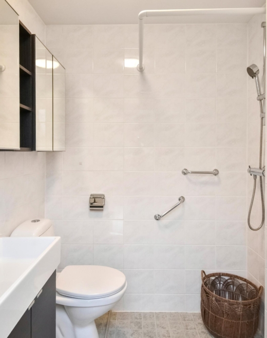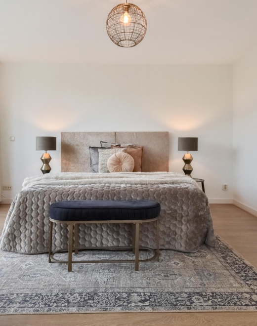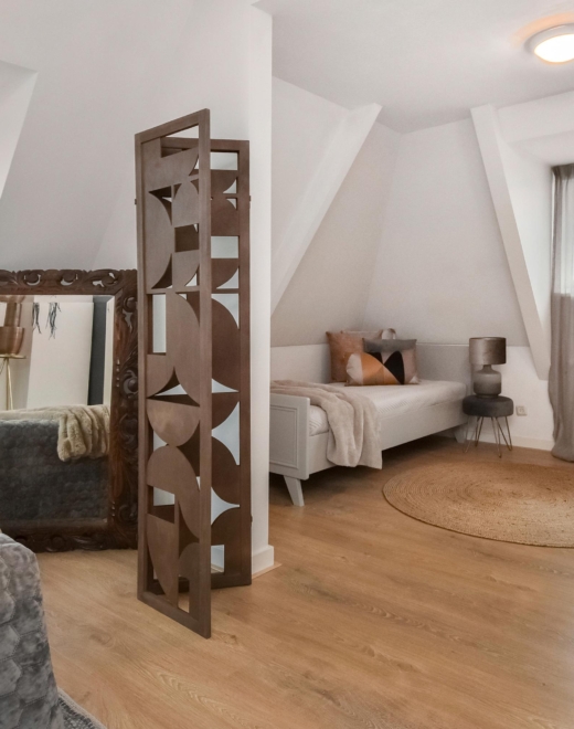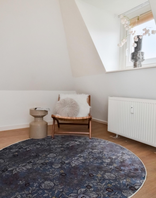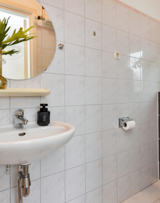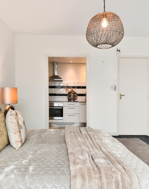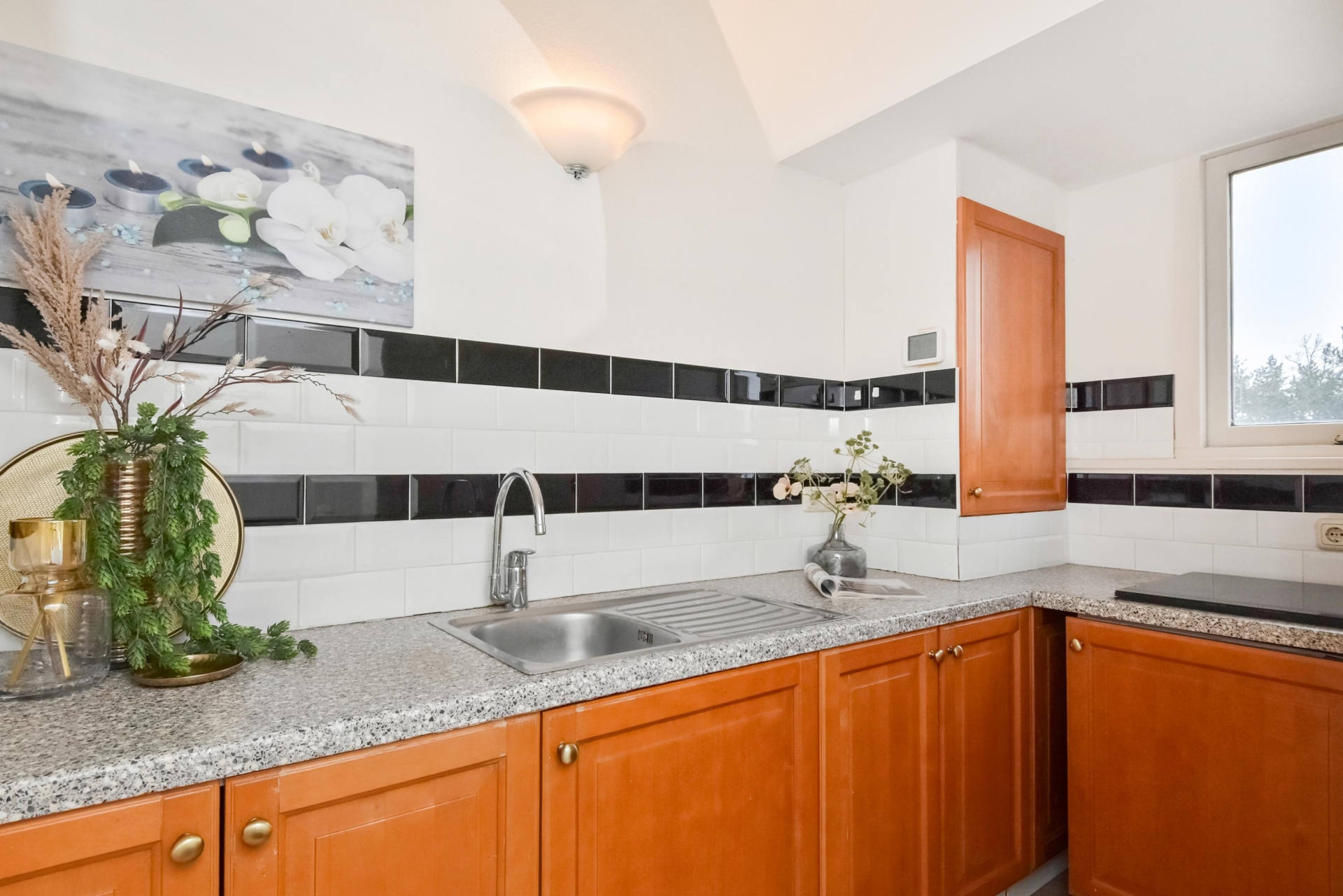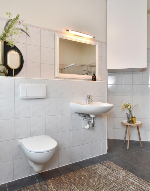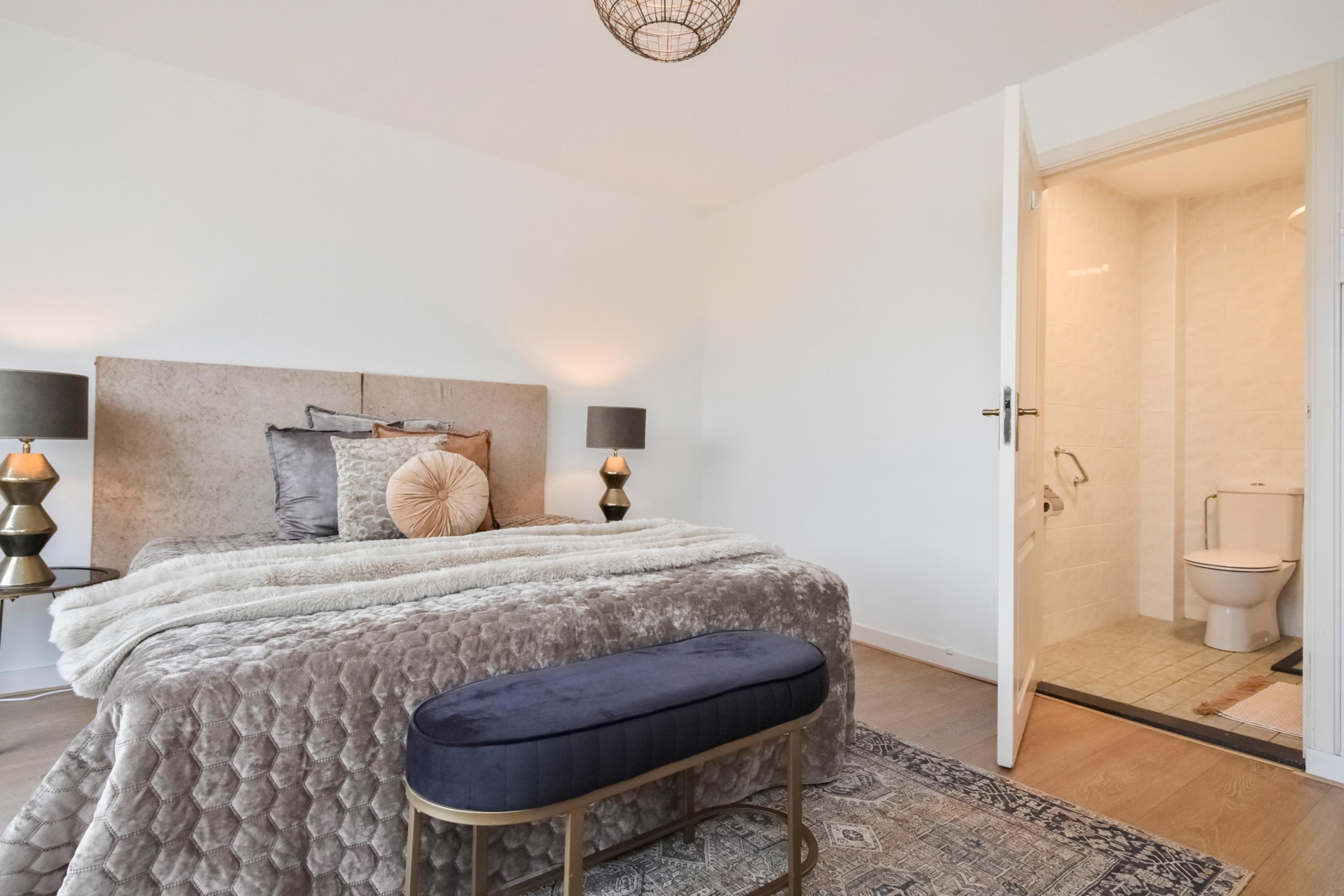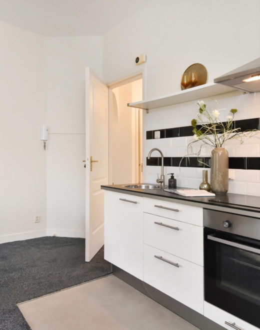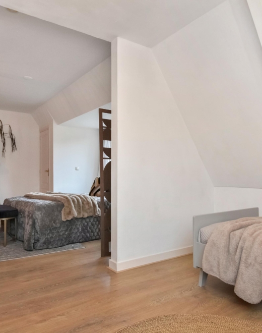 At the rear, you will find a generous bedroom with its own pantry, currently fitted with a kitchenette including an oven, electric hob, recirculation hood, and sink, but equally suitable as a walk-in closet. From this room, you enjoy wide, green views over the surrounding gardens. In addition, there is a rear-side room with access to a second bathroom, equipped with a spacious walk-in shower, washbasin, wall-mounted toilet, and radiator.