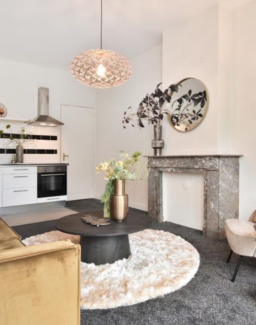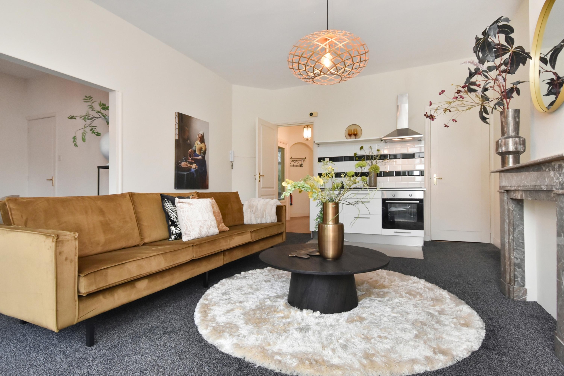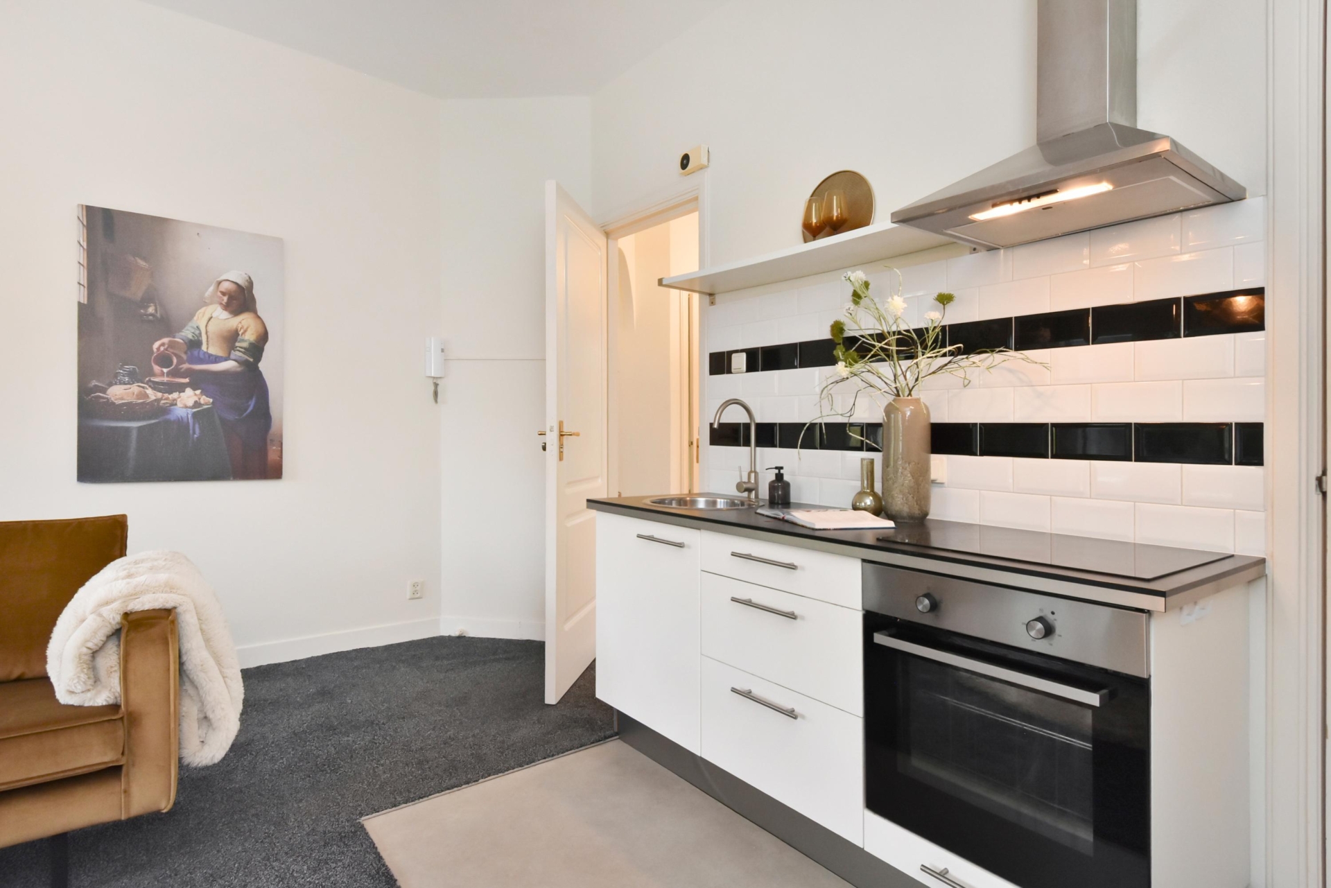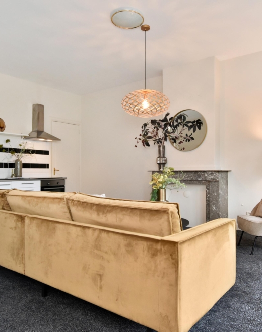 De woonkamer heeft een karakteristieke uitstraling dankzij de originele schouw en is uitgerust met een keukenblok met oven, elektrische kookplaat, recirculatiekap en een praktische vaste kast.