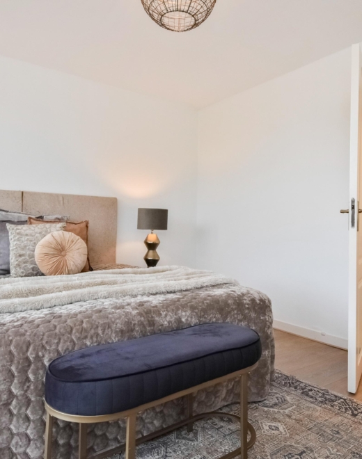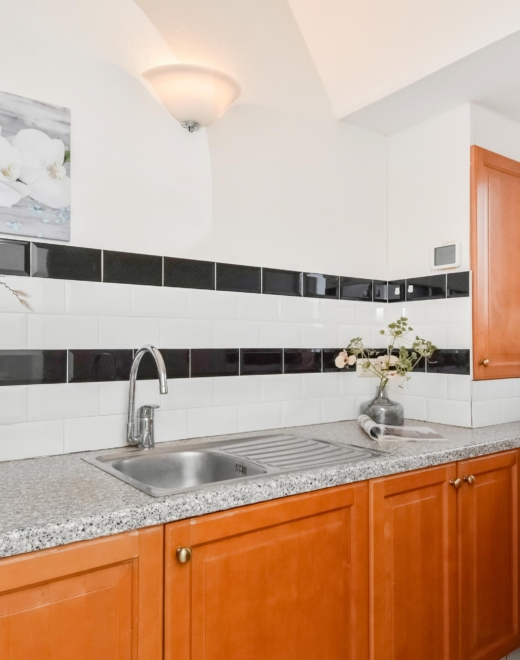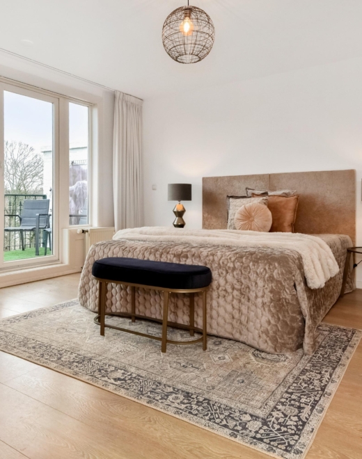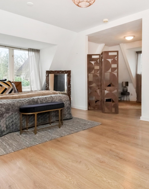 Aan de achterzijde vind je een royale slaapkamer met een eigen pantry, nu voorzien van een keukenblok, oven, elektrische kookplaat, recirculatiekap en gootsteen maar ook ideaal als walk-in closet. Vanuit deze kamer heb je een wijds en groen uitzicht over de achterliggende tuinen. Daarnaast is er nog een achterzijkamer met toegang tot een tweede badkamer, uitgerust met een ruime inloopdouche, wastafel, vrijhangend toilet en radiator.