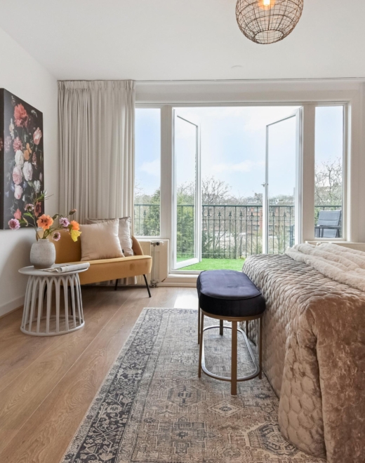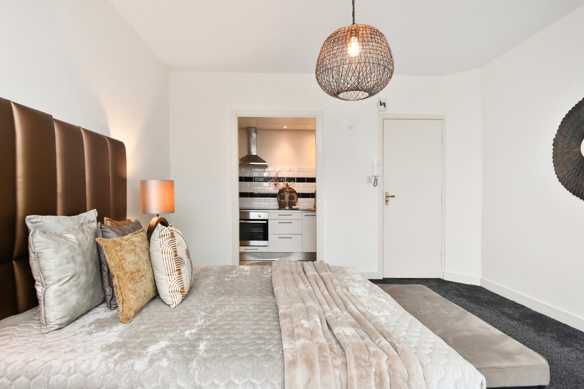 Aan de voorzijde bevindt zich een royale slaapkamer met een eigen keukenblok en een badkamer voorzien van wastafel, douche, designradiator en toilet. De erker zorgt hier voor extra licht en biedt een mooi uitzicht over het voorgelegen plein. Daarnaast is er een zijkamer met eveneens vrij uitzicht op het groen.