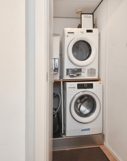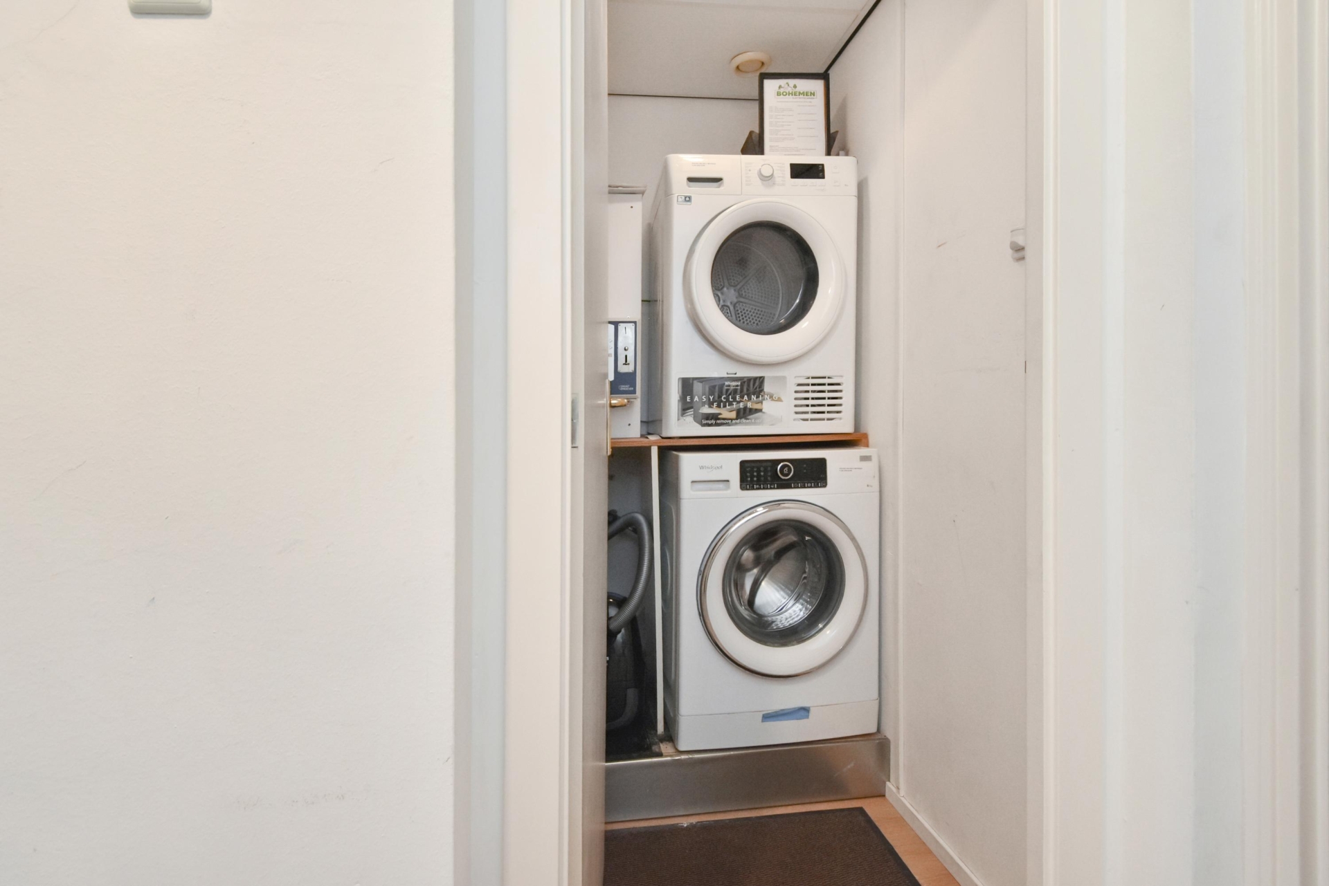 De overloop is slim ingedeeld als inpandige ruimte met opstelling voor elektra, wasmachine en droger.