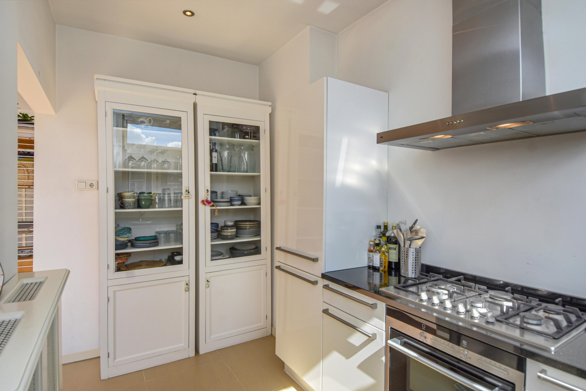 De halfopen keuken sluit perfect aan bij de leefruimte en is voorzien van alle gemakken: een Bosch-vaatwasser, Siemens oven en combimagnetron, een 5-pits gaskookplaat met wokbrander, wasemkap, grote koelkast en aparte vriezer – ideaal voor kookliefhebbers!