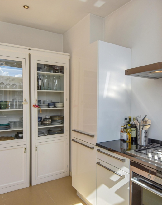 The semi-open kitchen seamlessly connects to the living space and is fully equipped with modern conveniences: a Bosch dishwasher, Siemens oven and combination microwave, 5-burner gas hob with wok burner, extractor hood, large fridge, and separate freezer – ideal for passionate cooks.