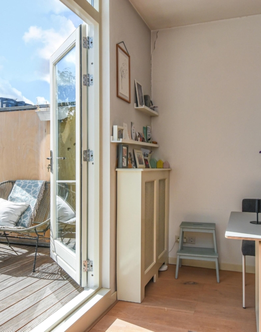 Upon entering the bright and spacious living and dining area, you are immediately embraced by warm natural light. At the front, a charming balcony offers a delightful outdoor spot, while at the rear, doors open onto a sunny southeast-facing terrace – a perfect place to relax or enjoy al fresco dining.