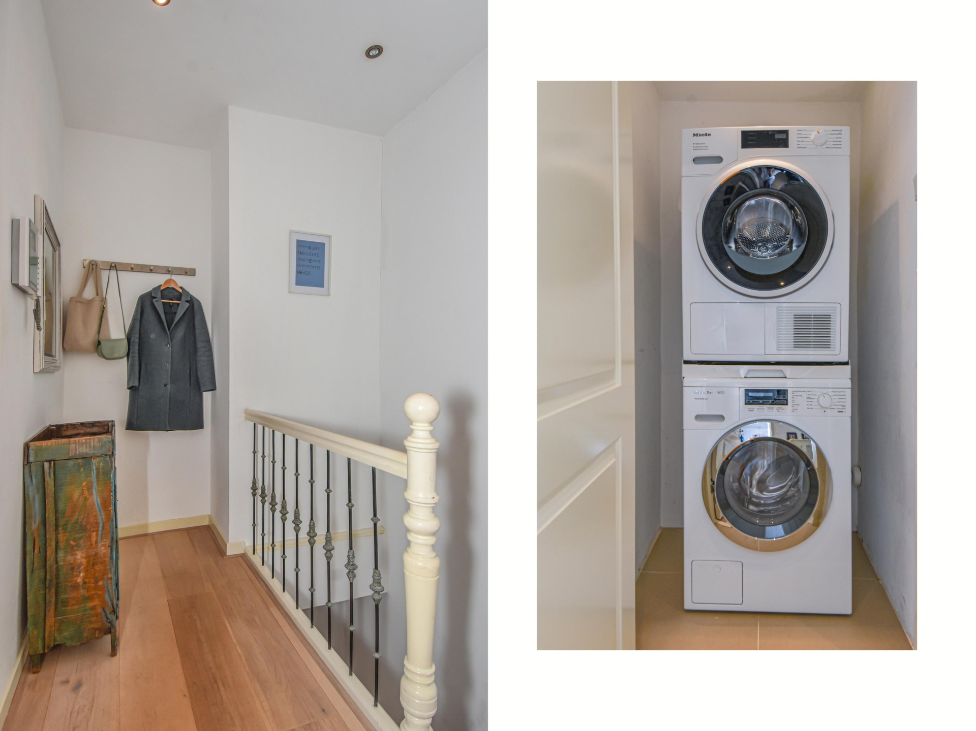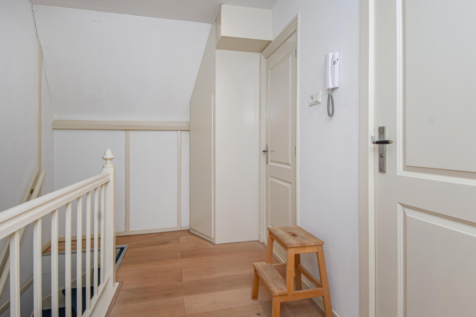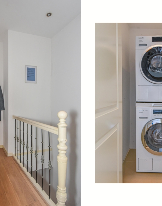 Binnentrap naar de 2e etage. Op de overloop vind je een toilet met fontein, een handige kast met wasmachine- en drogeraansluiting en een videofooninstallatie.