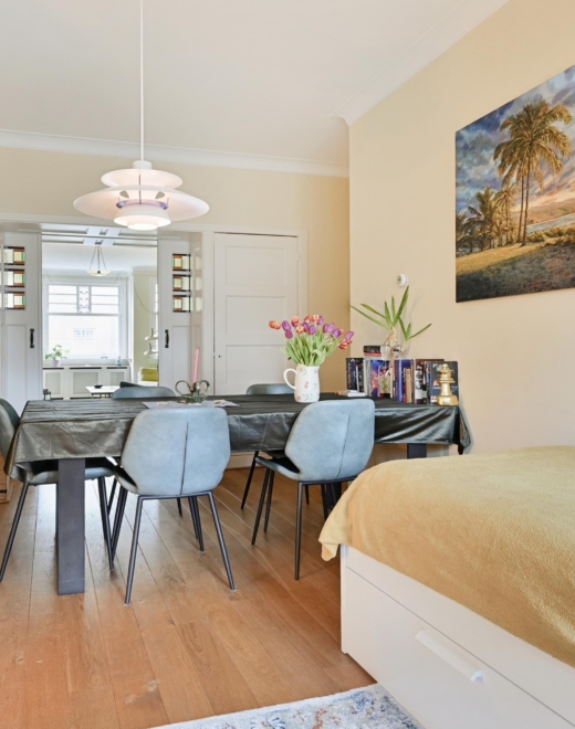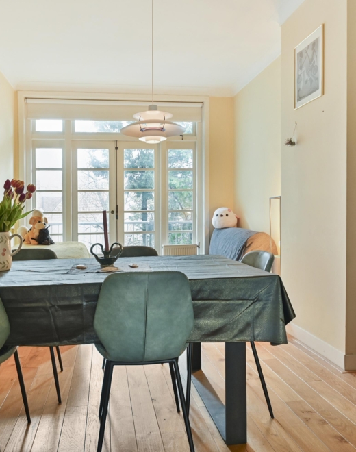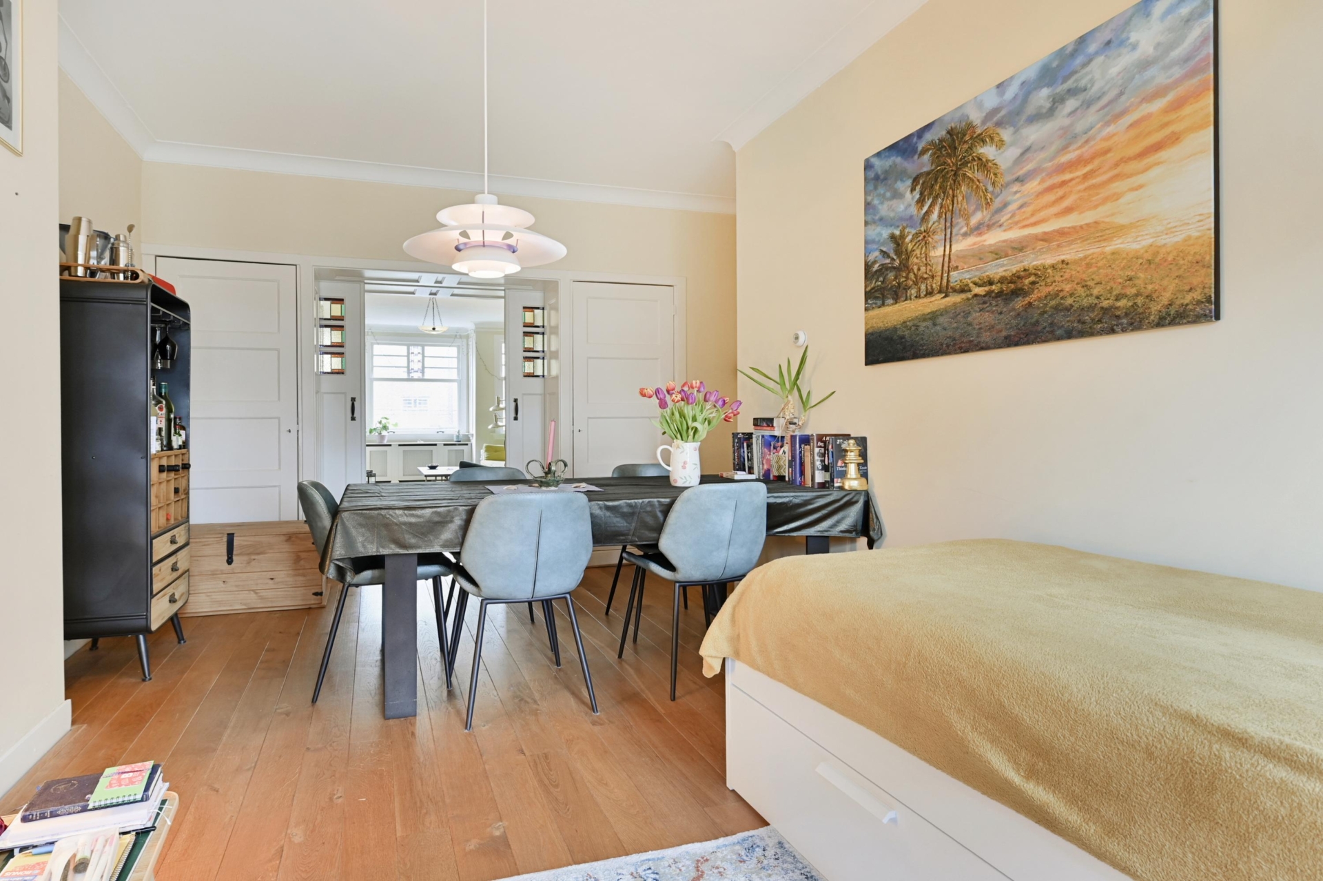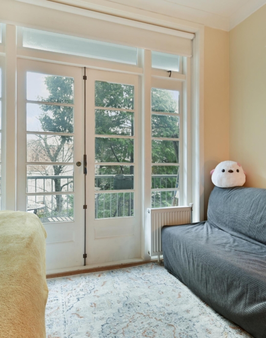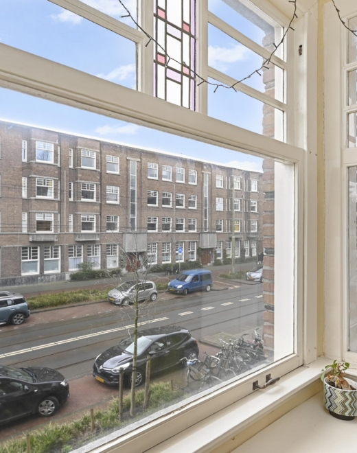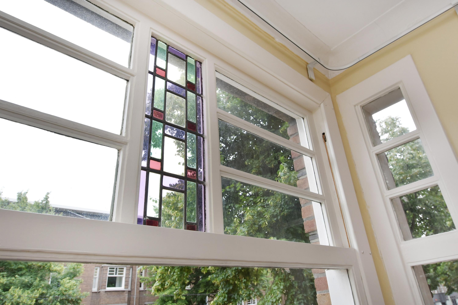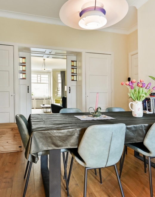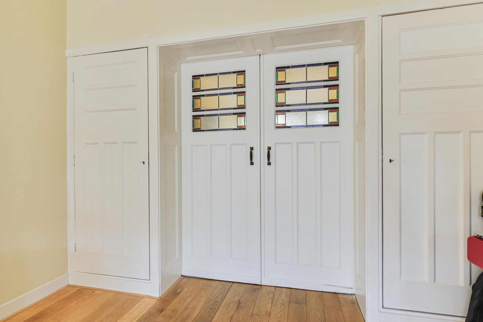 Je komt het appartement binnen via een afgesloten portiek. Trap naar de 1e etage. Je bereikt het entree van het appartement en de ruime hal, die toegang biedt tot alle vertrekken. Aan de voorzijde ligt de lichte woonkamer met een karakteristieke erker en originele glas-in-lood details, die direct de sfeer van de jaren ’30 uitstralen. Via de en-suite schuifdeuren kom je in de eetkamer, waar openslaande deuren toegang geven tot het rustige balkon aan de achterzijde.