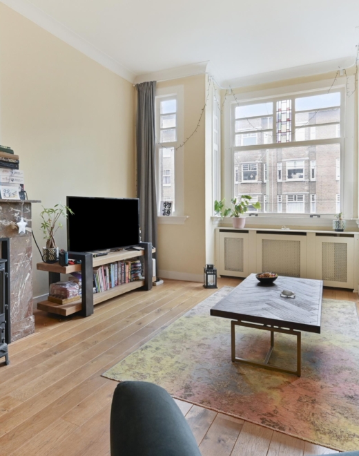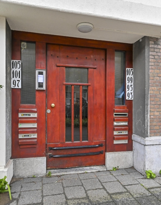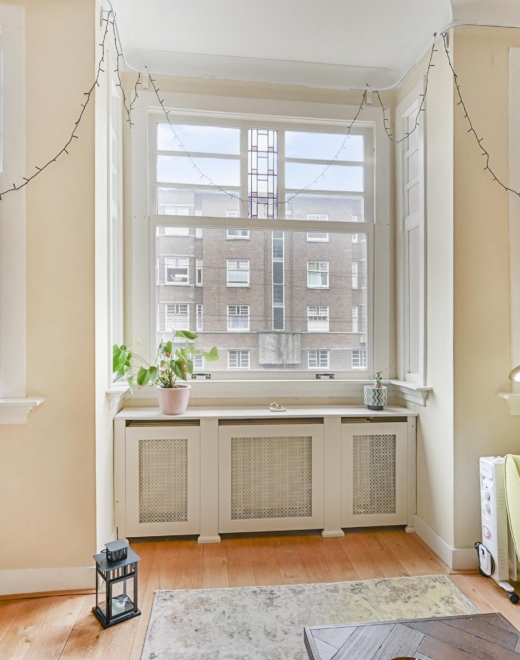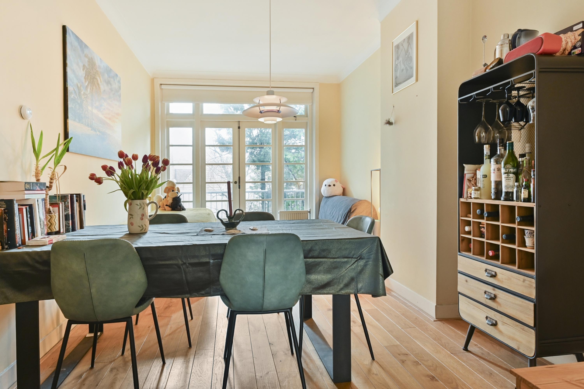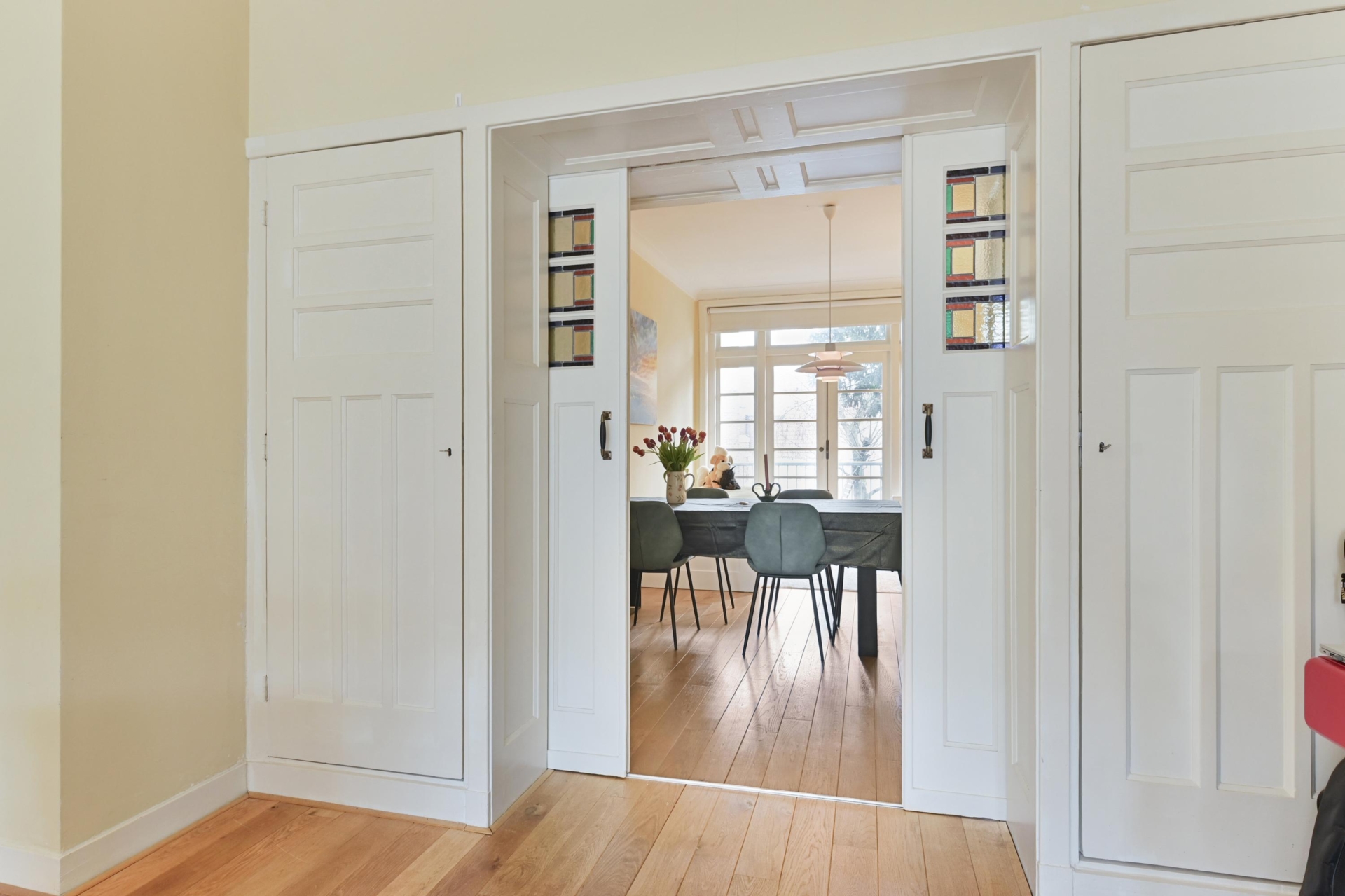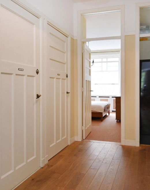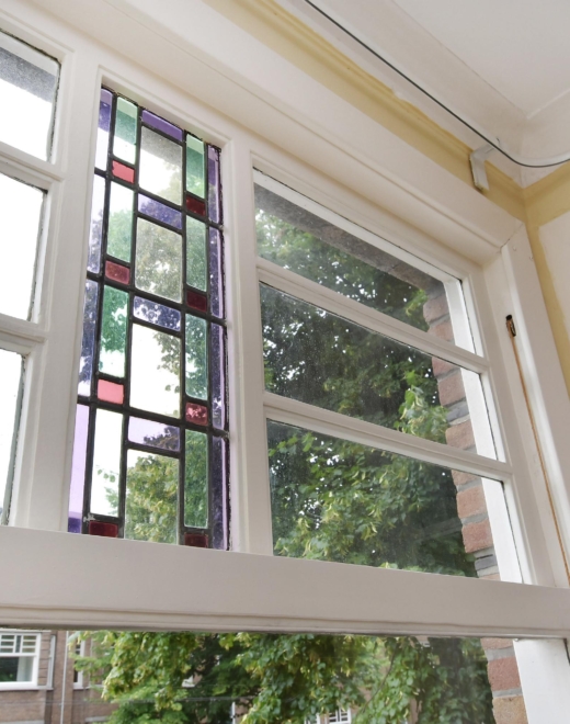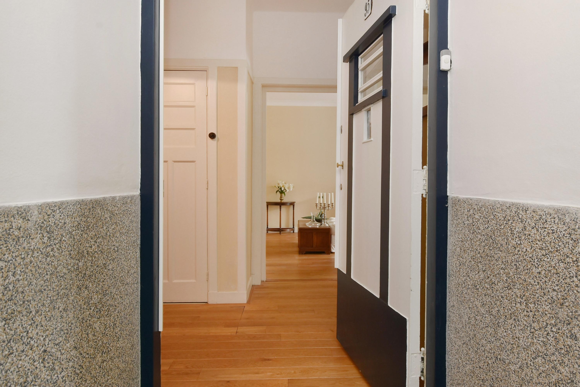 Je komt het appartement binnen via een afgesloten portiek. Trap naar de 1e etage. Je bereikt het entree van het appartement en de ruime hal, die toegang biedt tot alle vertrekken. Aan de voorzijde ligt de lichte woonkamer met een karakteristieke erker en originele glas-in-lood details, die direct de sfeer van de jaren ’30 uitstralen. Via de en-suite schuifdeuren kom je in de eetkamer, waar openslaande deuren toegang geven tot het rustige balkon aan de achterzijde.