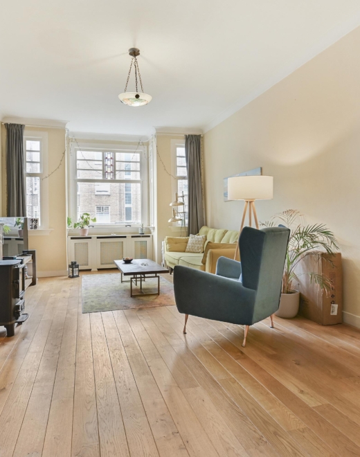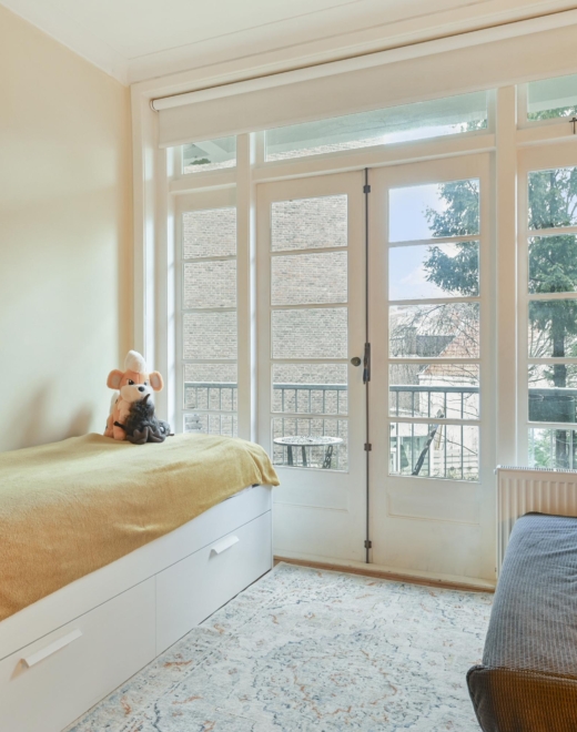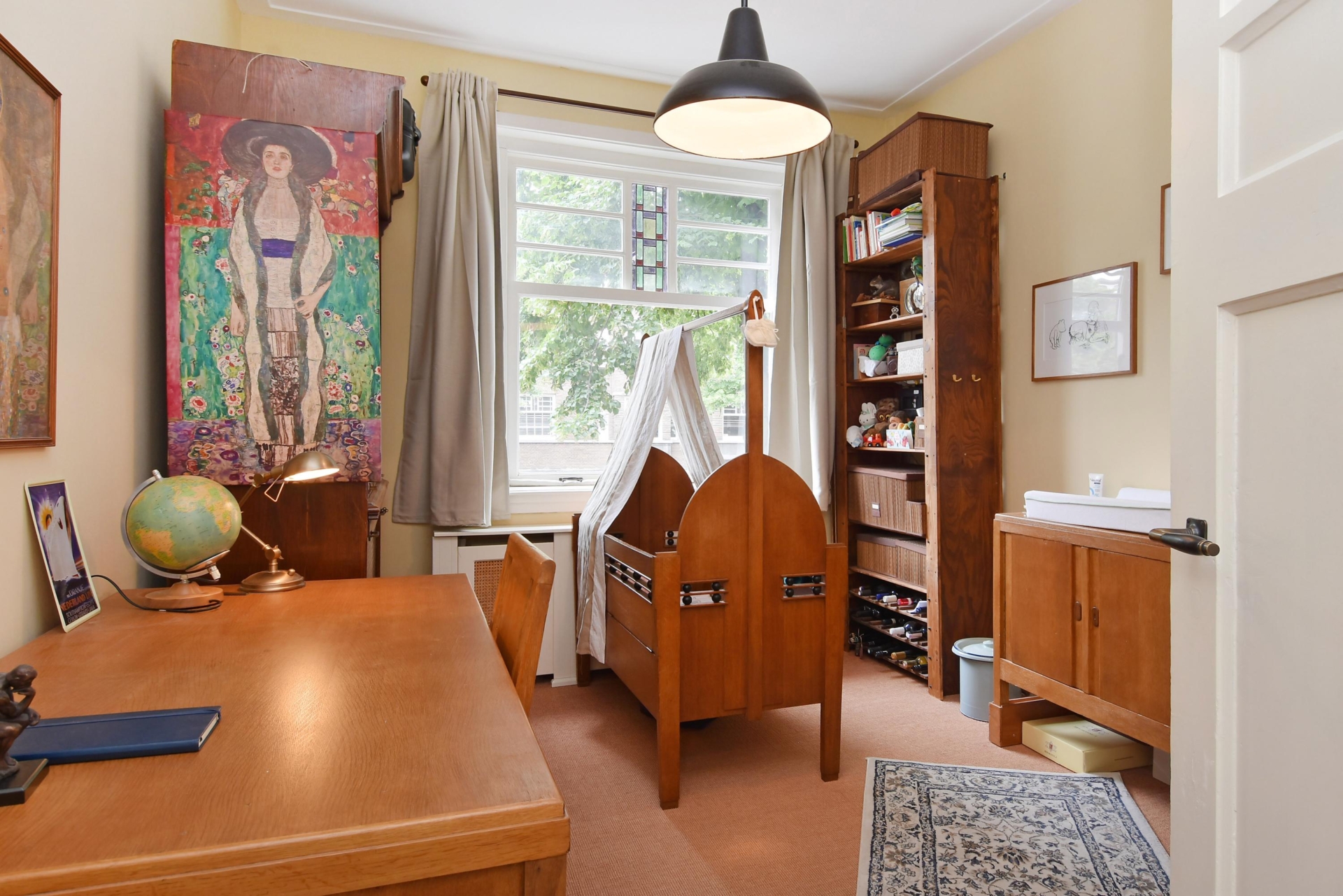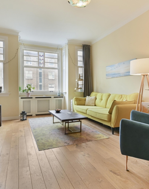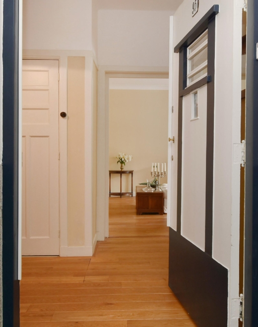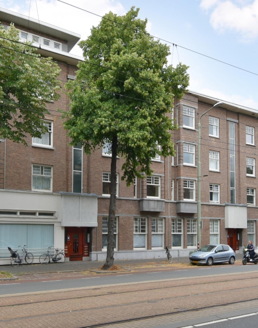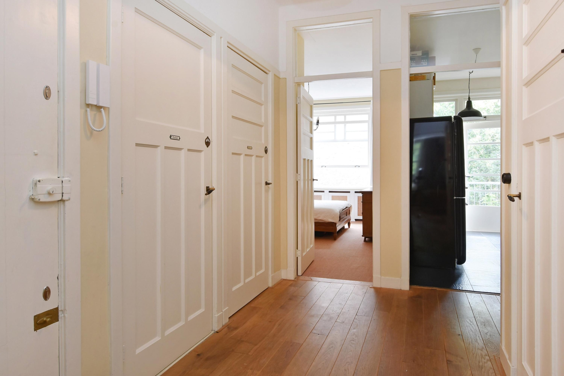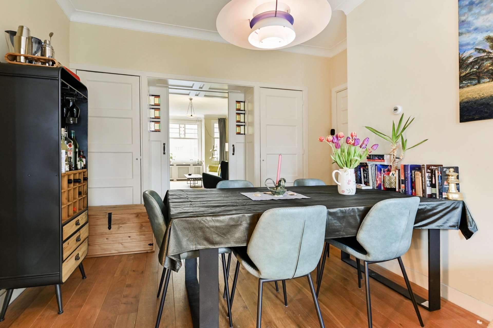 Je komt het appartement binnen via een afgesloten portiek. Trap naar de 1e etage. Je bereikt het entree van het appartement en de ruime hal, die toegang biedt tot alle vertrekken. Aan de voorzijde ligt de lichte woonkamer met een karakteristieke erker en originele glas-in-lood details, die direct de sfeer van de jaren ’30 uitstralen. Via de en-suite schuifdeuren kom je in de eetkamer, waar openslaande deuren toegang geven tot het rustige balkon aan de achterzijde.
