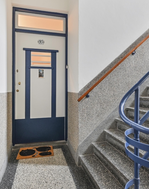 The apartment is accessed via a secure communal entrance. A staircase leads to the first floor, where you reach the entrance to the apartment and the spacious hallway, providing access to all rooms.