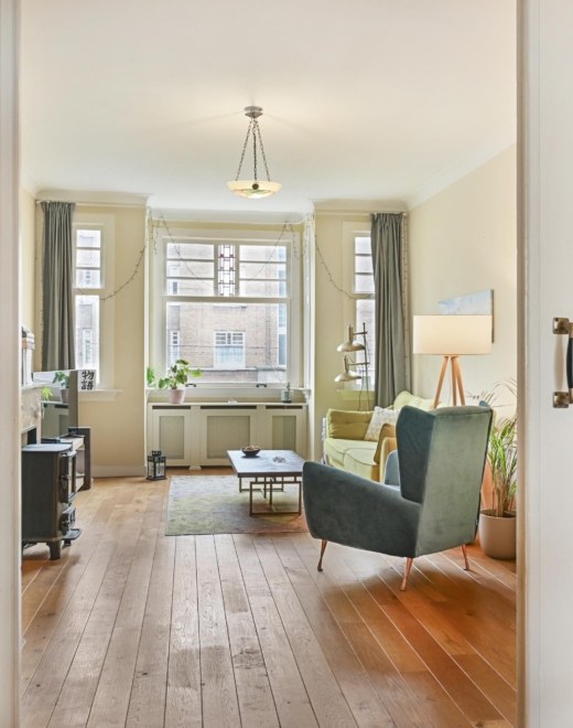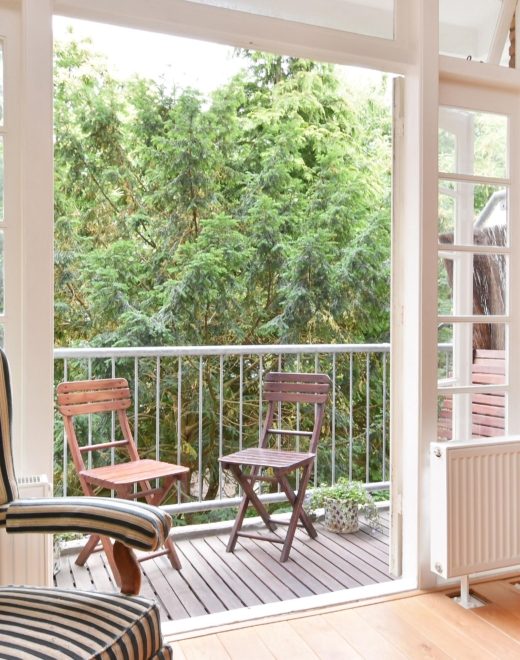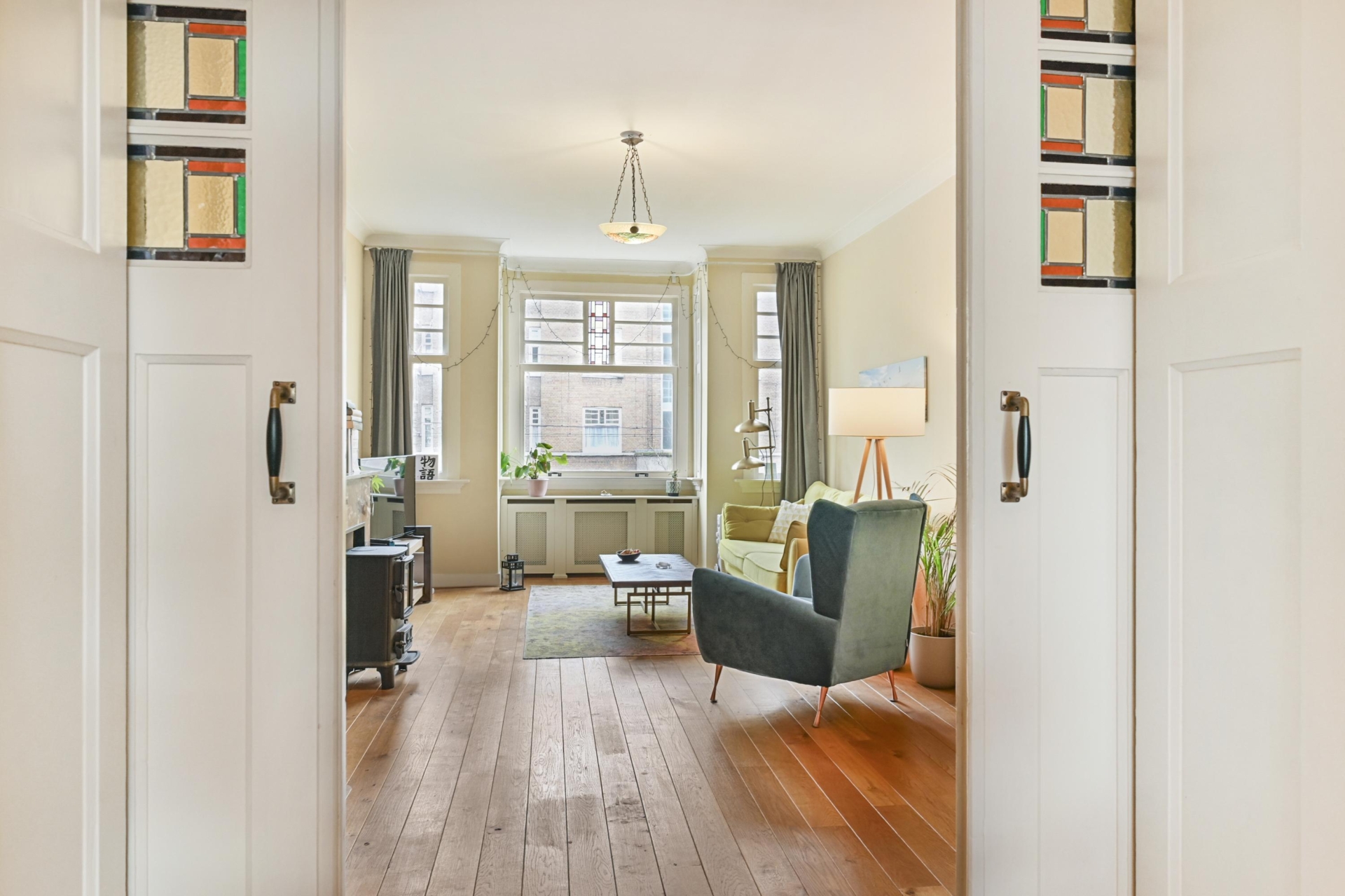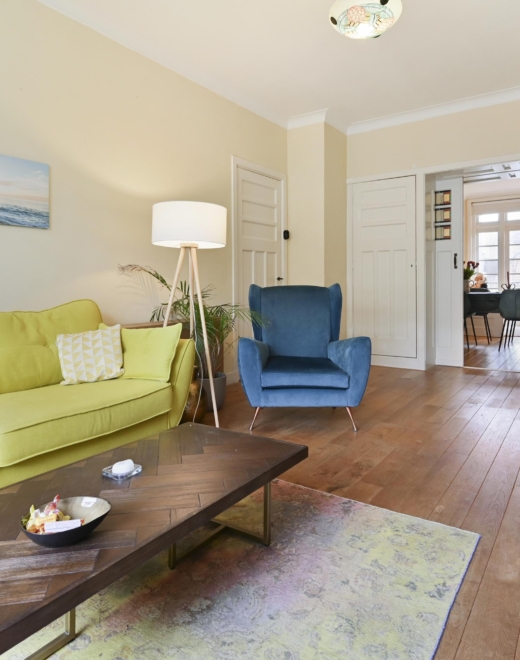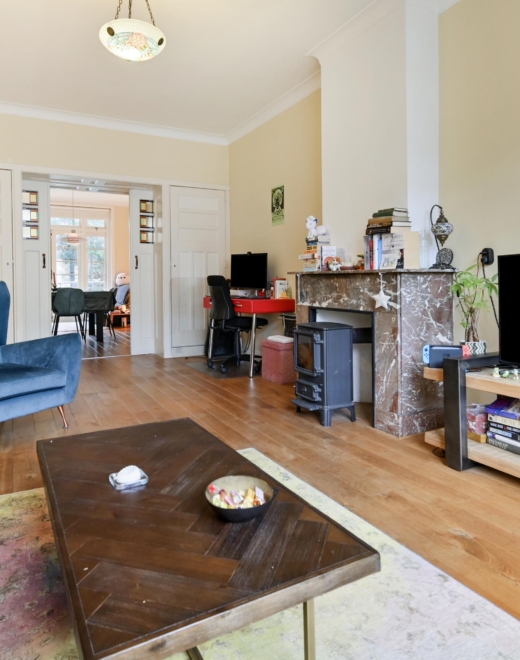 At the front is the bright living room featuring a characteristic bay window and original stained-glass details, immediately evoking the charm of the 1930s. Through the en-suite sliding doors you enter the dining room, where French doors open onto the quiet rear balcony.