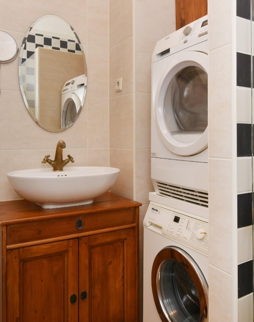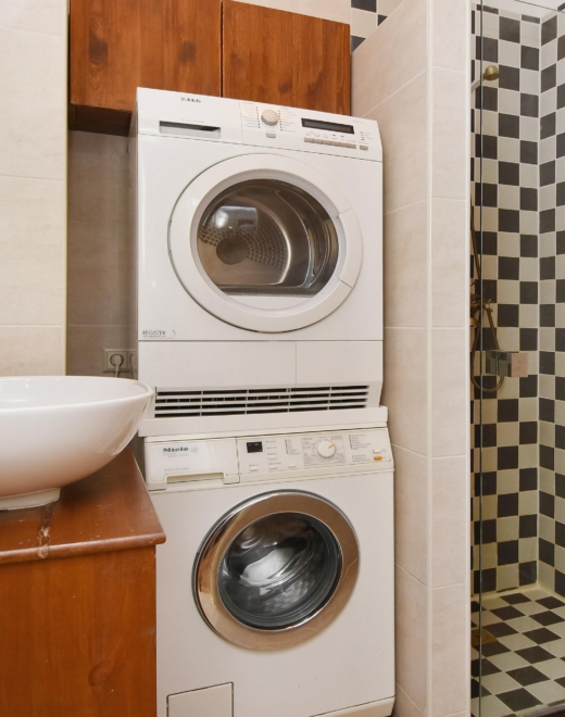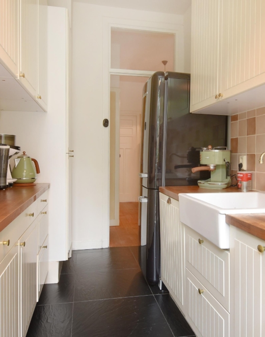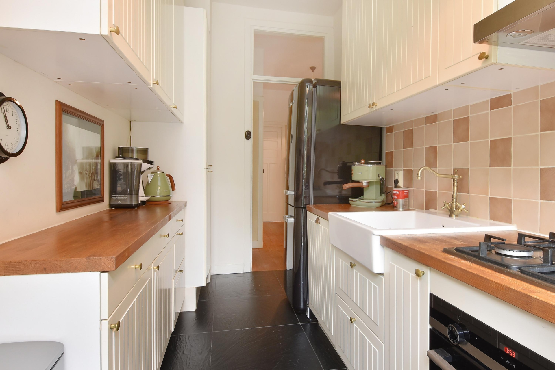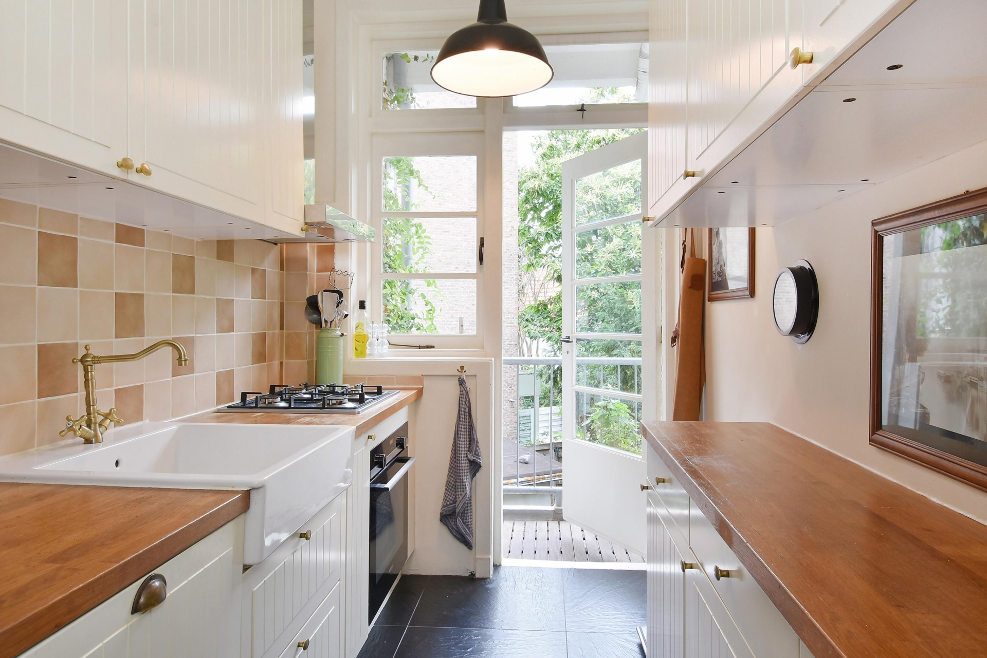 De keuken is eveneens aan de achterzijde gelegen en biedt via een deur toegang tot het balkon. De keuken is uitgerust met een vaatwasser, oven, 4-pits gasfornuis, afzuigkap en een houten werkblad.