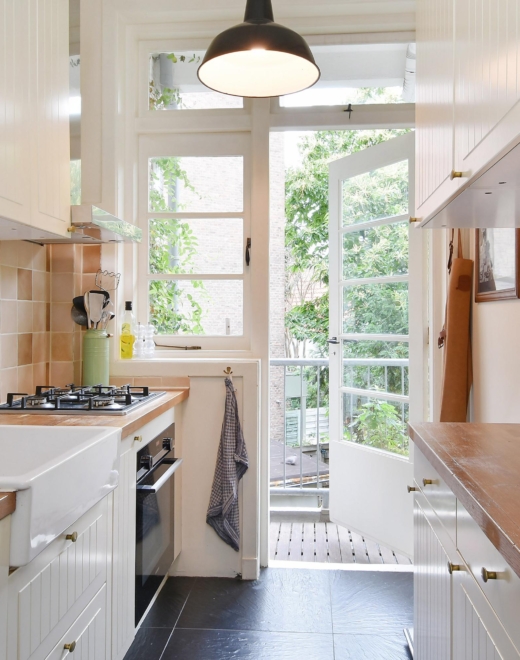 The kitchen, also located at the rear, provides access to the balcony via a separate door. The kitchen is equipped with a dishwasher, oven, four-burner gas stove, extractor hood, and a wooden countertop.