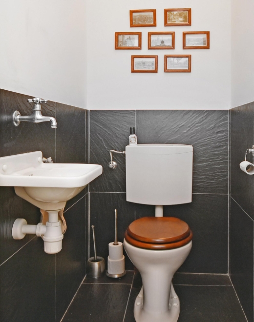 At the rear of the apartment is the spacious main bedroom, while a second generously sized bedroom is situated at the front. From the hallway you can also access the separate toilet with washbasin and the bathroom, which features a walk-in shower, washbasin, and connections for a washing machine and dryer. The hallway also includes a cloakroom cupboard.