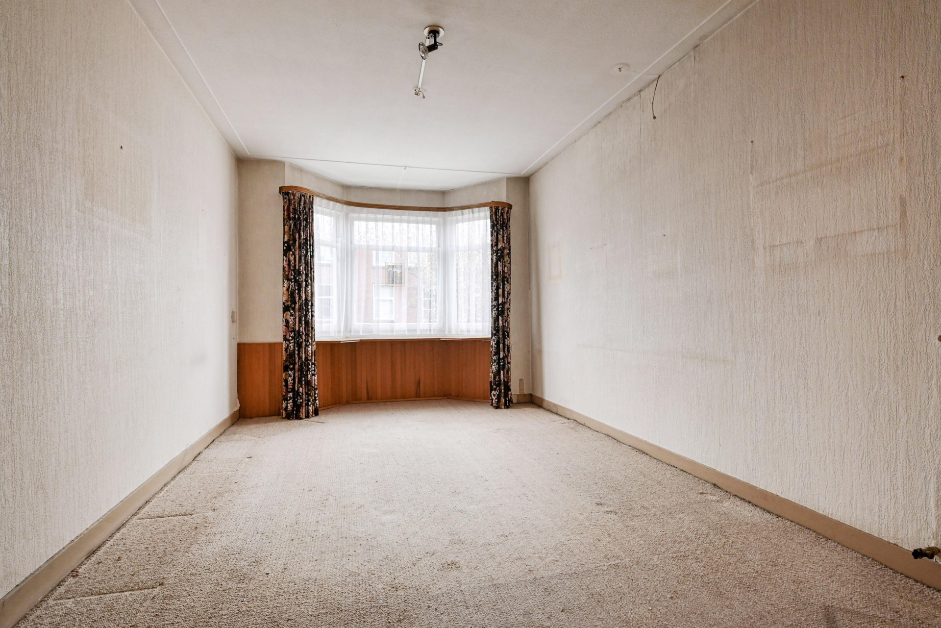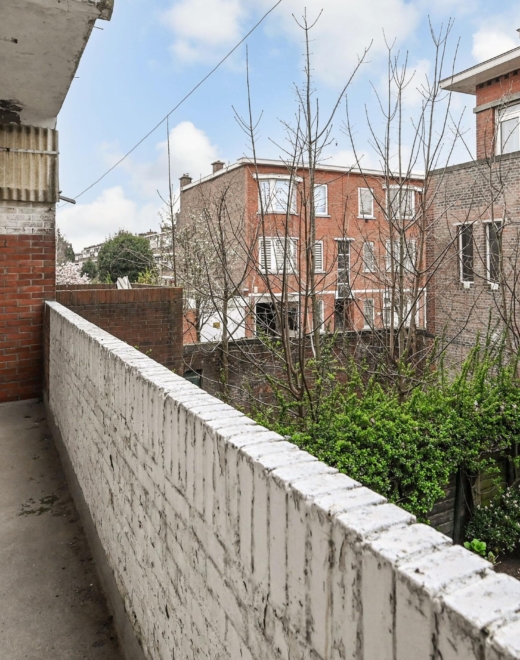 The en-suite living rooms extend from the front to the rear of the apartment and include two deep storage cupboards. A charming bay window in the front room offers expansive views over the street. The rear room has double doors opening onto a continuous, sunny southwest-facing balcony that spans the full width of the apartment. The balcony also features a utility/storage cupboard.