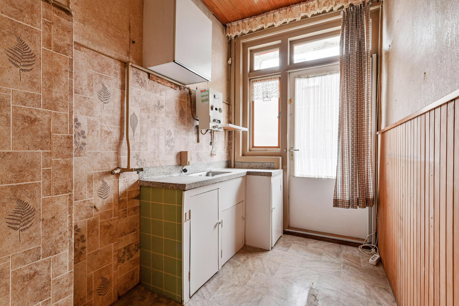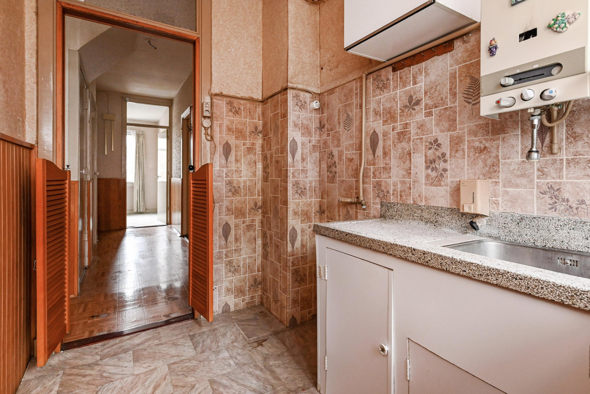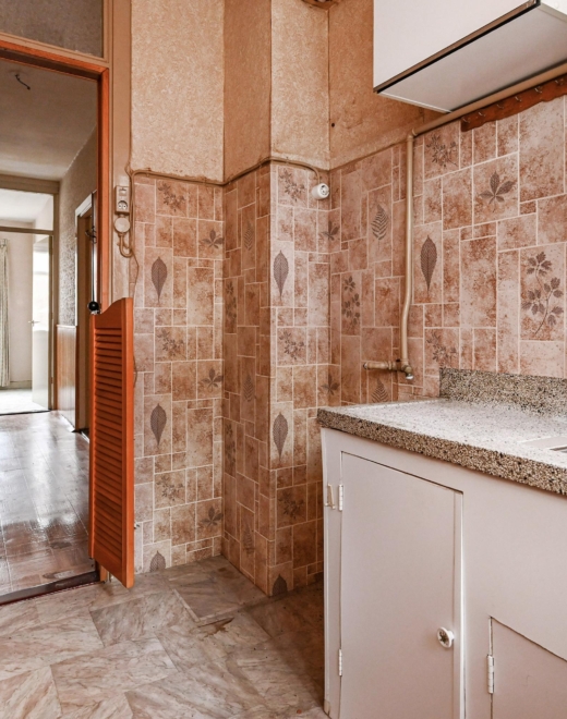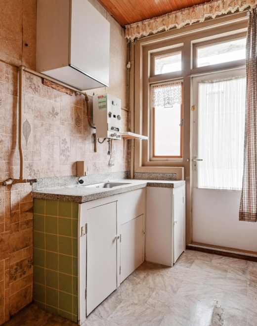 De keuken heeft een sterk gedateerde inrichting. Het keukenblok bestaat uit een granito aanrechtblad met houten kastjes. Er is een deur naar het balkon.