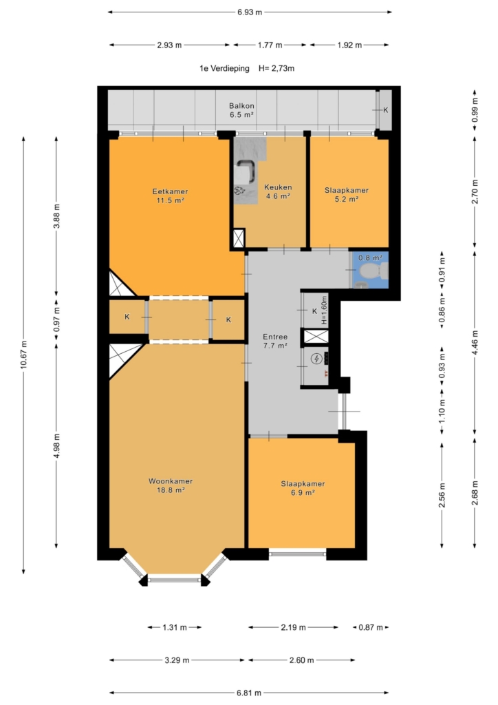 – woonoppervlakte 63 m² volgens de branchebrede meetinstructie (afgeleid van de NEN