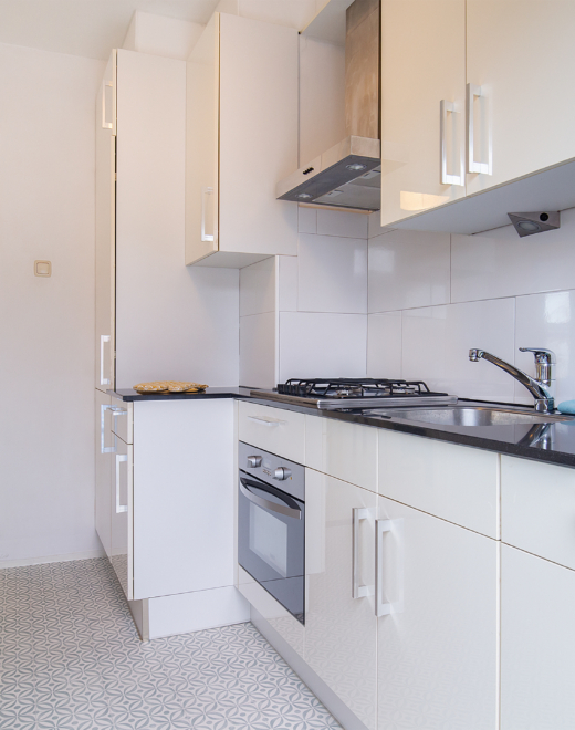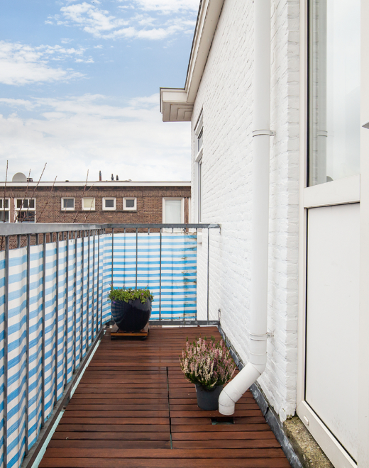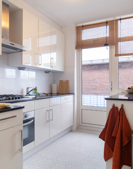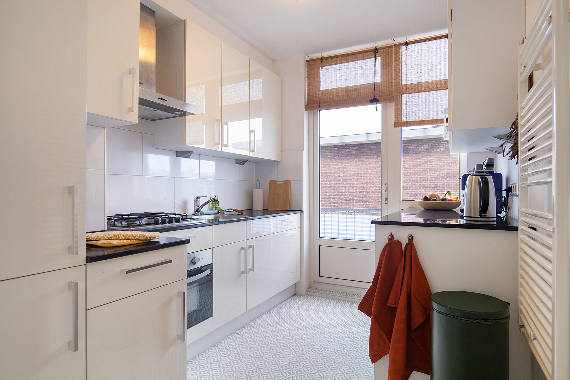 Aan de achterzijde is een moderne keuken o.a. voorzien van een 4-pits gaskookplaat, RVS afzuigkap, vaatwasser, combi oven-/magnetron, koelkast, vriezer en de aansluiting voor de wasmachine. Vanuit de keuken heb je toegang tot het zonnige balkon op het zuidoosten – een heerlijke plek om van je ochtendkoffie te genieten. De 2e grote slaapkamer vind je ook aan de achterzijde van het appartement.