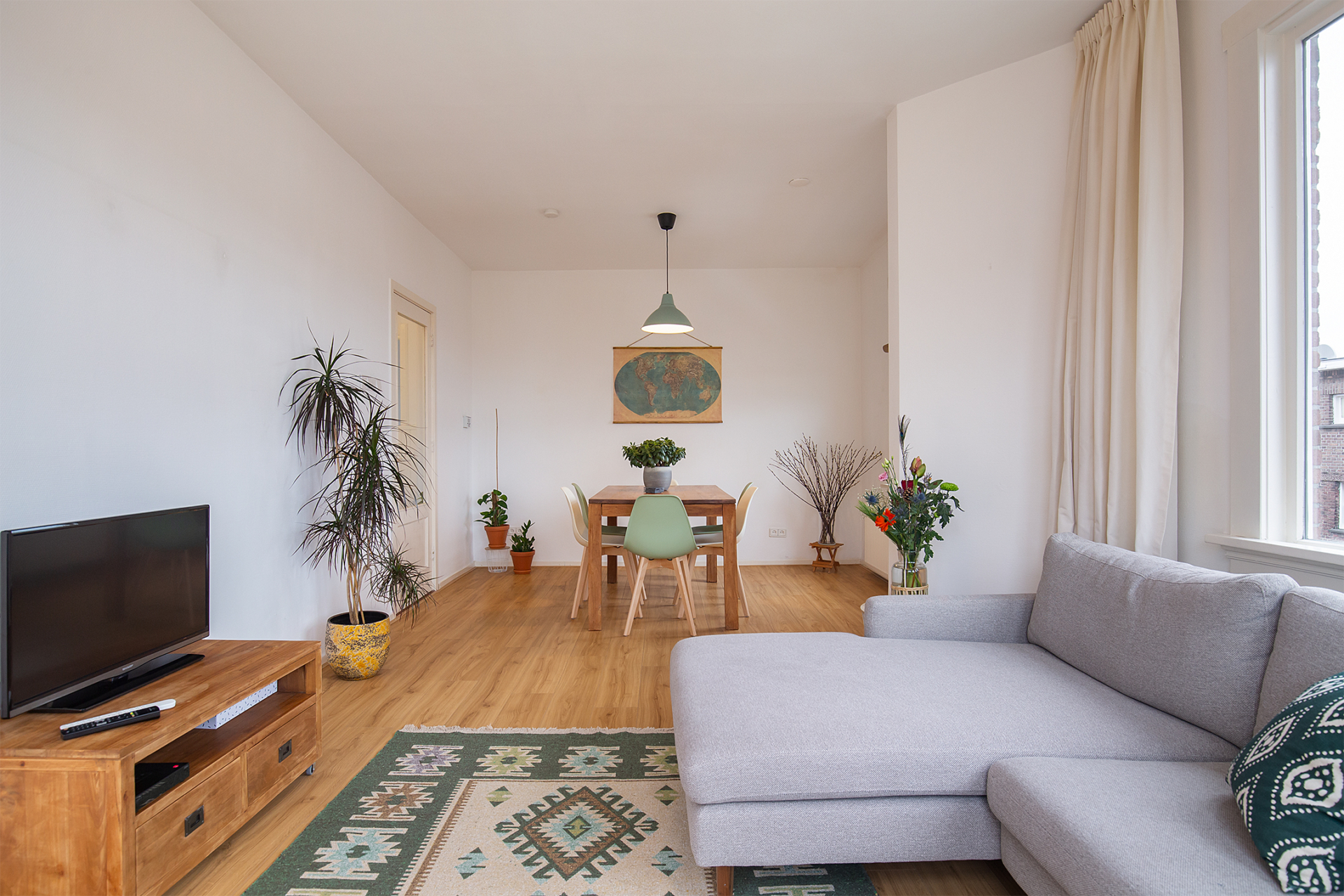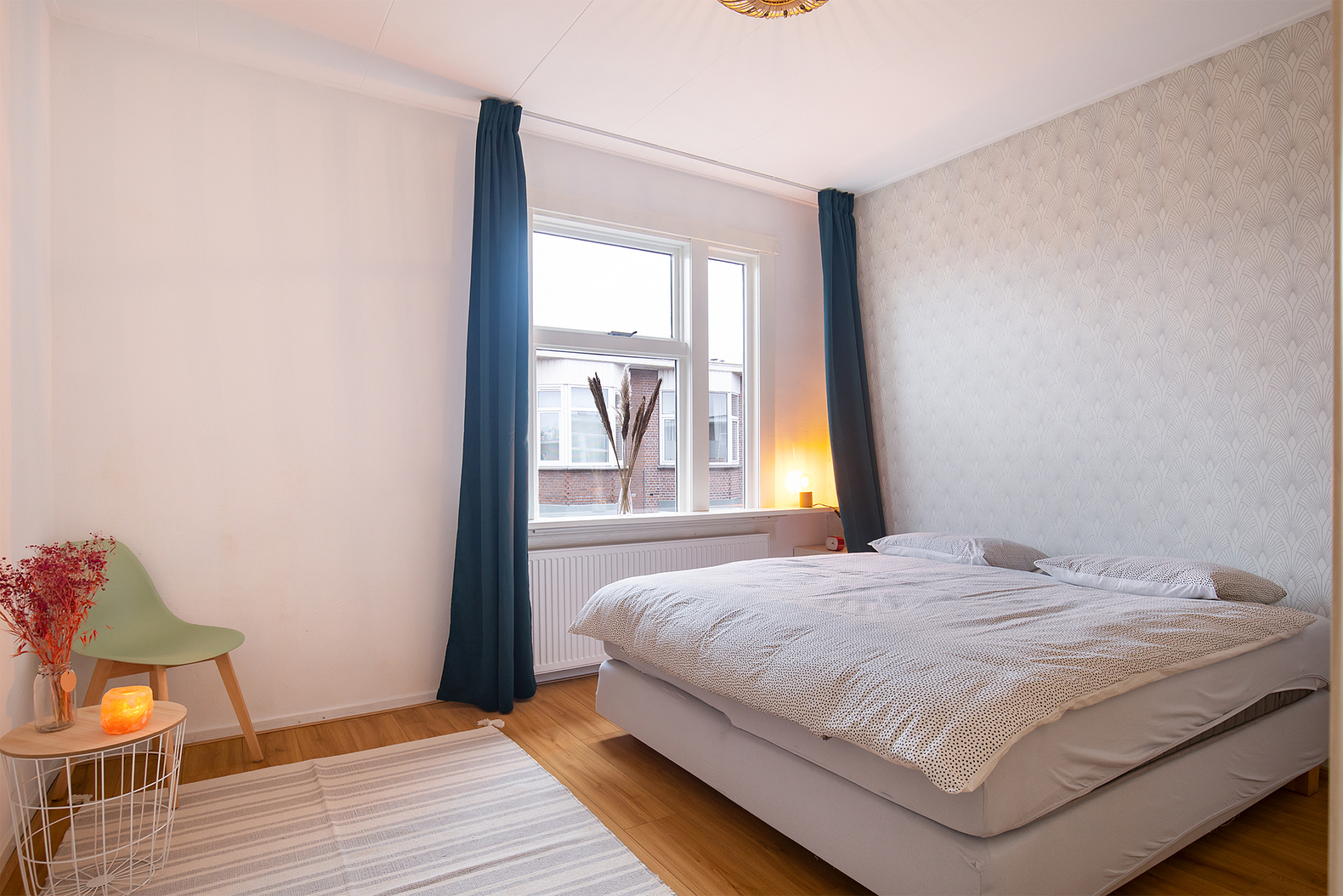 De overloop geeft toegang tot de verrassend lichte woonkamer, dankzij de fijne hoekligging. Aan de voorzijde bevindt zich een ruime slaapkamer. De moderne badkamer is voorzien van een douchecabine, een, wastafelmeubel en designradiator.