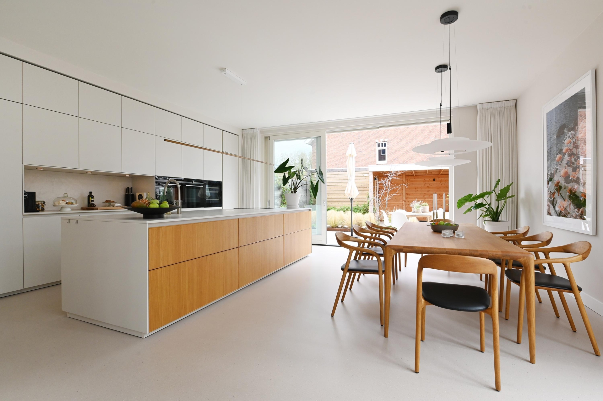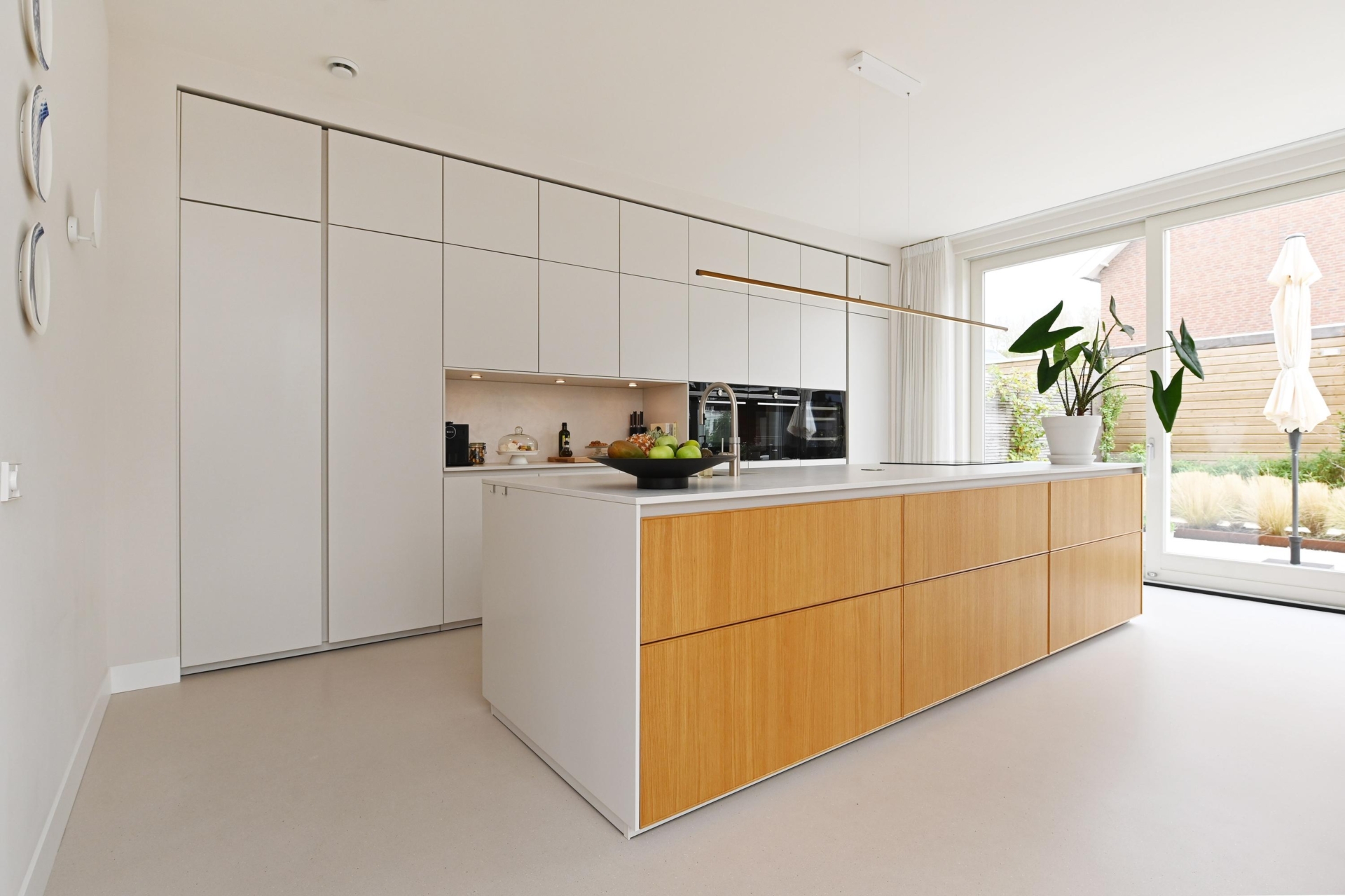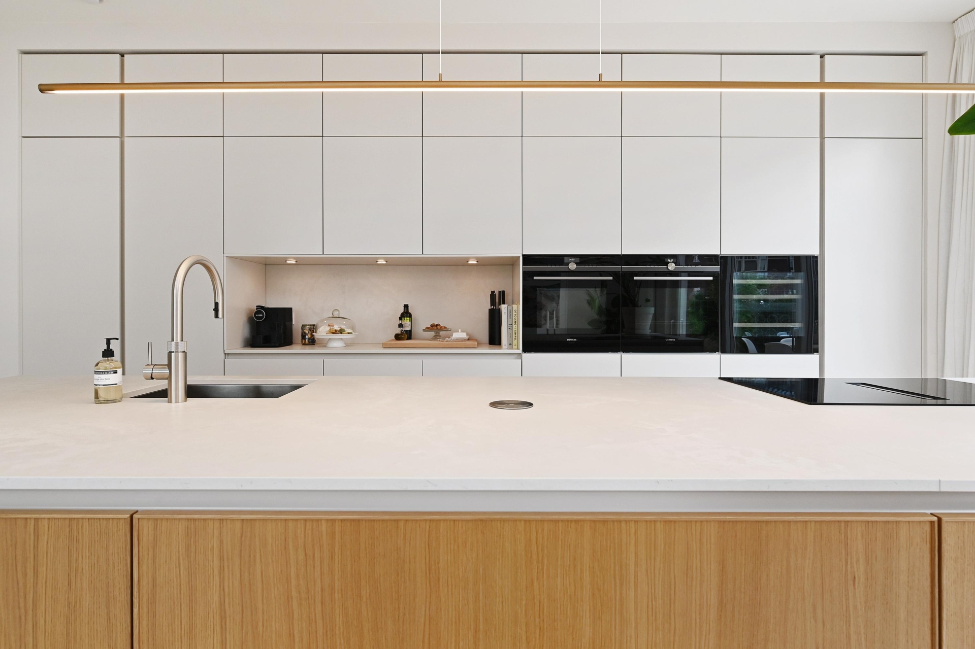 De open keuken is een waar droomobject voor elke kookliefhebber. Deze schitterende keuken van het kwaliteitsmerk 125next heeft een indrukwekkend kookeiland, eiken fronten en een aanrechtblad van composiet (Jetstone). De keuken is uitgerust met hoogwaardige apparatuur van Siemens, waaronder een grote inductiekookplaat met geïntegreerde afzuiging, twee ovens waarvan één met magnetronfunctie, een Quooker en extra ruime koel- en vrieskasten. De wijnkoelkast maakt de keuken compleet en is van het merk Dunavox. Hier wordt koken een ware beleving.